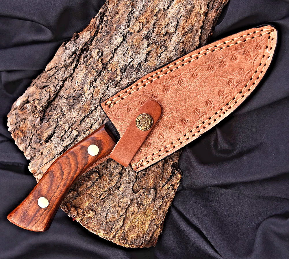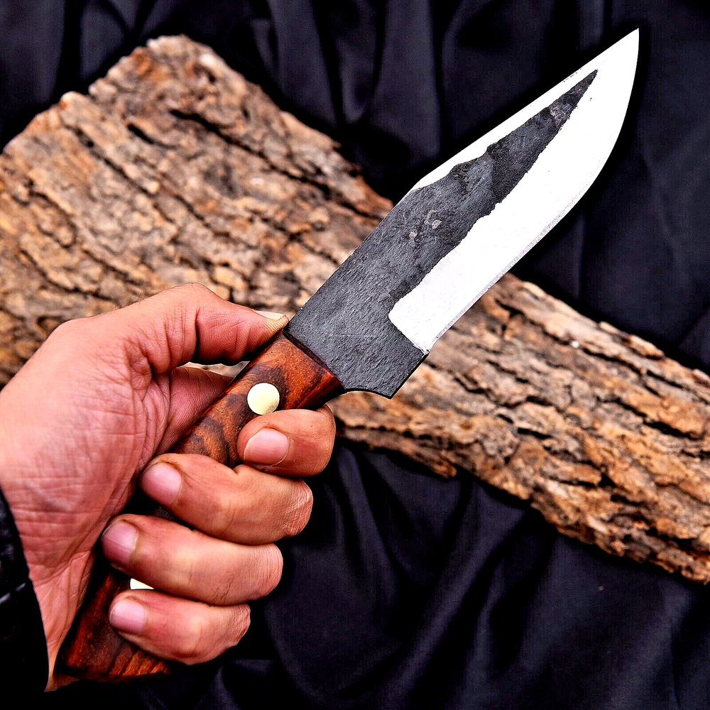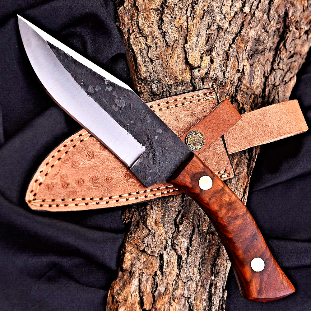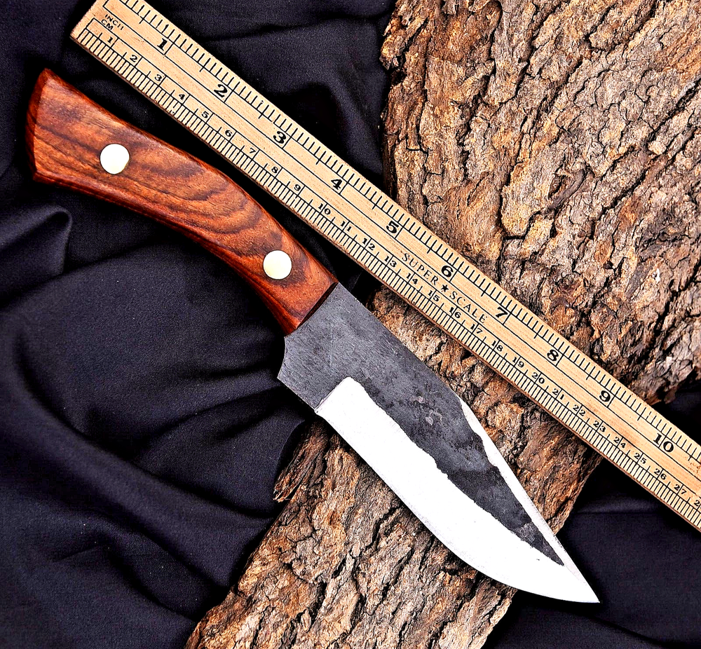 CUSTOM HAND MADE HIGH CARBON STEEL BOWIE HUNTING KNIFE Wood Handle This superb design knife is hand forged. Blade of this knife has a nice file work. Thebalance and shape of this knife ensures perfect grip. OverallLength: 10.6” Inches BladeLength: 6 ”Inches HandleLength: 4.6 ”Inches Package Includes: with Leather Sheath Warning: Keep fingers clear of blades. Store away fromchildre