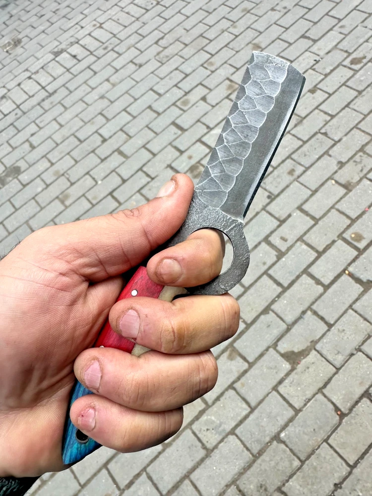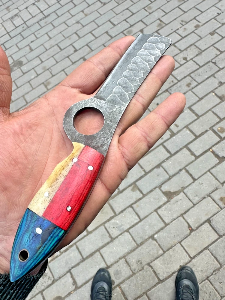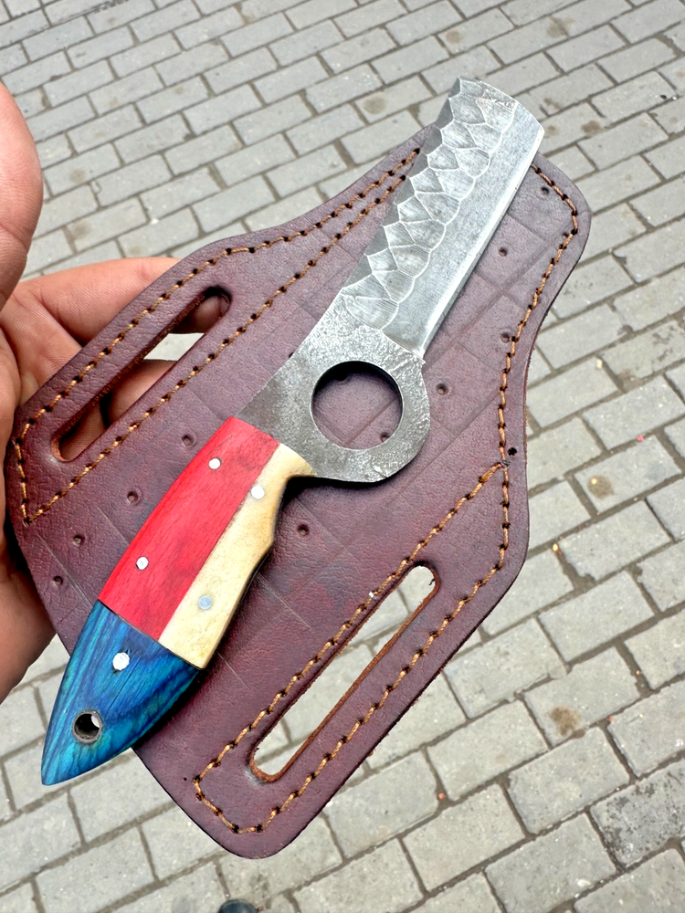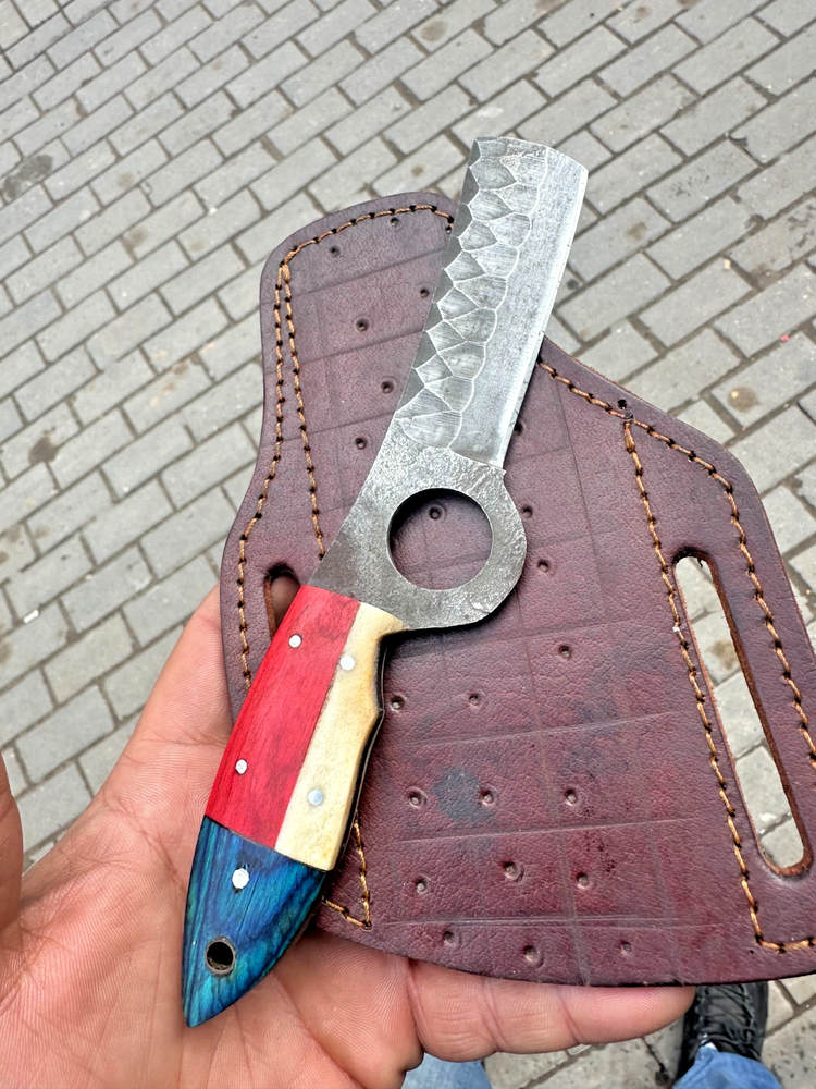CUSTOM HAND MADE HIGH CARBON STEEL BULL CUTTER KNIFE Wood Handle This superb design knife is hand forged. Blade of this knife has a nice file work. The balance and shape of this knife ensures perfect grip. Overall Length: 8"” Inches Blade Length: 4 ”Inches Handle Length: 4 ”Inches Package Includes: with Leather Sheath Warning: Keep fingers clear of blades. Store away from children.