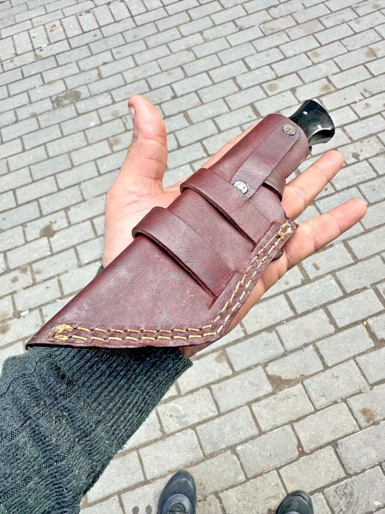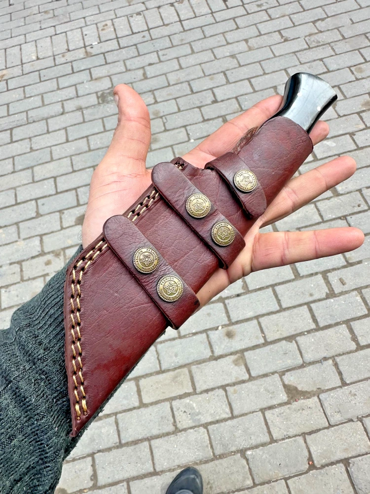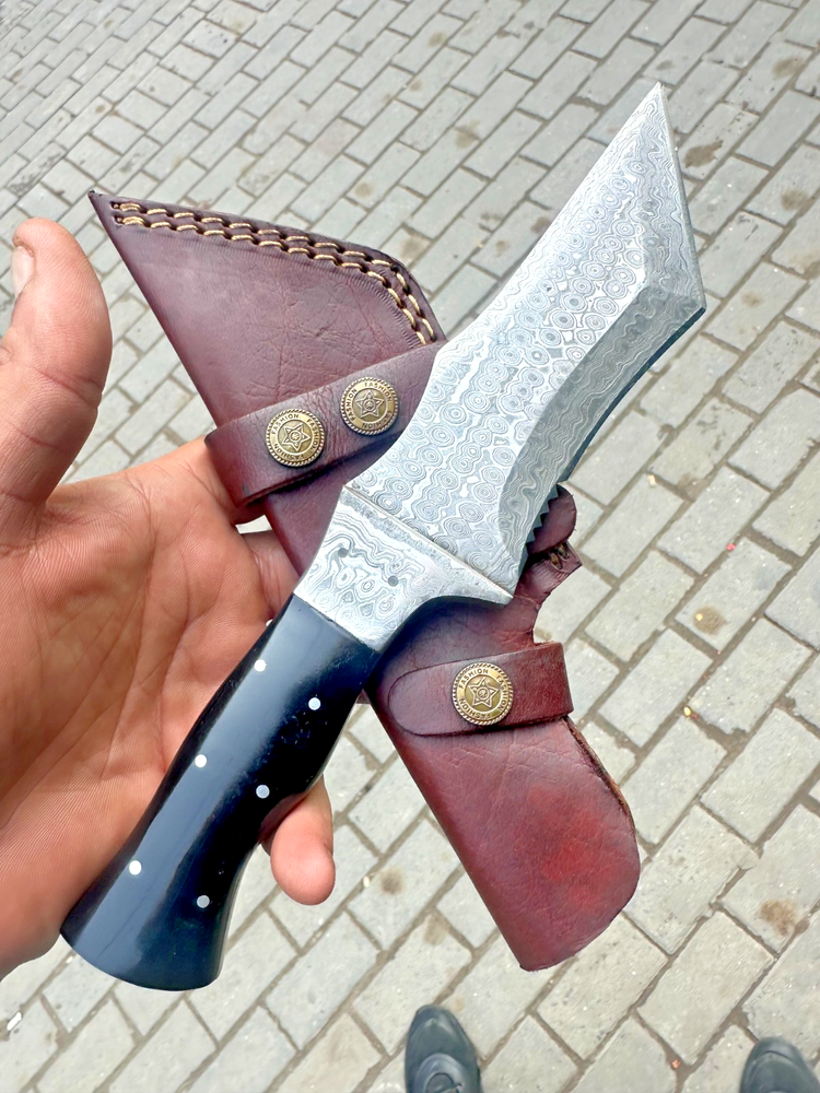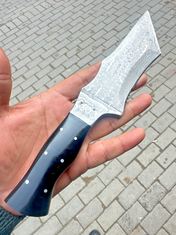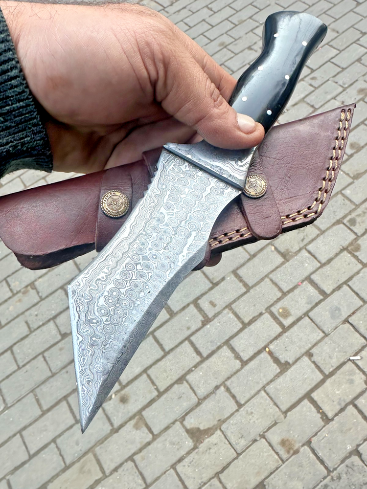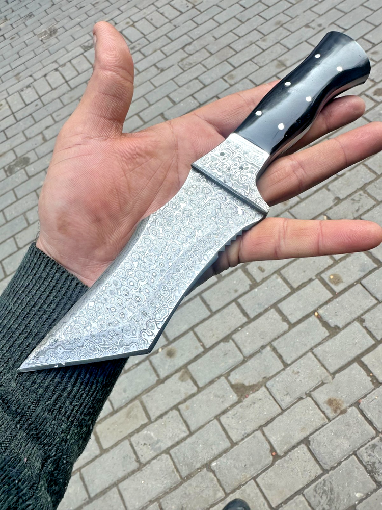 Country of Origin: United States Blade Type: Drop Point Original/Reproduction: Original Tang: Hidden, Full Dexterity: Ambidextrous Features: Sheath Included Handmade: Yes Blade Material: Damascus Steel Blade Color: Gray Type: Hunting, Survival, Damascus Knife, Skinning, Gift, Tracker knife Handle Material: Horn Blade Edge: Plain Vintage: No Blade Length: Over 5in. Brand: Damascus