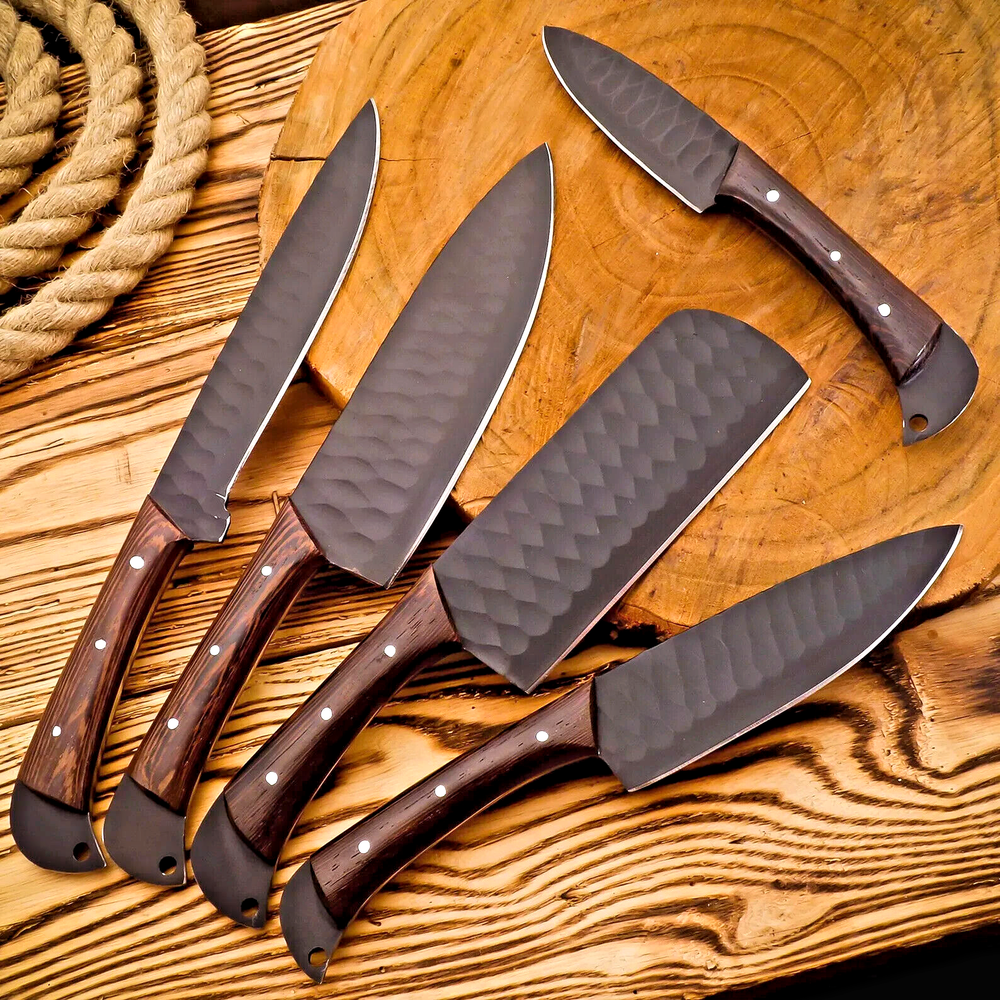 CUSTOM HAND MADE CARBON STEEL BLADE CHEF KNIFE KITCHEN KNIVES SET Wood Handle This superb design knifes is hand made. Blade of this knife has a nice file work and is made of high carbon steel and hardness 55-58 H R C . This robust knife is lab tested under intense conditions, the balance and shape of this knife ensures perfect grip. Overall Pieces : 5 Cleaver Knife : Blade 6" Inches - Handle 4.75" Inches Fillet Knife : Blade 7.25" Inches - Handle 4.75" Inches Chef Knife : Blade 6.5" Inches - Handle 4.75" Inches Paring Knife : Blade 3.5" Inches - Handle 4.5" Inches Steak Knife : Blade 4.5" Inches - Handle 4.5" Inches Package Includes: with Leather Sheath Bag Warning: Keep fingers clear of blades. Store away from children.