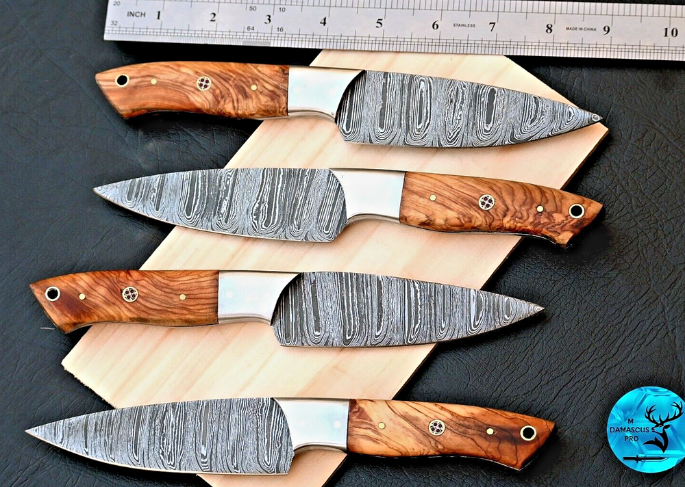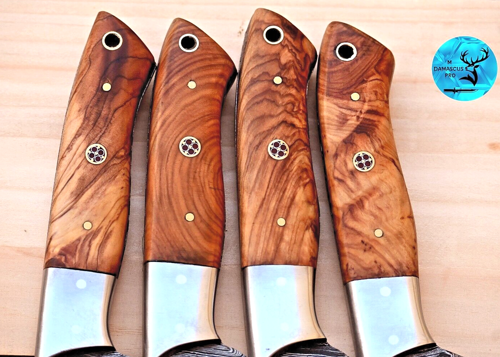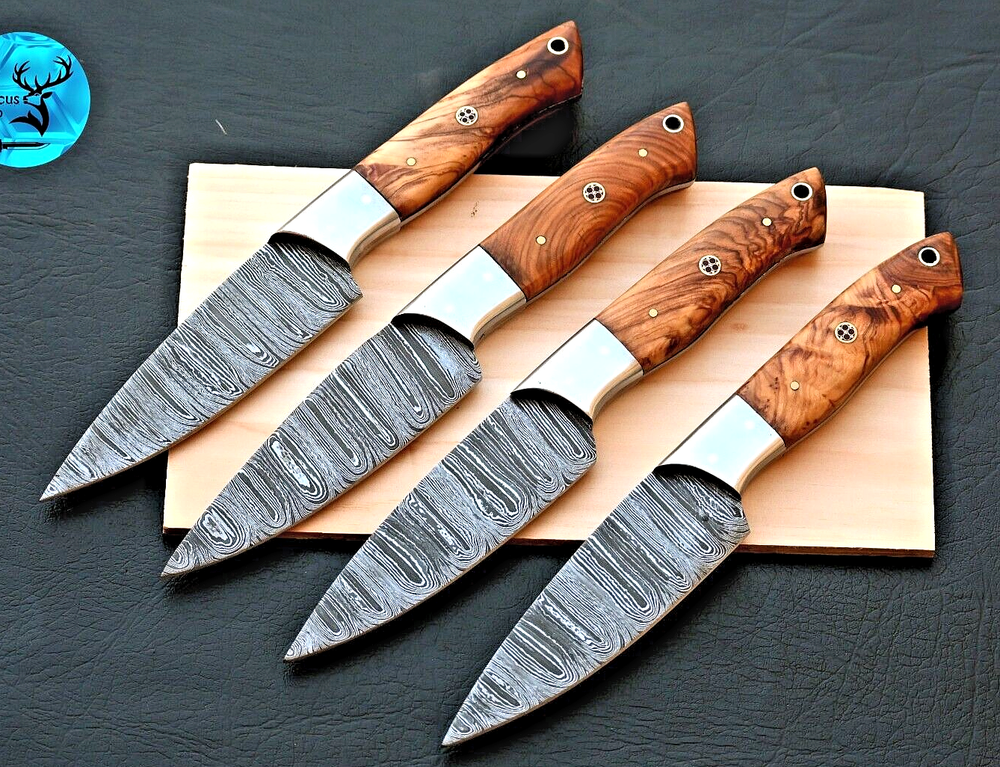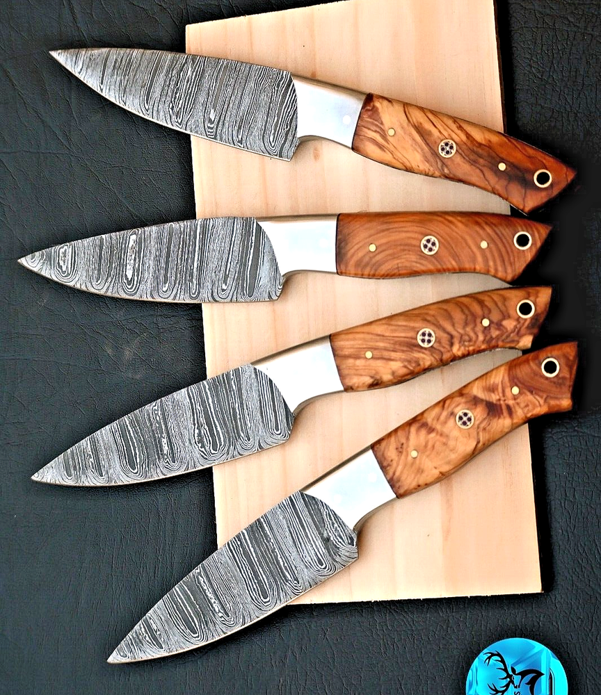 Custom Bundle: Yes Brand: Damascus Number of Items in Set: 4 Making Method: Compressor Blade Length: 4.5" INCHES MPN: N/A Material: Damascus Steel Features: With Handles Handle Material: WOOD & STEEL BOLSTER HANDLE Food Compatibility: Fruit, Universal, Vegetables Blade Edge: Straight Color: Brown Set Includes: Chef's Knife, Knife Set, Steak Knife Type: Steak Knife Personalize: No