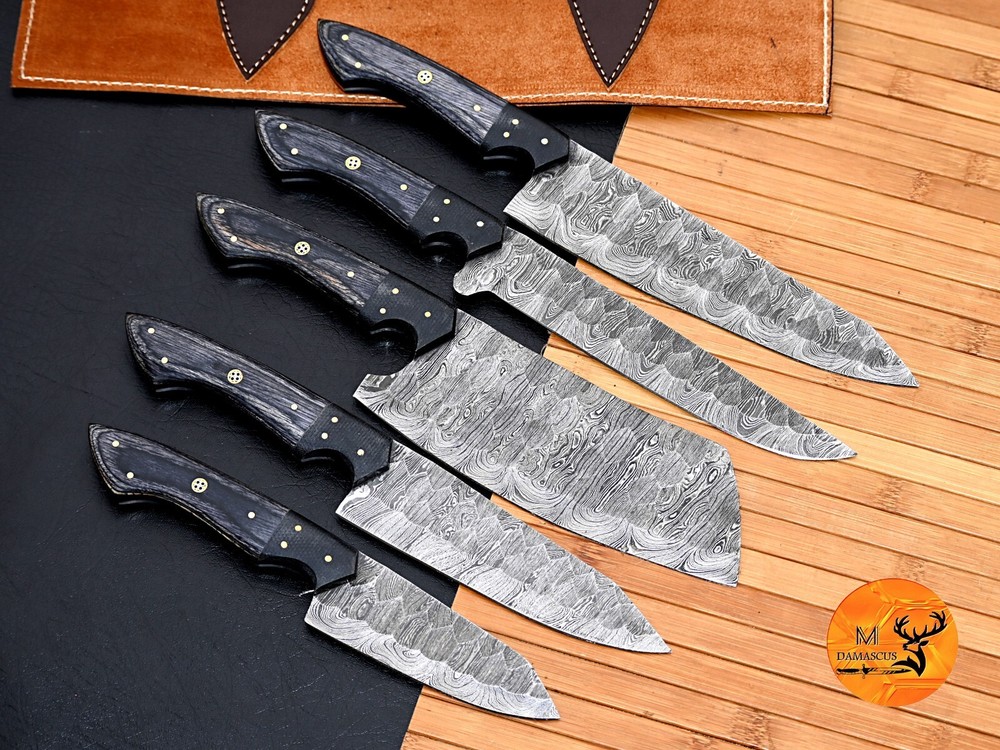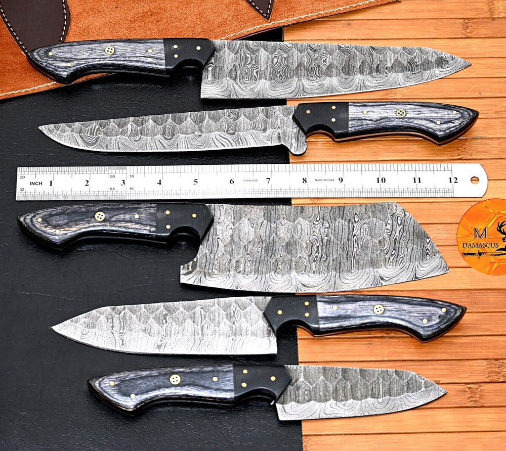 5' PCS Custom Hand Forged Damascus Steel CHEF KNIVES SET Damascus Steel: Modern pattern welded Damascus steel, 512 layers of hard higher carbon steels are welded to many layers of soft lower carbon steels. The pattern is designed, the blade is forged-welded, twisted, drilled, flattened, grounded, and forge-welded some more. The stack of steel is formed into a billet, and these billets or bars are then used to make a knife. The knife is profiled, ground, heat treated and finished with additional processes like etching and bluing to reveal the striking pattern. Blade is tempered & edge is fully sharpened. UTILITY Knife :OVERALL 13' Blade 8" Inches - Handle 5" Inches Cleaver Knife : OVERALL 10' Blade 5.5" Inches - Handle 4.5" Inches FILLET Knife : OVERALL 12' Blade 7.5" Inches - Handle 4.5" Inches CHEF Knife : OVERALL 10' Blade 5.5" Inches - Handle 4.5" Inches STEAK Knife : OVERALL 9' Blade 4.5" Inches - Handle 4.5" Inches Damascus Design: Twist Pattern Layers:512 Package Includes: with Leather Sheath Care Instructions: Keep the knife dry after each cleaning. Warning: Keep fingers clear of blades. Store away from children.