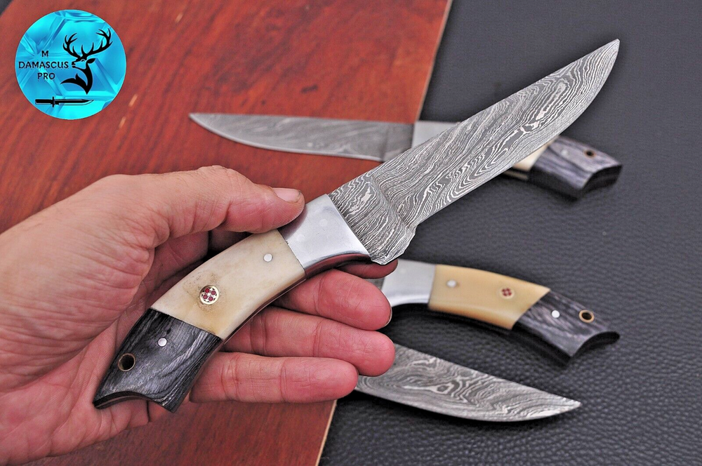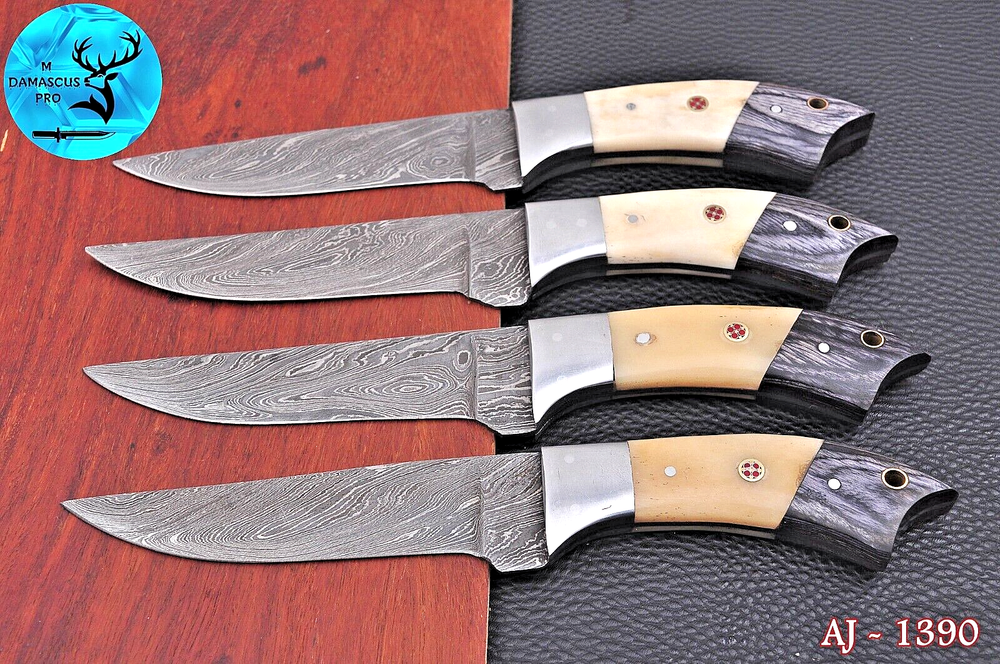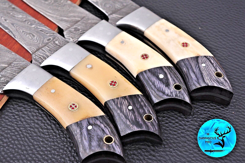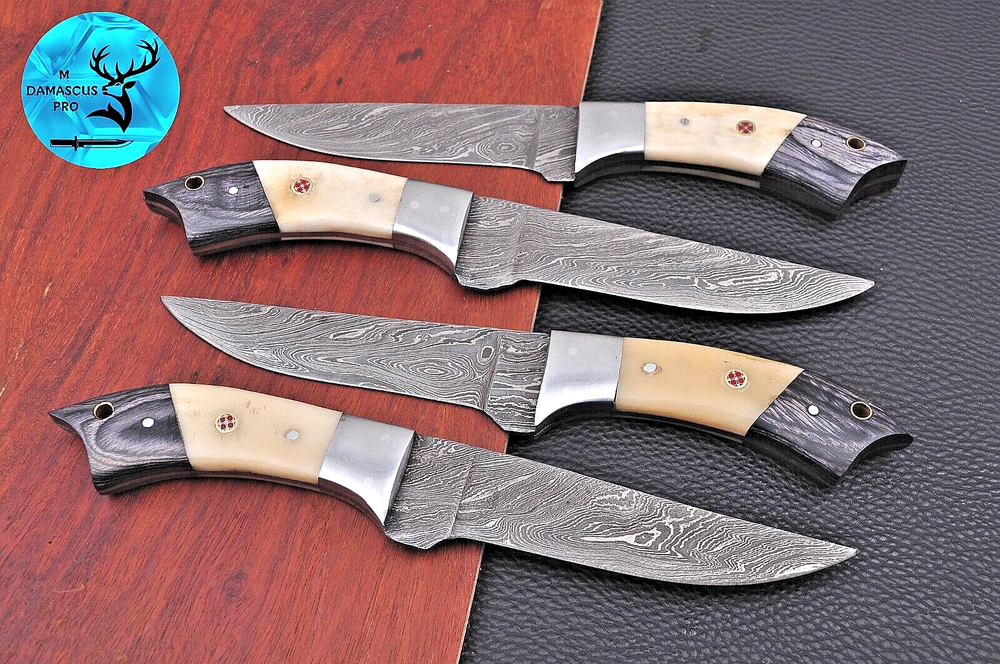 Type: Steak Knife Features: With Handles Personalize: No Blade Length: 5" INCH Handle Material: WOOD & RESIN WITH STEEL BOLSTER HANDLE MPN: N/A Blade Edge: Straight Material: Damascus Steel Food Compatibility: Vegetable, Fruit, Salad, Universal Set Includes: Chef's Knife, Knife Set, Steak Knife Brand: M DAMASCUS Number of Items in Set: 4 Color: Black