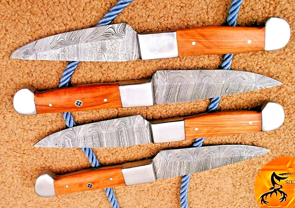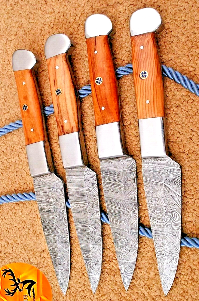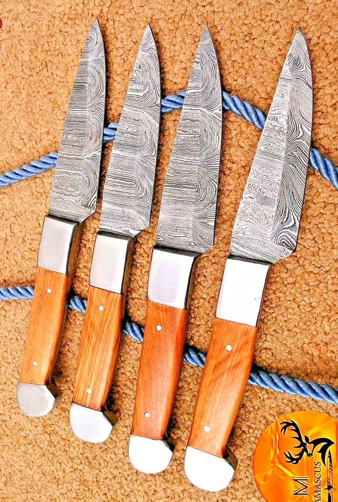 CUSTOM MADE HAND FORGED DAMASCUS STEEL KITCHEN CHEF STEAK KNIFE SET Wood & Steel Bolster Handle This superb design knife is hand forged. Blade of this knife has a nice file work and is made of 512 layers of 4340 stainless steel and 1075 high carbon steel and hardness 55-58 HRC . This robust knife is lab tested under intense conditions, the balance and shape of this knife ensures perfect grip. Overall Length: 9” Inches Blade Length: 4.25”Inches Handle Length: 4.75" Inches Damascus Design: Twist Pattern Layers: 512 Care Instructions: Keep the knife dry after each cleaning. Warning: Keep fingers clear of blades. Store away from children.