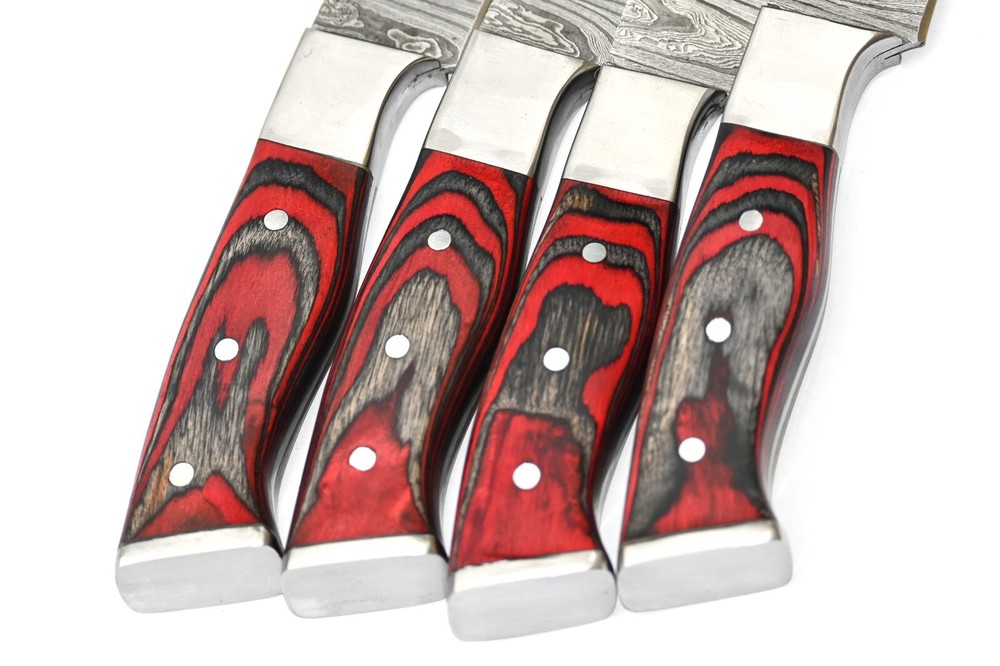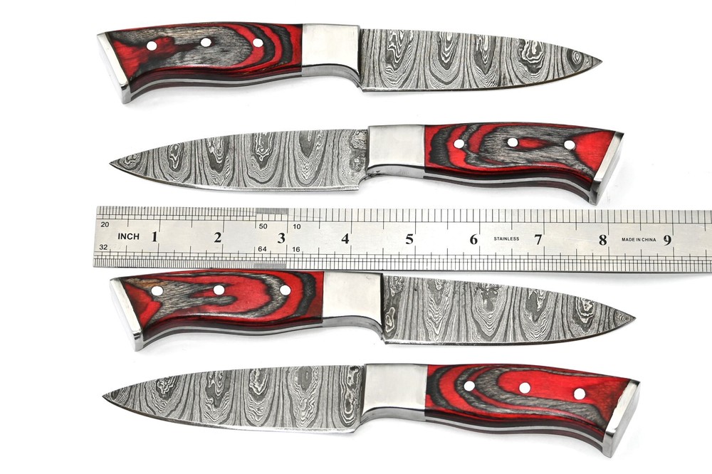 FOUR CUSTOM HAND MADE CHEF STEAK KNIFE SET HAND FORGED DAMASCUS STEEL BLADE WOOD Handle This superb design knife is hand forged. Blade of this knife has a nice file work and is made of 512 layers of 4340 stainless steel and 1075 high carbon steel and hardness 55-58 HRC . This robust knife is lab tested under intense conditions, the balance and shape of this knife ensures perfect grip. Overall Length: 9" Inches Blade Length: 5" Inches Handle Length: 4" Inches Damascus Design: Twist Pattern Layers: 512 Hardness: 55-58 HRC Warning: Keep fingers clear of blades. Store away from children.