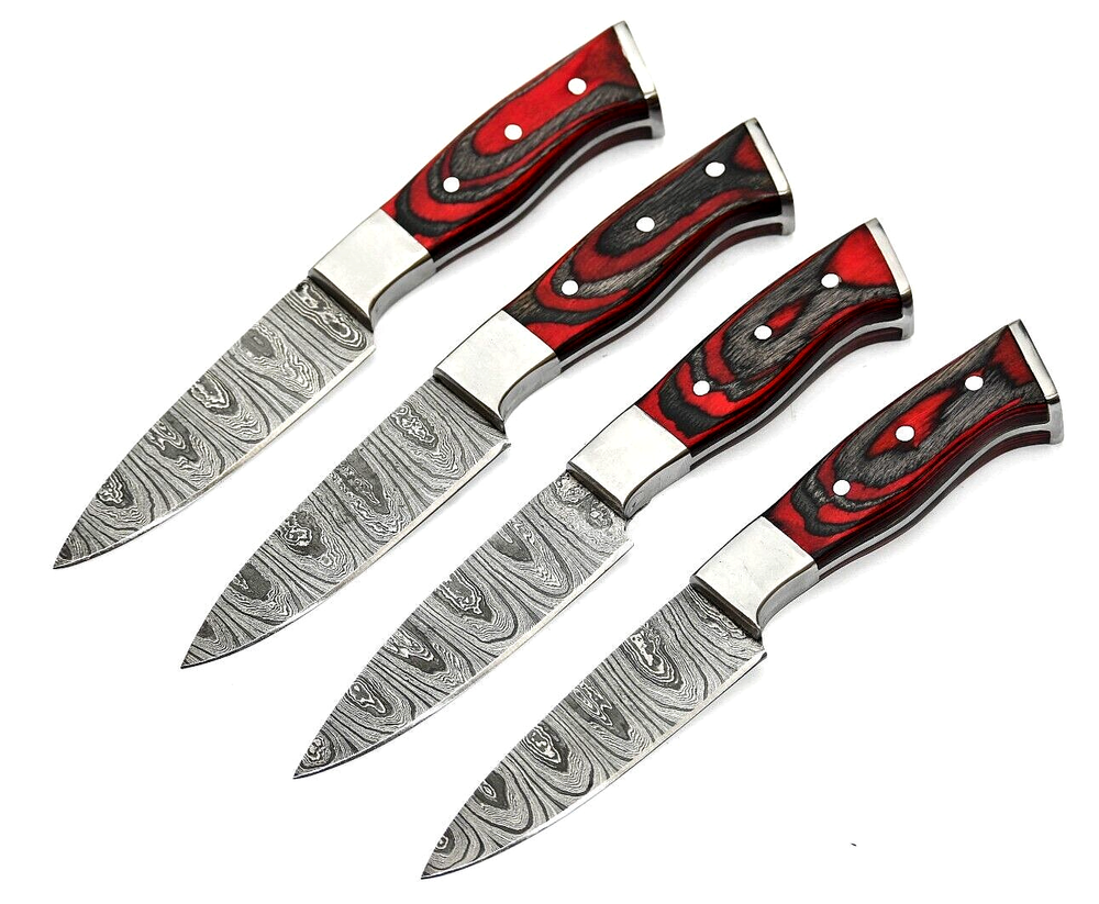 Food Compatibility: Fruit, Meat, Vegetables, Deep Fry, Universal Features: With Handles Handle Material: Wood Personalize: No Custom Bundle: Yes Type: Steak Knife Material: Damascus Steel Color: Multicolor Set Includes: Chef's Knife, Knife Set, Steak Knife, Knives Set, Kitchen, Cutlery, Gift Number of Items in Set: 4 Brand: M DAMASCUS MPN: N/A Blade Edge: Straight Blade Length: 5" INCH
