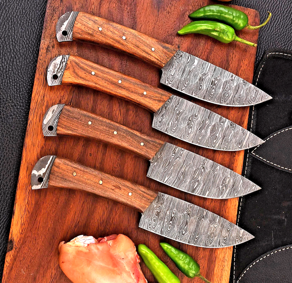 FOUR CUSTOM MADE HAND FORGED DAMASCUS STEEL CHEF STEAK KNIVES SET Wood Handle This superb design knife is hand forged. Blade of this knife has a nice file work and is made of 512 layers of 4340 stainless steel and 1075 high carbon steel and hardness 55-58 HRC . This robust knife is lab tested under intense conditions, the balance and shape of this knife ensures perfect grip. Overall Length: 9" Inches Blade Length: 5" Inches Handle Length: 4" Inches Damascus Design: Twist Pattern