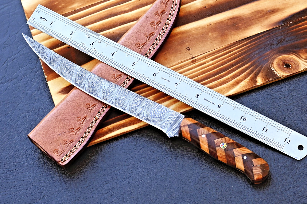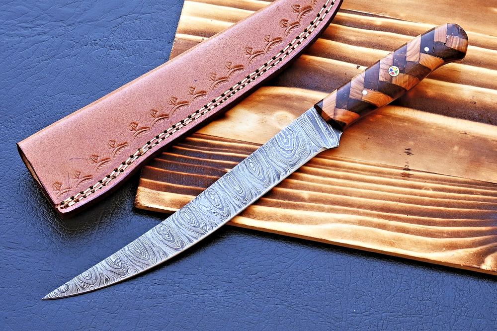 CUSTOM HAND MADE FORGED DAMASCUS STEEL BLADE FILLET FISHING KNIFE KITCHEN CHEF KNIFE Wood Handle This superb design knife is hand forged. Blade of this knife has a nice file work and is made of 512 layers of 4340 stainless steel and 1075 high carbon steel and hardness 55-58 HRC . This robust knife is lab tested under intense conditions, the balance and shape of this knife ensures perfect grip. Overall Length: 12” Inches Blade Length: 8" Inches Handle Length: 4" Inches Damascus Design: Ladder Pattern Layers: 512 Package Includes: with Leather Sheath Warning: Keep fingers clear of blades. Store away from children