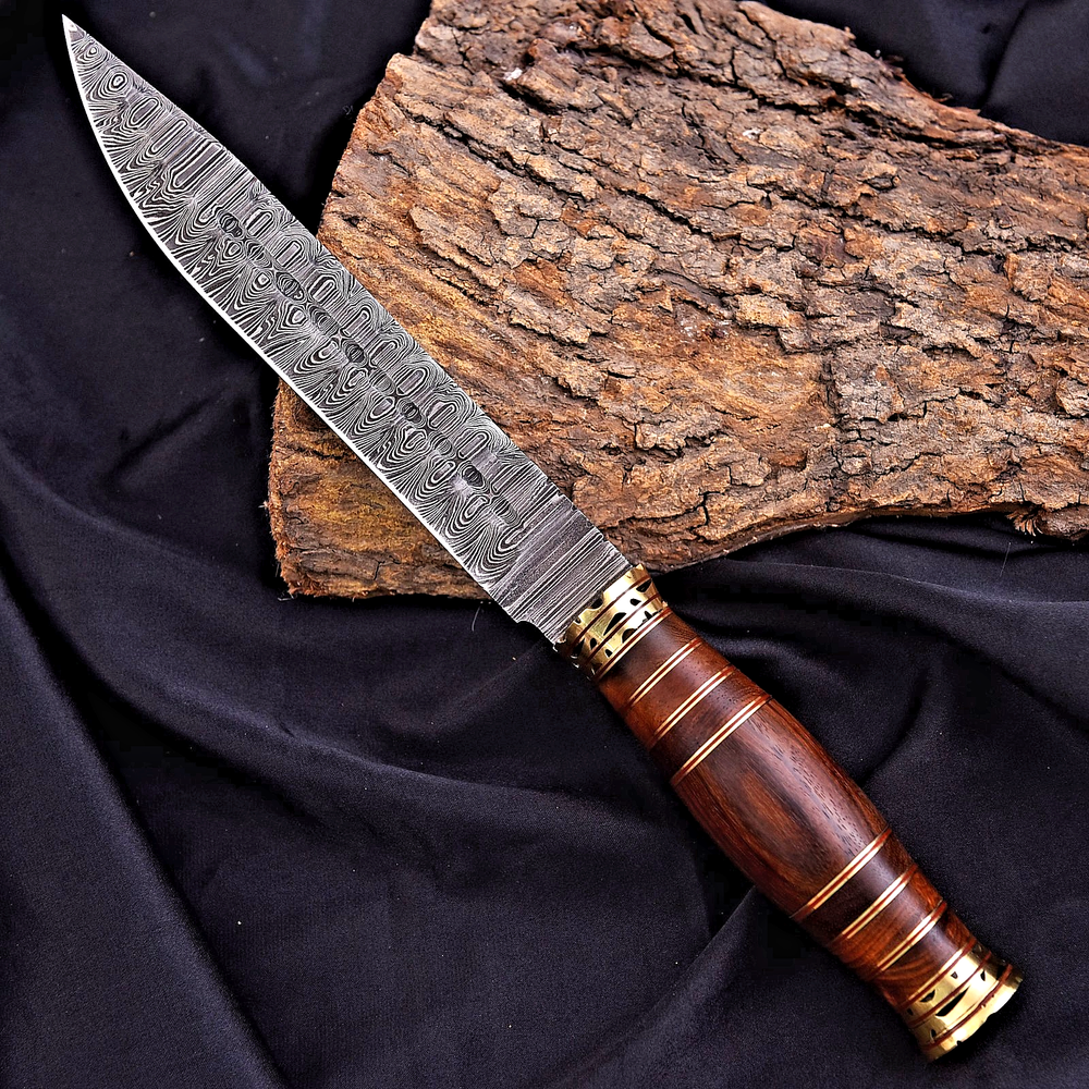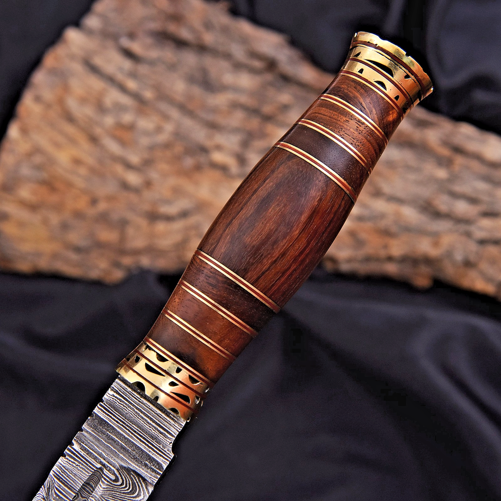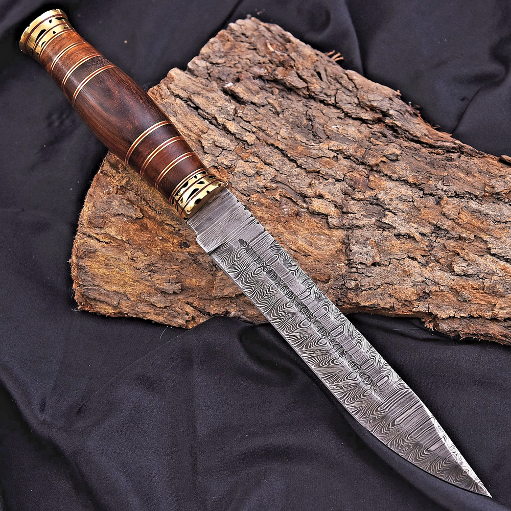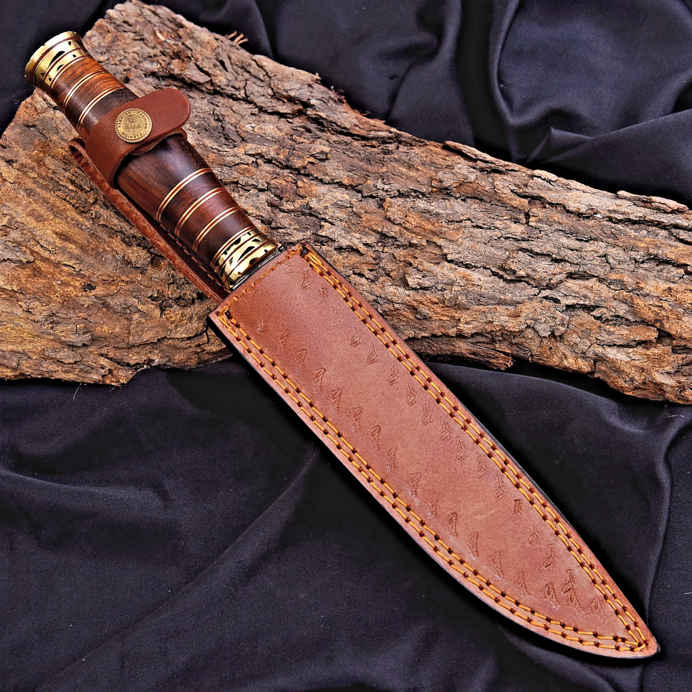 CUSTOM MADE HUNTING BOWIE SURVIVAL KNIFE HAND FORGED DAMASCUS STEEL Wood & Brass Handle This superb design knife is hand forged. Blade of this knife has a nice file work and is made of 512 layers of 4340 stainless steel and 1075 high carbon steel and hardness 55-58 HRC . This robust knife is lab tested under intense conditions, the balance and shape of this knife ensures perfect grip. Overall Length: 13" Inches Blade Length: 7.6" Inches Handle Length: 5.6" Inches Damascus Design: Twist Pattern Layers: 512 Hardness: 55-58 HRC Package Includes: with Leather Sheath Warning: Keep fingers clear of blades. Store away from children.