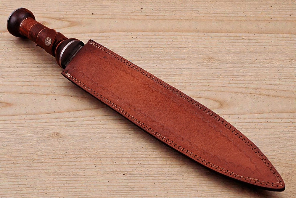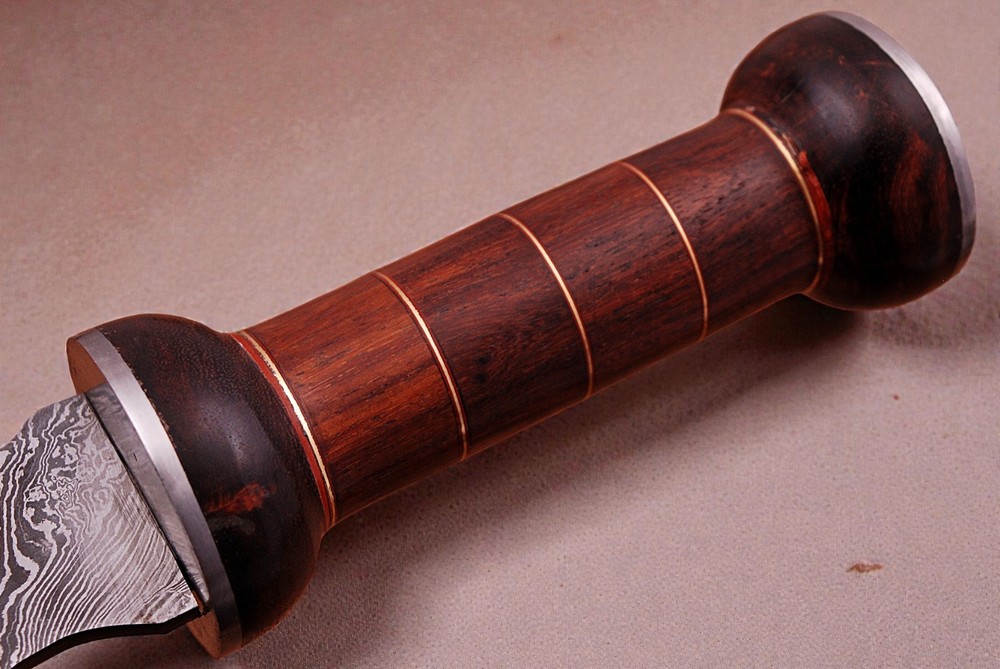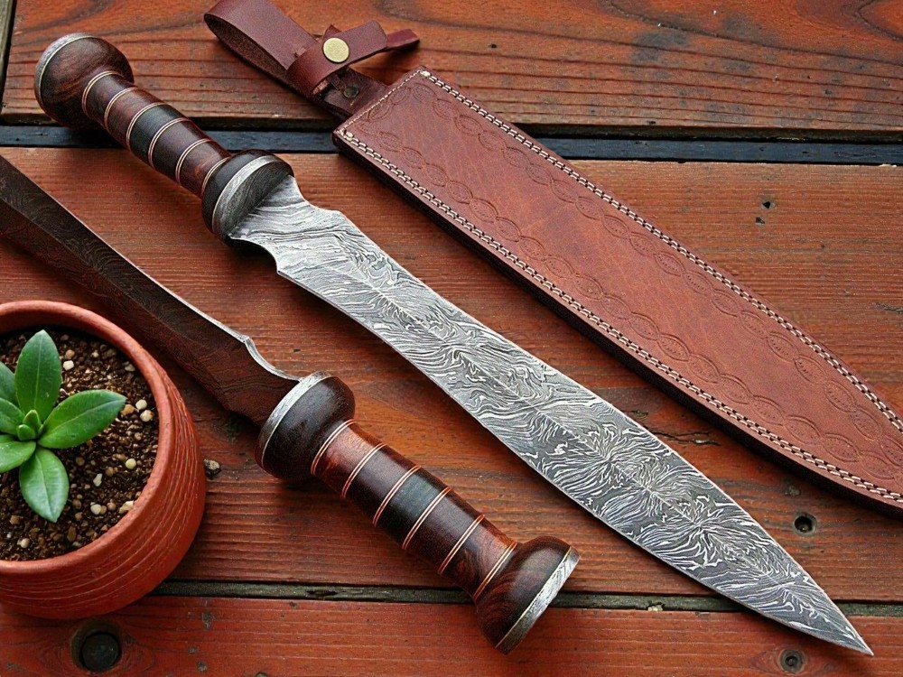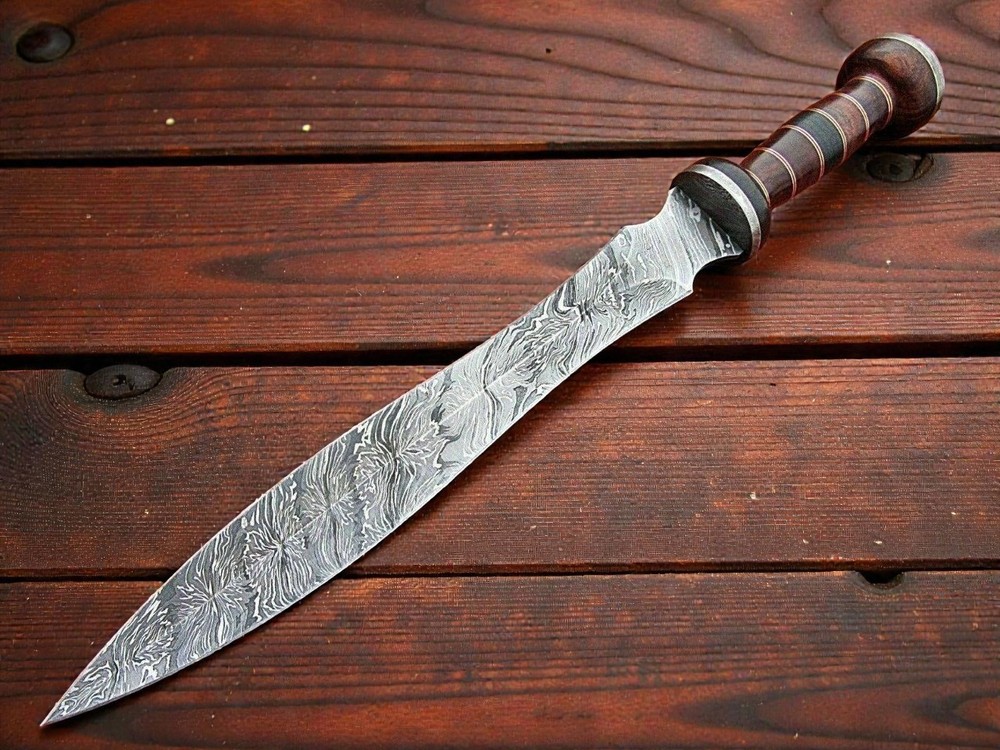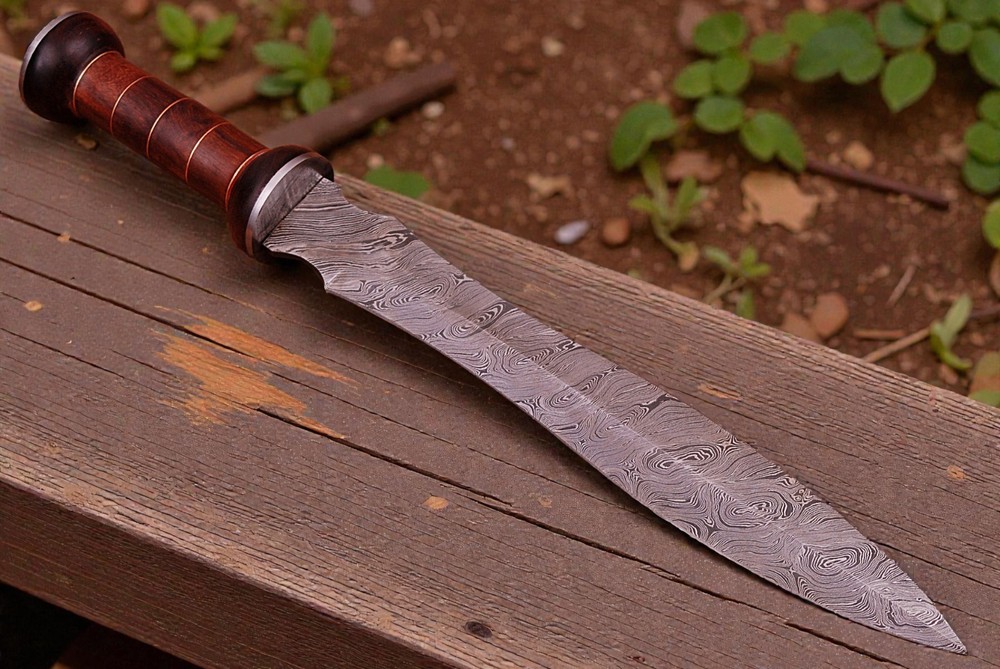 CUSTOM HAND MADE FORGED DAMASCUS STEEL SWORD Wood & Damascus Steel Bolster Handle This superb design Sword is hand forged. Blade of this Sword has a nice file work and is made of 512 layers of 4340 stainless steel and 1075 high carbon steel and hardness 55-58 HRC . This robust Sword is lab tested under intense conditions, the balance and shape of this Sword ensures perfect grip. Overall Length: 19” Inches Blade Length: 13.5” Inches Handle Length: 5.5” Inches Damascus Design: Twist Pattern Layers: 512 Package Includes: with Sheath Warning: Keep fingers clear of blades. Store away from children.