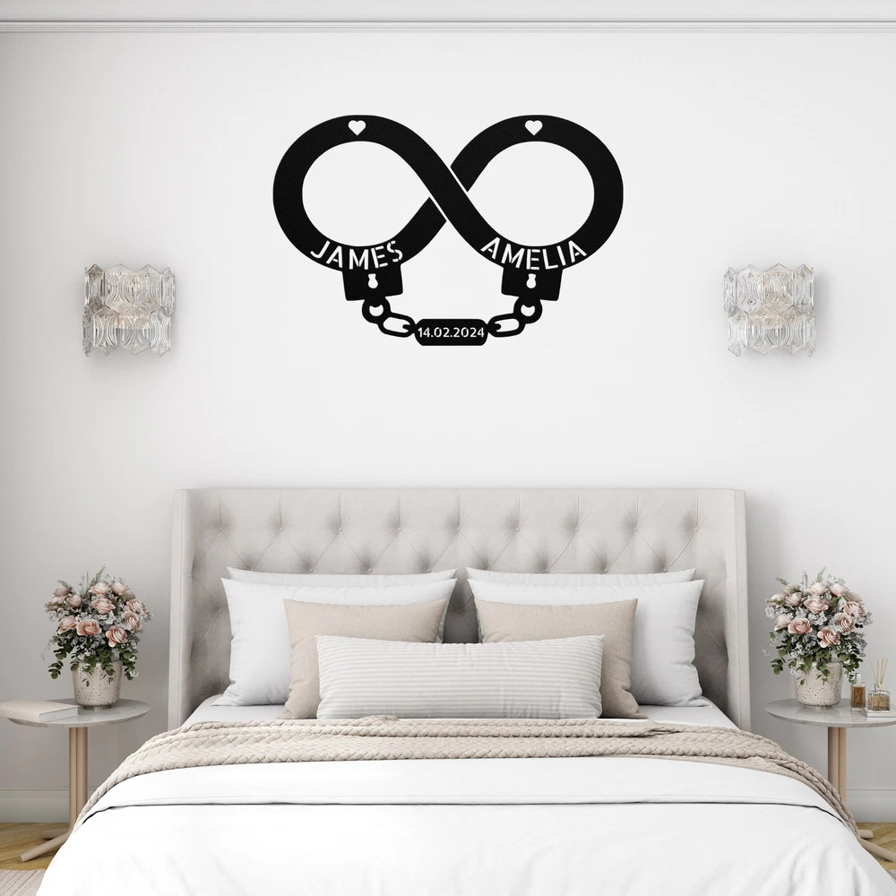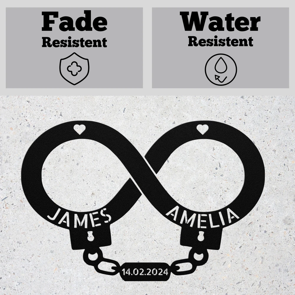 Product Description Custom Handcuff Infinity Metal Sign Birthday or Valentines Day Gift for Couples Celebrate your love with our Personalized Handcuff Infinity Metal Sign ! This custom wall art is perfect for couples, adding a meaningful and stylish touch to your home or office. Made from high-quality 16-gauge metal, this sign features a durable powder coating that protects it from dust, weather, and water, ensuring it looks great both indoors and outdoors. Looking for a special gift? This personalized metal sign is an excellent choice for Christmas, birthdays, anniversaries, or any special occasion. It’s a unique way to express your commitment and make any space feel more romantic. Key Features: Customizable Design : Personalize the sign with your names or a special date. Durable Material : Crafted from 16-gauge high-quality metal for lasting beauty. Weather-Resistant : Powder-coated finish protects against dust, rain, and rust. Versatile Decor : Suitable for both indoor and outdoor display. Great Gift Idea : A heartfelt present for any couple celebrating their love. Show off your unique bond or surprise a loved one with this charming metal sign. Order yours today and add a personal touch to your decor! Service and Color Choice Our metal signs are designed to be personalized just for you, making them the perfect addition to any space! The default color for our signs is Black , but we also offer a variety of beautiful options including Copper, Gold, White, and Silver . After placing your order, simply contact us with your preferred color choice, and we'll ensure your sign is exactly how you envision it. Let’s create something special together!