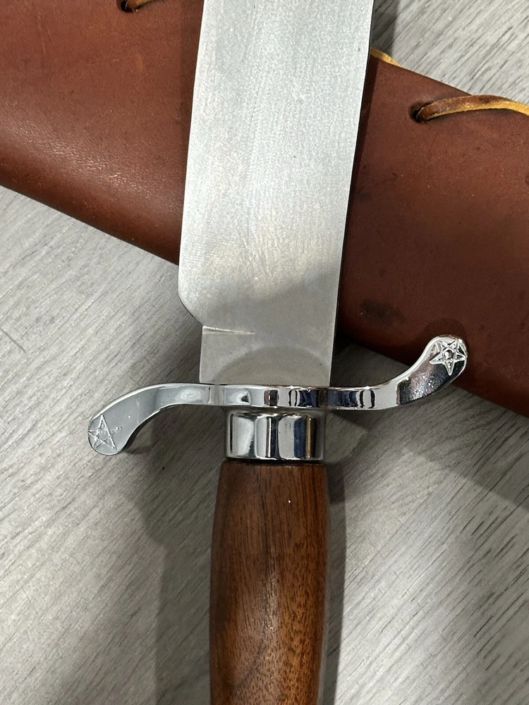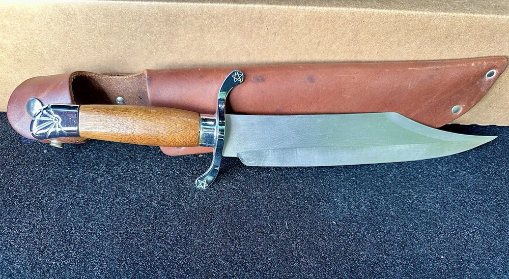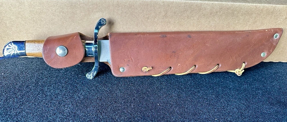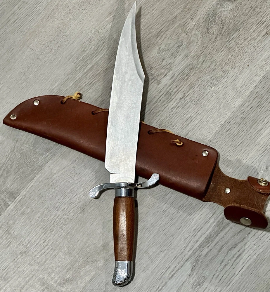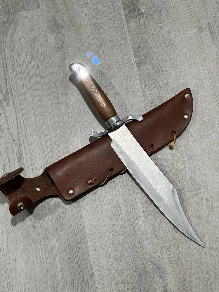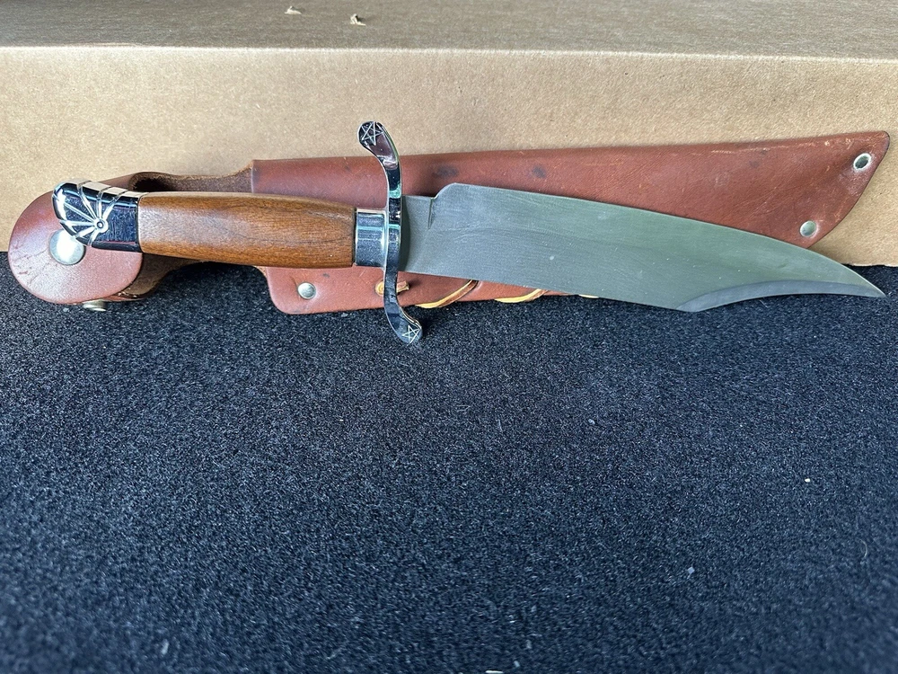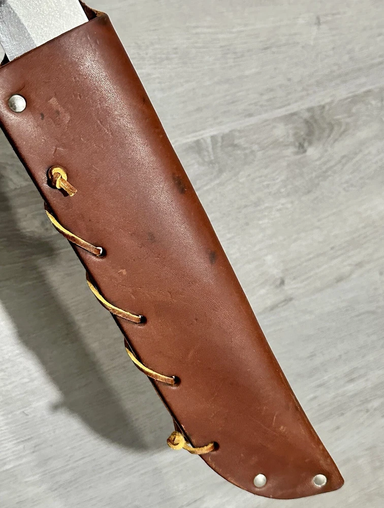 A custom handmade bowie knife with custom handmade leather sheath. I have had this a while, but its been kept in new condition. Unsure of maker this was given to me as a gift about 15 years ago. It comes with a cowhide hand crafted sheath. The blade has not been sharpened. I ship quick! Thanks