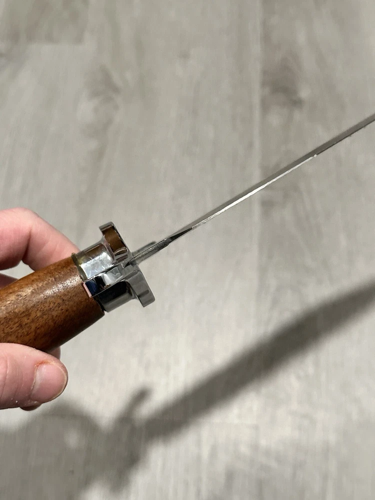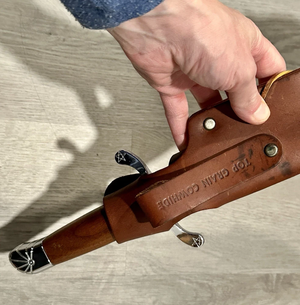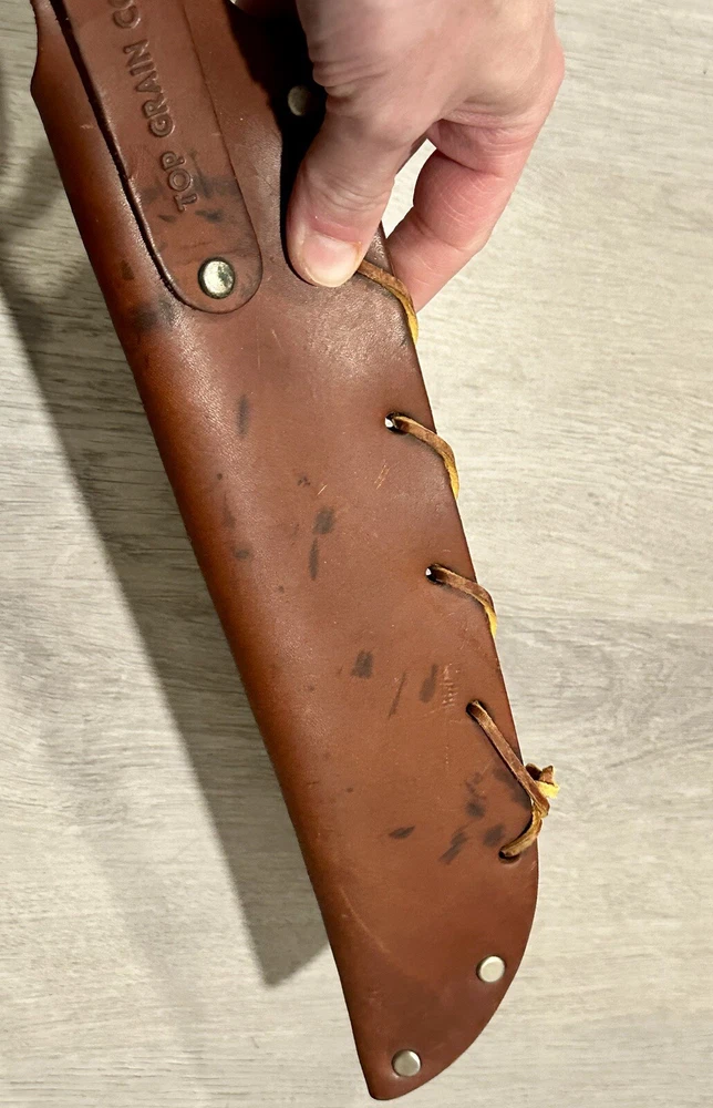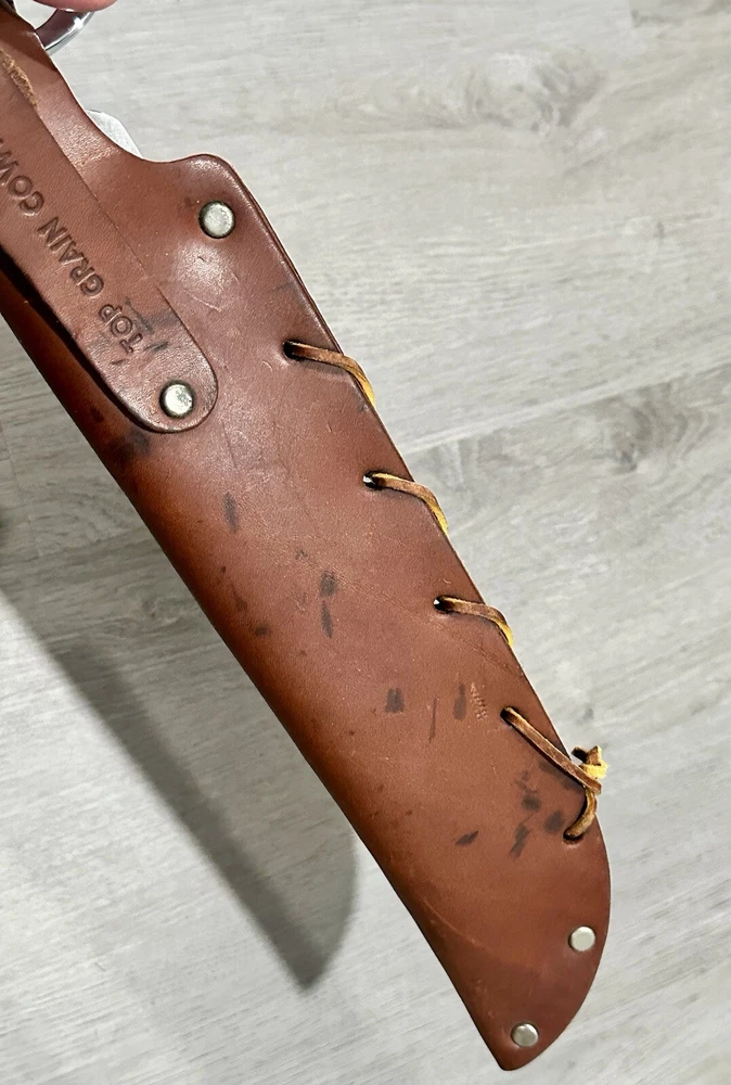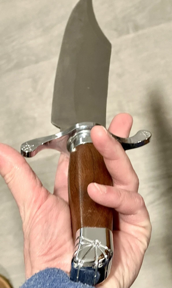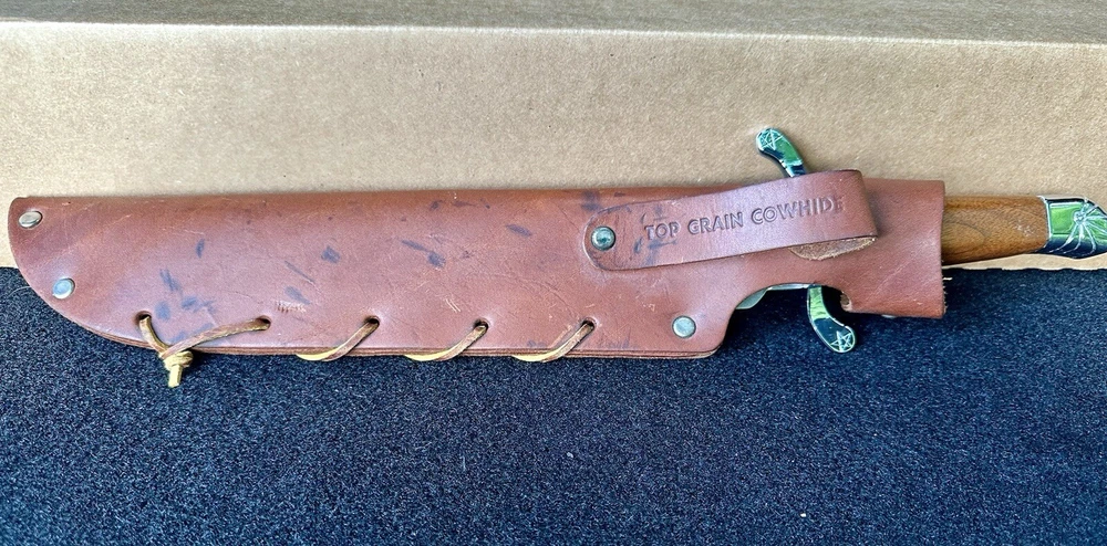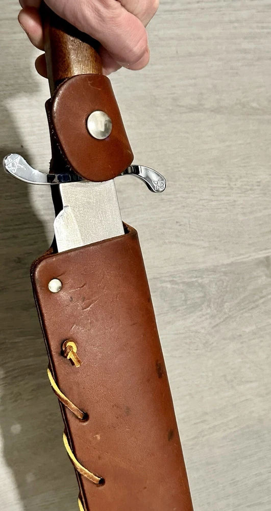 A custom handmade bowie knife with custom handmade leather sheath. I have had this a while, but its been kept in new condition. Unsure of maker this was given to me as a gift about 15 years ago. It comes with a cowhide hand crafted sheath. The blade has not been sharpened. I ship quick! Thanks