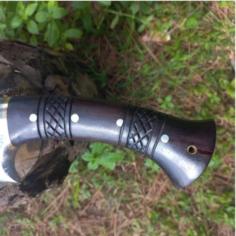 Item details Highlights Made by HAFIZ CRAFTS Supplies for making crafts Materials: Blade material: Carbon steel Specifications: Blade length: 12 inches Handle length: 7 inches Belly length: 2.5 inches inches Overall length: 19 inches Blade Weight: 976 grams Overall Weight: 1426 grams Material Used: High-Grade Carbon Steel (Car & Jeep Spring Leaf), Rosewood Handle Type : Full tang Overall Length: Approximately 19 inches from Blade Tip to Handle Pommel Crafted for those with a passion for the outdoors and a penchant for the historic, this Custom Handmade Carbon Steel Blade Tactical Bowie Knife is a testament to skilled craftsmanship. With a robust 12-inch clip point blade, it promises precision and durability. The silver finish on the carbon steel blade offers a sleek look, while the full tang construction ensures that the knife remains balanced and sturdy during use. The knife features a comfortable wood handle that provides a secure grip, making it ideal for both left and right-handed users. It comes with a protective sheath to keep the blade safe during travel and storage. The inclusion of a lanyard hole adds to the knife's versatility, allowing for easy carrying around the neck. This original HAFIZ CRAFTS piece, made in Pakistan, is a true collector's item and a reliable companion for any hunting or camping adventure.