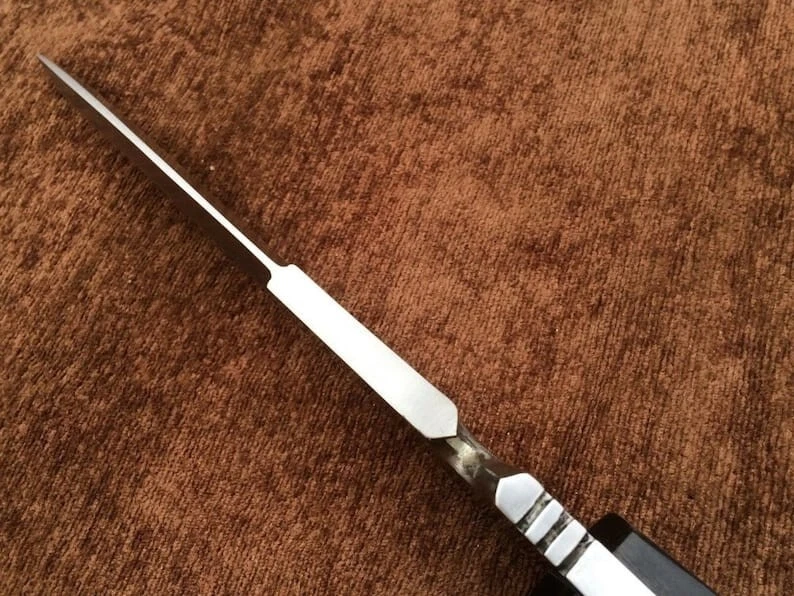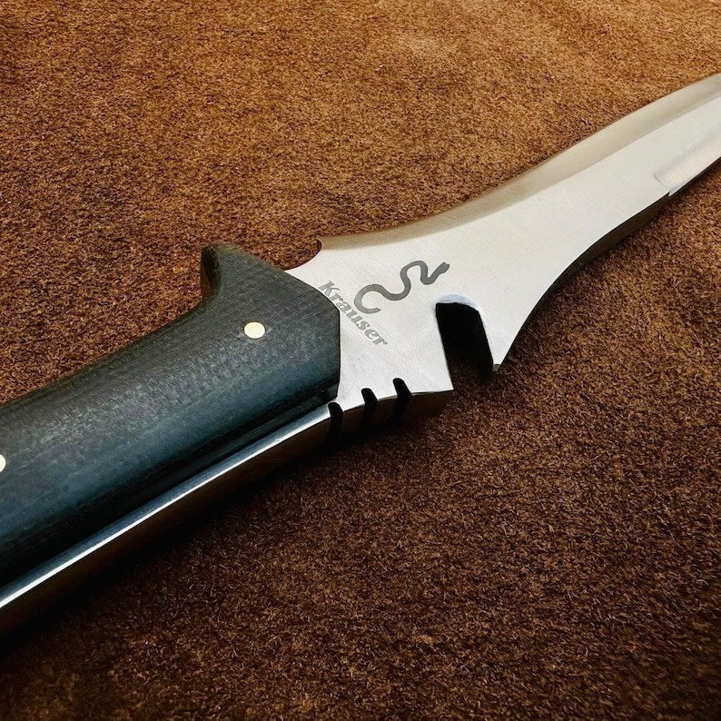 Item details Highlights Designed by Hafiz Crafts Supplies for making crafts Materials: Blade material: Carbon steel; Handle material: Micarta Jack Krauser Knife Reproduction Personalized Custom Handmade Spring Steel, Bowie Knife, Tactical Knife, Birthday Gift, Gift For Friend This is handmade Spring steel resident evil 4 jack krauser knife replica, entirely handmade, tempered , razor sharp and fully functional. Specially make for resident evil lover, buy your self a gift , send gift to your friend , take photos with it and send to your friends who wished for it. you can use it for chopping , bush craft and for daily small tasks. you can gift to your friend, To Grooms knife , To your fathers on someone's birthday. You can ask me to things engraved on it. -Blade Material: 5160 Spring Steel -Handle Material: Micarta This custom handmade Jack Krauser hunting knife features an 8-inch carbon steel blade with a drop point design and a plain edge, perfect for outdoor activities like hunting and camping. The full tang construction and ambidextrous design make it easy to handle, while the Micarta handle provides a sturdy and comfortable grip. It comes with a sheath for safe storage and transport, showcasing the craftsmanship of Hafiz Blades in Pakistan. This original piece is ideal for collectors and outdoor enthusiasts looking for a high-quality and functional tool. The Custom Handmade Carbon Steel Blade Jack Krauser Knife is a high-quality hunting and camping knife crafted by Hafiz Crafts in Pakistan. The blade is made of carbon steel with a full tang and a drop point design, measuring 8 inches in length with a plain edge. The handle is made of Micarta, providing durability and a comfortable grip. This knife is suitable for ambidextrous use and comes with a sheath for safe storage and carrying. Handmade with attention to detail, this knife is a collectible piece for outdoor enthusiasts and knife collectors.