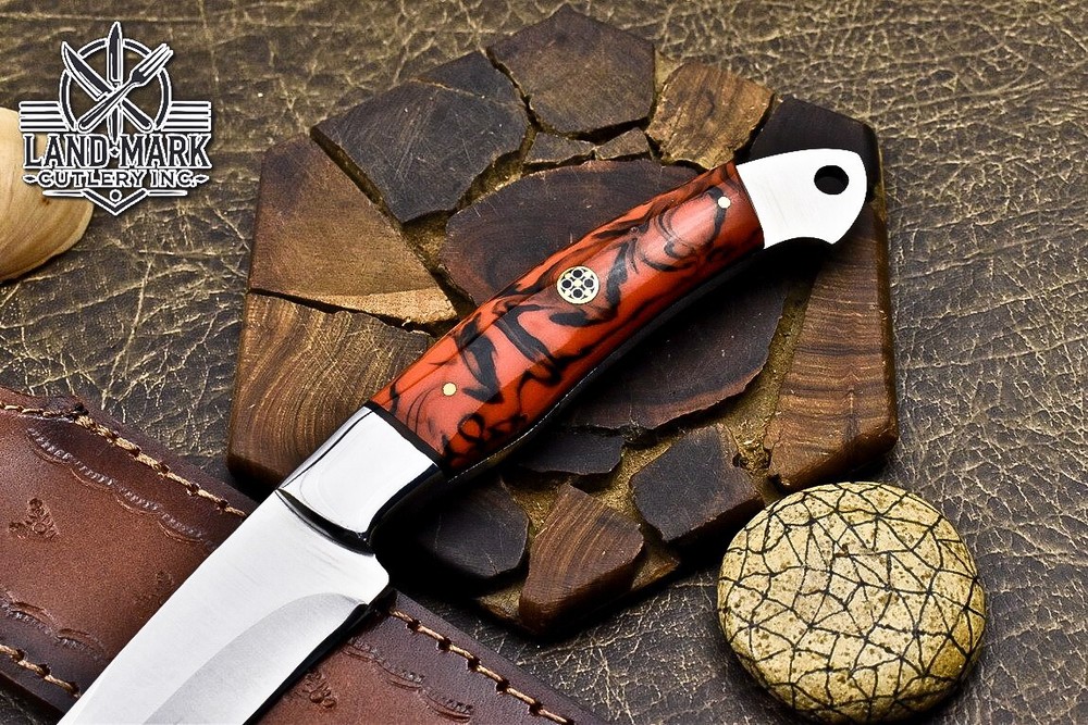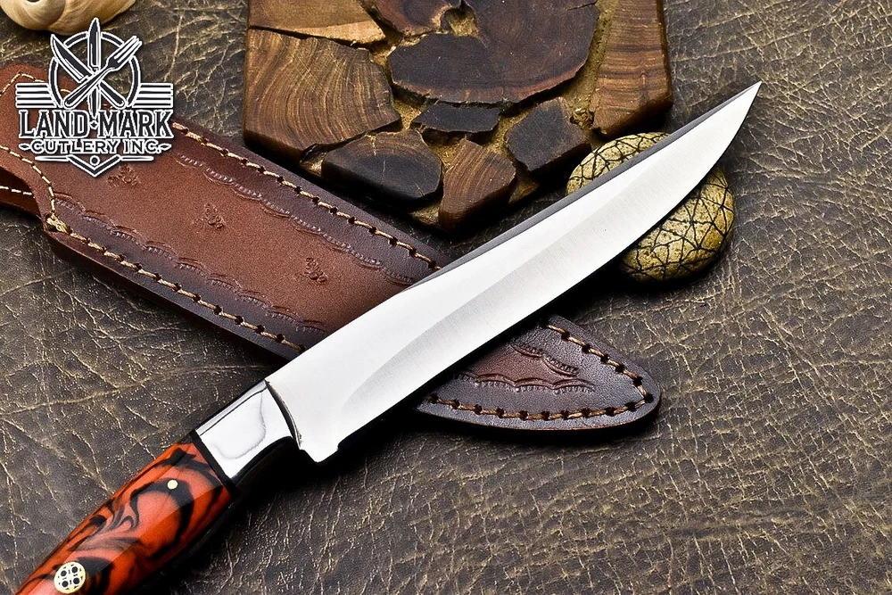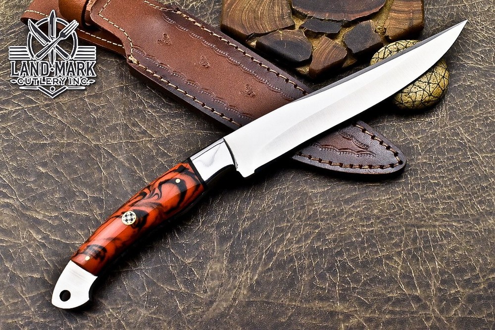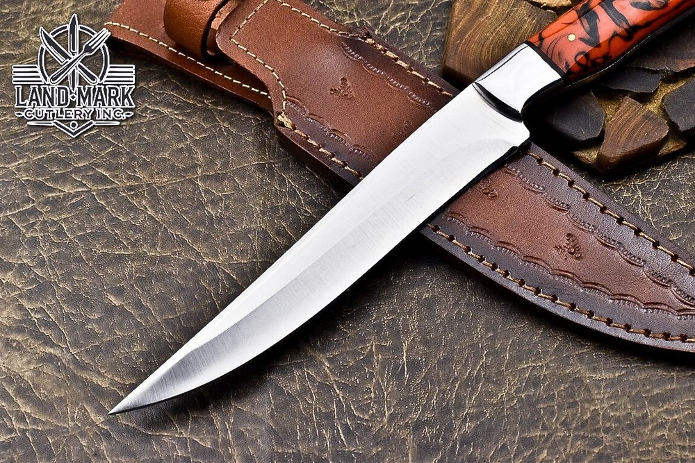 Custom Hand Made D2 STEEL HUNTING BOWIE KNIFE WITH RESIN HANDLE We offer a shipping discount for More then one purchased . And discount will be apply on combine invoice, Discount will not apply on separate payment. ITEM DETAILS OVER ALL LENGTH 13.0 inches long (Approx) HANDLE LENGTH 5.0 inches long (Approx) BLADE LENGTH 8.0 inches long (Approx) BLADE HARDNESS 58-60 HRC Which Holds The Sharp Edge For Long Time. HANDLE RESIN COVER LEATHER SHEATH This Awesome custom made KNIFE has a nice hand forged with the combination of 4340 & 1080 steel. HOW OUR DAMASCUS IS MADE: All our Damascus is real and not just an acid etch. Damascus is a mixture of 1080HC and 4340 nickel carbon. You heat them up together and then fold the bar over and over to get the desired layers, ours are 396 layers. Then you burn the blade in acid, and it turns the nickel satin color and the high carbon turns blackish gray. This is how the layers are exposed to show the layers of the new steel created coined "Damascus". All Damascus is acid etched to show the layers. If you high polish the metal it will be shinny satin like all steels. Only after you burn the sides of the blade with acid do you see the layers of the two steels. Makes sense? After we make our knives we high polish the handles and put an edge on the blade. The high polishing buffs off the acid burned layer of the handle, and the blade edge is sharpened and the acid burned edge becomes satin. You can re-burn the tang of the blade near the handles and the edge of the blade and it will show the layers once more. All our knives are hand made, durable and unique ***** YOU WILL RECEIVED THE SAME KNIFE Qality Standards Our Damascus blades are made from high quality non-stainless steels which rival or exceed any Damascus blade made from the 10 series with 4340. Our Damascus combination has taken years to perfect and has been tested under a variety of application which will offer professional performance in categories of toughness, strength (lateral stress) and edge honing and holding ability. In a 5 spot Rockwell test our blades will average near or close to 58 which offers a perfect balances between its toughness and strength.Our blades due to carbon content need to be regularly treated with wax and/or 3 in 1 oil to maintain its superior quality. Questions if you have any question feel free to send us message we aim to answer all questions within 24 hours Feedback If you are not satisfied with our service please contact us before leaving any negative or natural feedback. We will resolve all issues as quickly as possible. Disclaimer We are not responsible for any injuries associated with the use of our tools. Our products are intended for legal use only by responsible buyers. Therefore, we will not sell our products to anyone under the age of 18. Before bidding please check your country laws as some countries Custom don't allow this. If your purchase is held by Custom Authorities in your country/State we will not be responsible for that and no refund will be issued Shipping We offer a 20% shipping discount for More then one purchased . And discount will be apply on combine invoice, Discount will not apply on separate payment We ship within 24 hours after receiving complete payment but this can be delayed due to week ends or Governments and Religious Festivals . . This is beyond our control and we apologize for this inconvenience. Precautions Our Tools are very sharp so open and use them very carefully We are not responsible for any injuries associated with the use of our tools Tips to Care knife 1. NEVER STORE YOUR KNIFE FOR LONG TIME IN LEATHER SHEATH. 2. LEATHER CAN ABSORB WATER, WHICH WILL RUST THE KNIFE. 3. ALWAYS CLEAN THE BLADE AFTER USING WITH OIL OR WAX