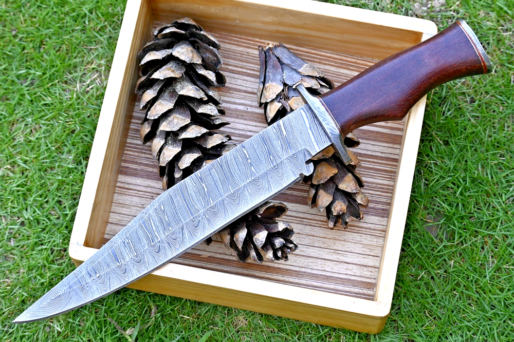 CUSTOM HAND MADE BOWIE HUNTING KNIFE SURVIVAL FORGED DAMASCUS STEEL WOOD & DAMASCUS STEEL GUARD HANDLE This superb design knife is hand forged. Blade of this knife has a nice file work and is made of 512 layers of 4340 stainless steel and 1075 high carbon steel and hardness 55-58 HRC . This robust knife is lab tested under intense conditions, the balance and shape of this knife ensures perfect grip. Overall Length: 15" Inches Blade Length: 10" Inches Handle Length: 5" Inches Damascus Design: Twist Pattern Layers: 512 Package Includes: with Sheath \ Warning: Keep fingers clear of blades. Store away from children.