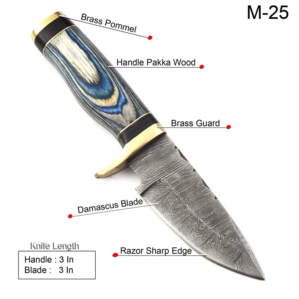 Dexterity: Ambidextrous Brand: Damascus Blade Material: Damascus Steel Blade Length: 3" Type: Boot, Bowie, Bowie Knife, Combat, Everyday Carry, Hunting, Survival, Throwing Handle Material: Wood & Brass Pommal & Brass Guard Features: Sheath Included Blade Edge: Plain Original/Reproduction: Original Handmade: Yes Tang: Half Blade Type: Drop Point Year: 2025 Blade Color: Gray