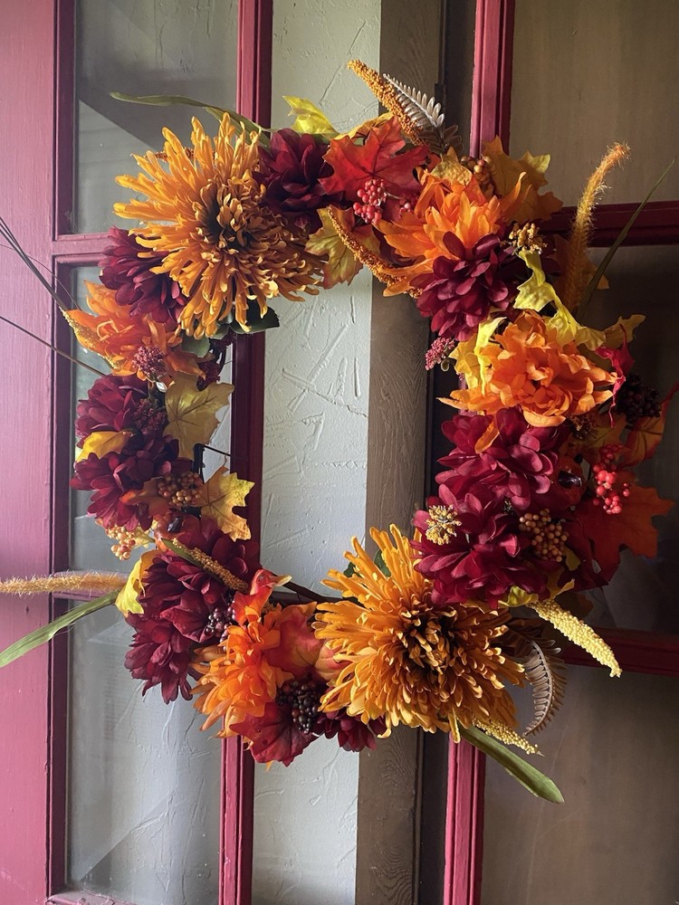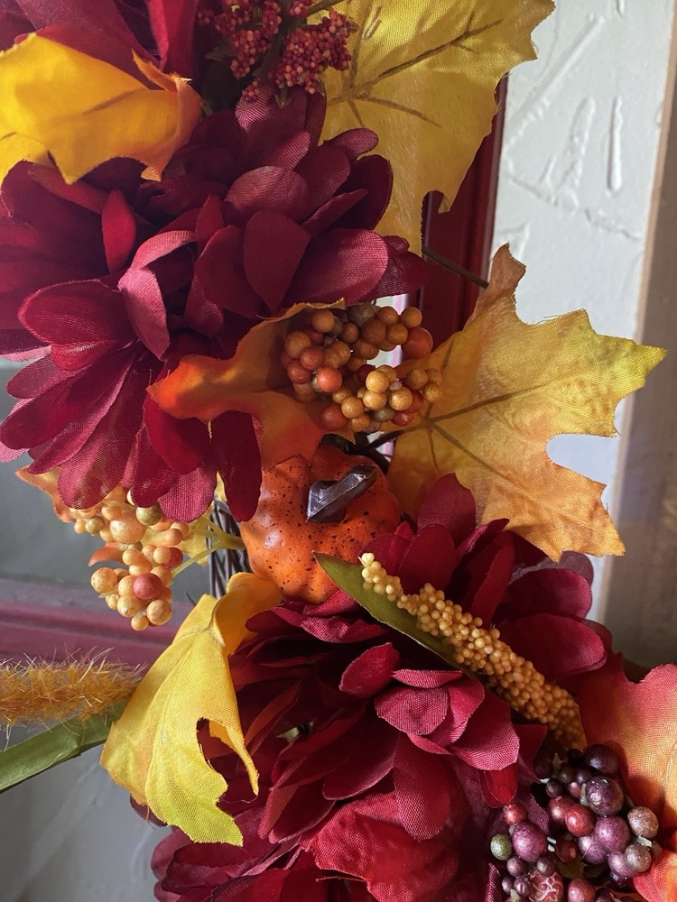 Beautiful fall wreath just made today. Bright fall colors with a couple of little pumpkins attached. Can be shipped out tomorrow.