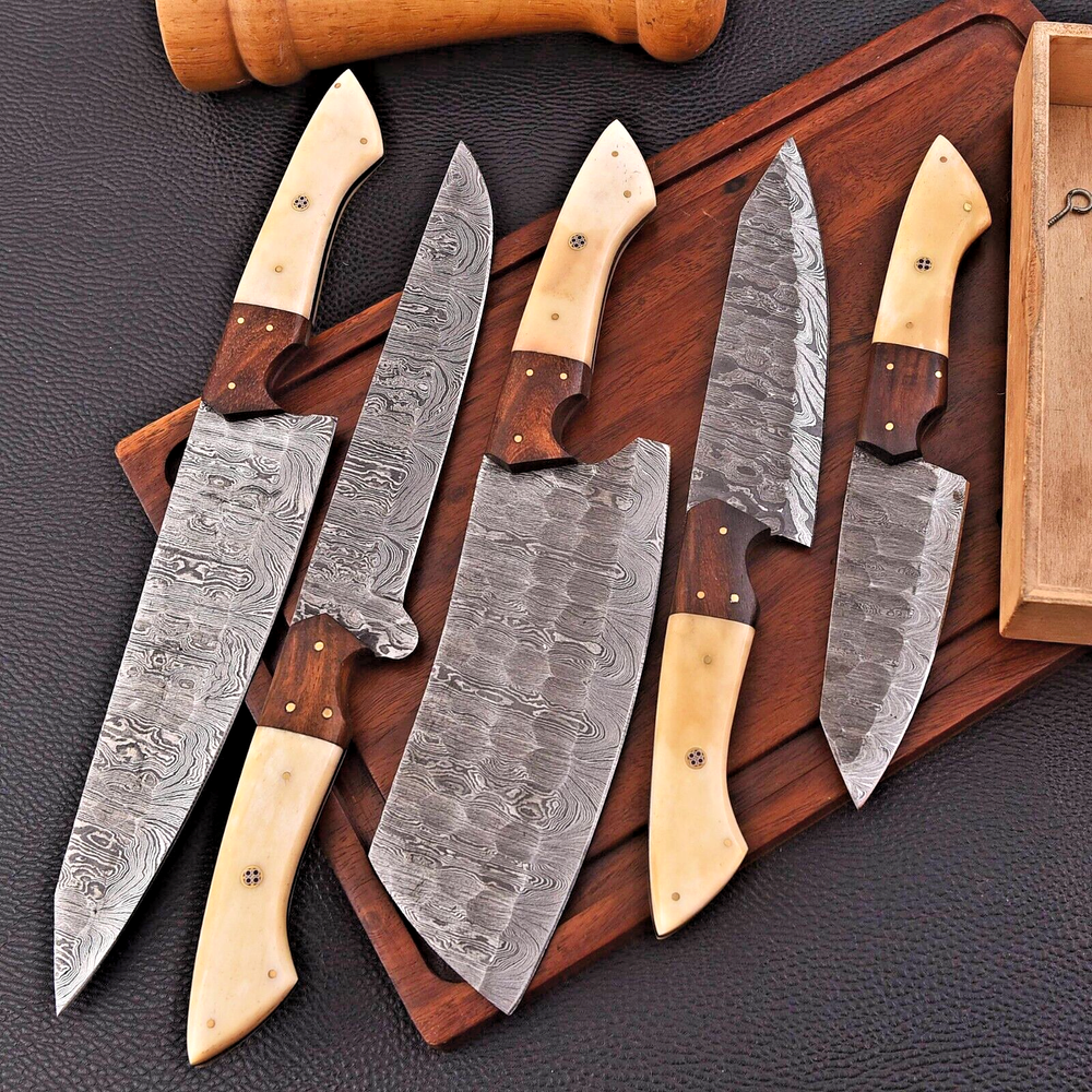 Custom Hand Forged Damascus Steel CHEF KNIVES SET Camel Bone & Wood Handle Damascus Steel: Modern pattern welded Damascus steel, 512 layers of hard higher carbon steels are welded to many layers of soft lower carbon steels. The pattern is designed, the blade is forged-welded, twisted, drilled, flattened, grounded, and forge-welded some more. The stack of steel is formed into a billet, and these billets or bars are then used to make a knife. The knife is profiled, ground, heat treated and finished with additional processes like etching and bluing to reveal the striking pattern. Blade is tempered & edge is fully sharpened. Overall Pieces : 5 Left to Right UTILITY Knife :OVERALL 13' Blade 8" Inches - Handle 5" Inches Cleaver Knife : OVERALL 10' Blade 5.5" Inches - Handle 4.5" Inches FILLET Knife : OVERALL 12' Blade 7.5" Inches - Handle 4.5" Inches CHEF Knife : OVERALL 10' Blade 5.5" Inches - Handle 4.5" Inches STEAK Knife : OVERALL 9' Blade 4.5" Inches - Handle 4.5" Inches Damascus Design: Twist Pattern Layers:512 Hardness:55-58 HRC Package Includes: with Leather Sheath Warning: Keep fingers clear of blades. Store away from children
