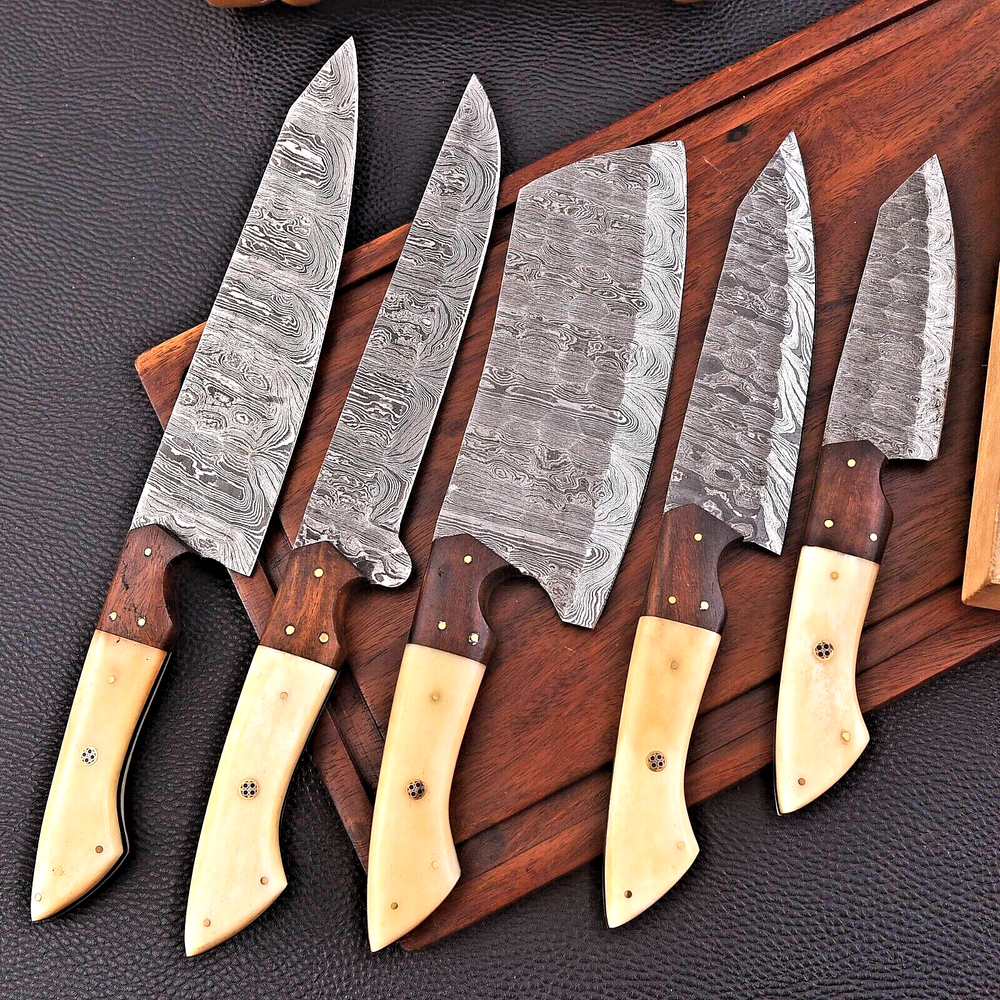 Type: Chef's Knife Number of Items in Set: 5 Food Compatibility: Fruit, Meat, Salad, Universal, Vegetables Making Method: Compressor Personalize: No Material: Damascus Steel Set Includes: Butcher Knife, Carving & Slicing Knives, Chef's Knife, Knife Set, Nakiri Knife, Slicer, Steak Knife, Utility Knife Features: Leather Bag Color: Blue Brand: Chef Knife Handle Material: Camel Bone & Wood Handle Blade Edge: Straight MPN: N/A Blade Length: 8 in