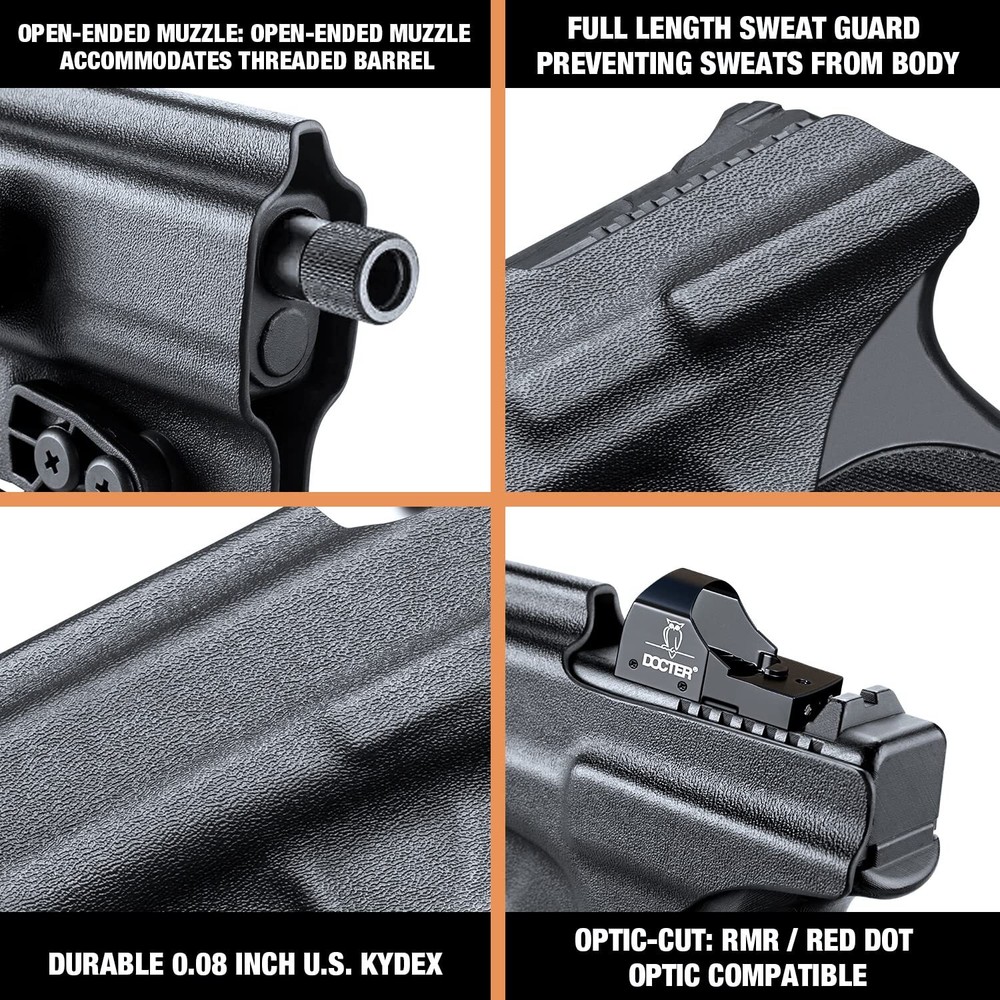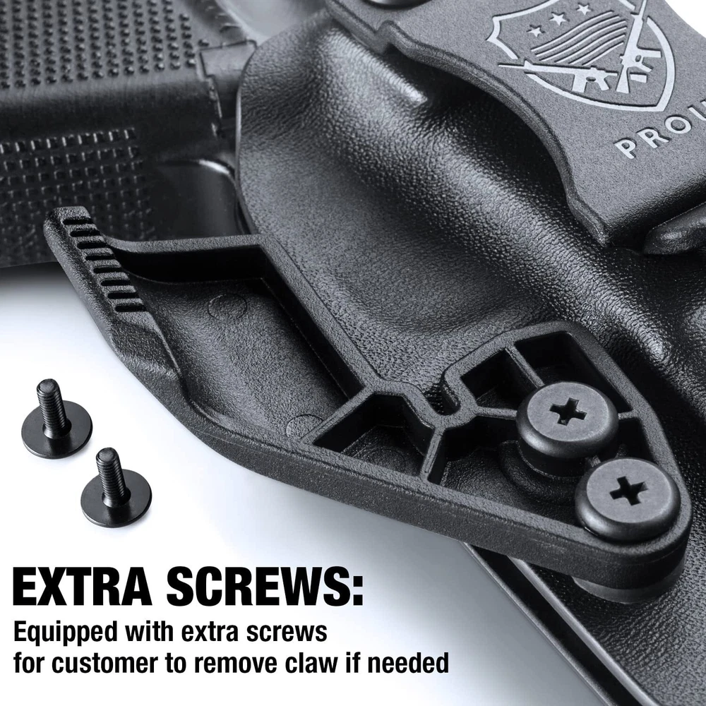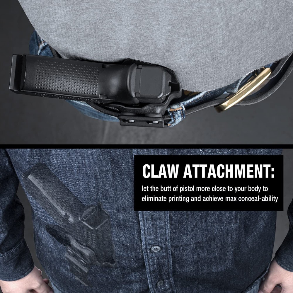 IWB Kydex Holster with Claw Attachment and Optic Cut: wih Glock 43 / Glock 43X - Not Fit G43X MOS, Concealed Carry Holster Glock 43, Adj. Cant & Retention, Right Hand HOLSTER FITS: G43 iwb holster is with Glock 43/ 43x. Holster is not with G43X MOS US .08 INCH KYDEX MATERIAL: G43 holster is made of top quality .08 inch kydex material, which is strong, durable, washable and molded specifically for G43 OPTICS READY: G43 holster with claw was designed to accommodate different optics, RMR/SRO MAX CONCEALMENT: Claw attachment let the butt of more close to your body to eliminate printing and achieve max conceal-ability. Equipped with 2 extra screws for customer remove claw carry POSITIVE AUDIBLE “CLICK” LOCK SYSTEM: When holster retention is well customized, you would hear clear “click” sounds when your handgun is firmly holstered FULL LENGTH SWEAT SHIELD AND OPEN BOTTOM: Sweat shield avoid sweats from body. The open end muzzle accommodate threaded barrel ADJUSTABLE CANT AND RETENTION: holsters cant are adjustable from 0 to +20 degree, loosen a little bit of screws on belt clip, then move the angle and tighten screws. The adjustable retention allows you customize idea tightness TIPS: To avoid screws get lost, we highly suggest utilizing thread locker on all threads to prevent loosening.