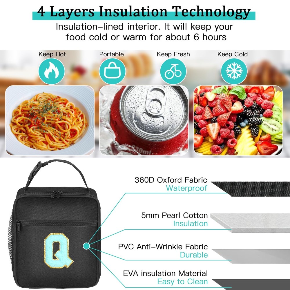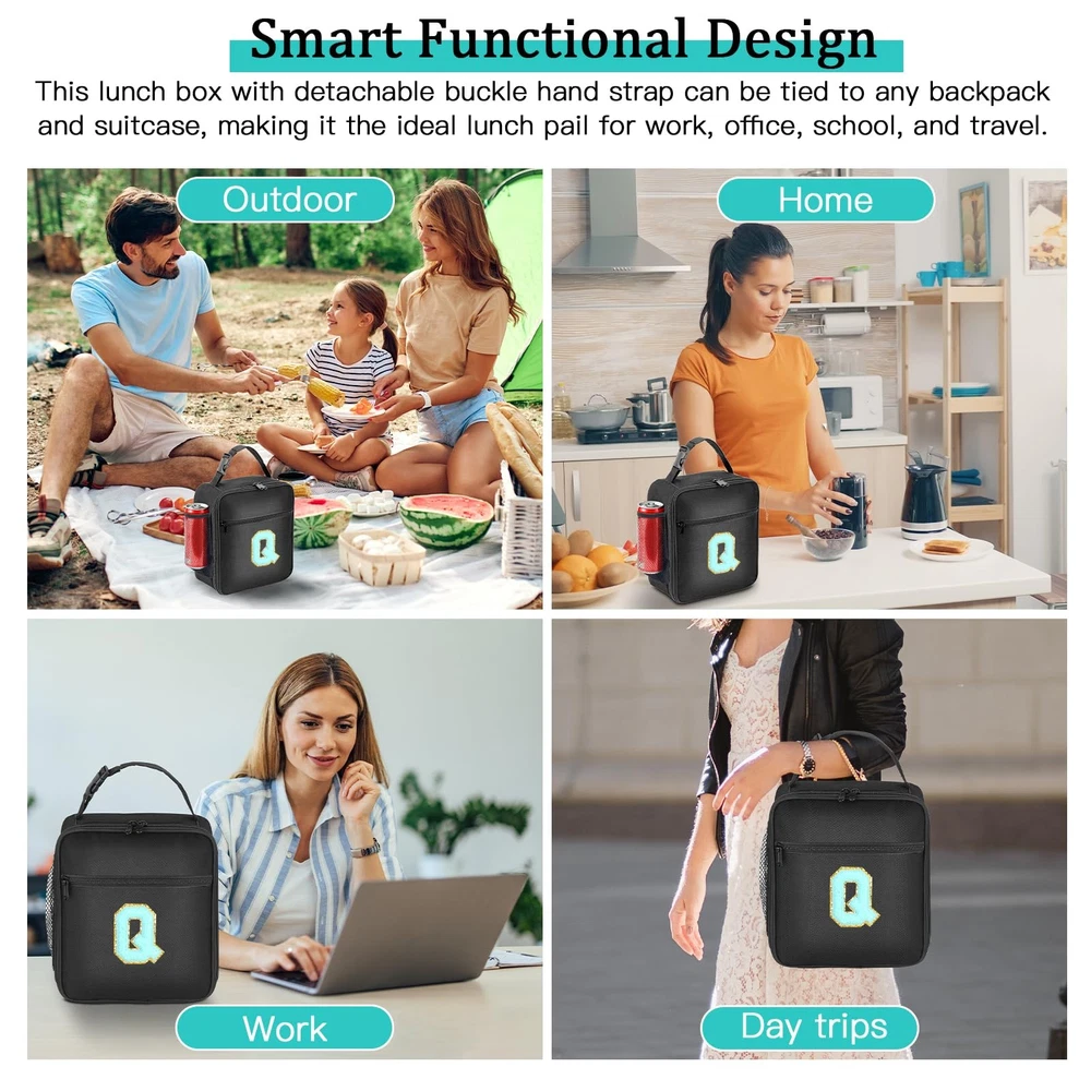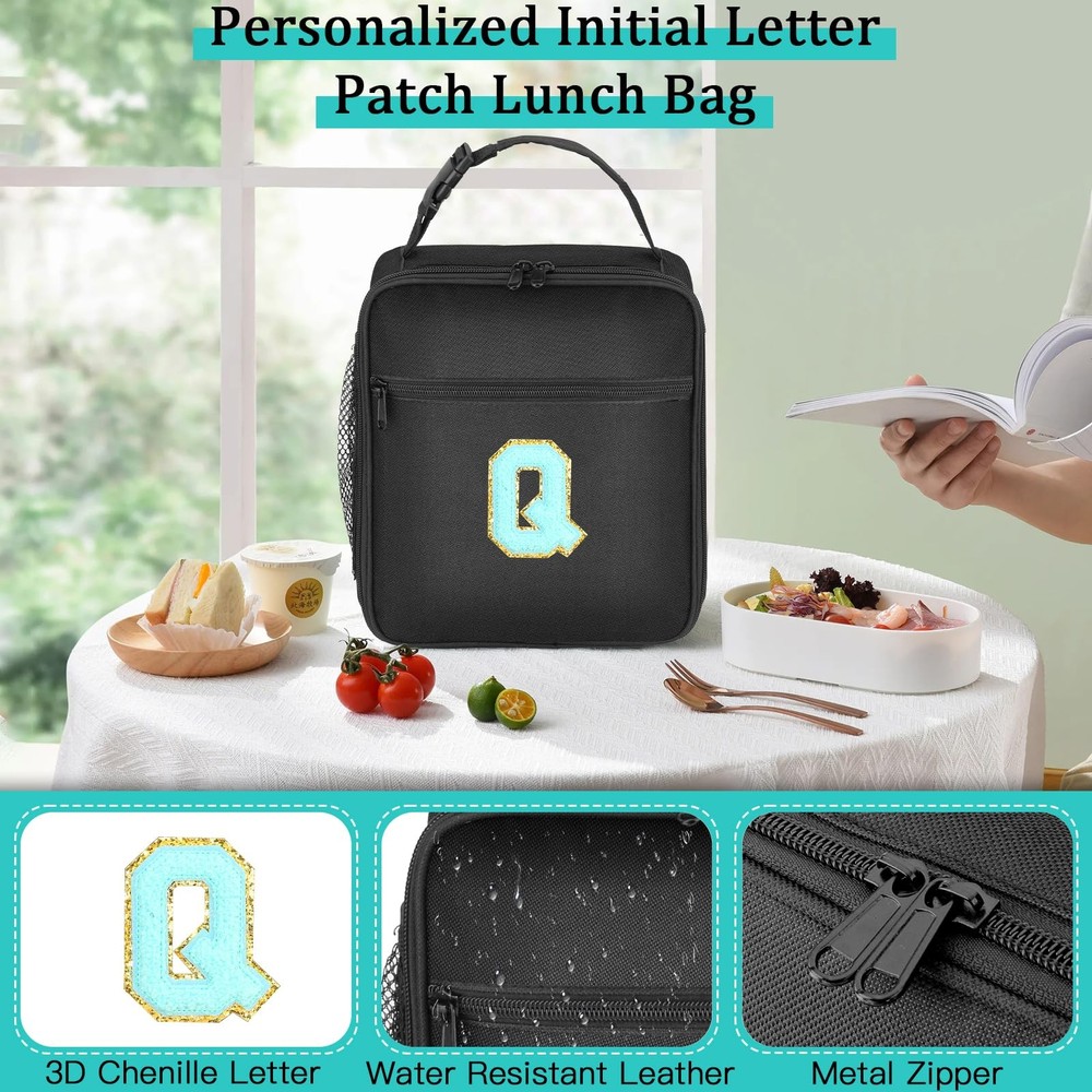 Initial InsulatePersonalized Letter Patch Design: The unique letter design makes the lunch bag stand out. The letters patch on the lunch bags are hand-stitched, which is not only not easy to come off, but also comfortable to touch.d Lunch Bag, Lunch Box with Initial Letter Patch for Teen Adult, Reusable Lunch Bag for Men Women, Ideal Birthday Gift Lightweight and portable: The lunch bag weighs 7 oz/0.43 lbs. Won't add much extra weight to your lunch. You can feel free to use it to carry your lunch, drinks and fruits etc to school, work or picnic. Plenty of storage space: This insulated lunch bag (10.2 x 9.2 x 4.5 inches) is designed to maximize storage efficiency, which not only provides you with plenty of space to hold the food and snacks you need throughout the day, but also your keys, cards, phone charger, water bottle, cutlery, lipsticks, or any other small things you need on a daily basis. Premium Material: This initial letter gift lunch box is made of 360d oxford fabric. Pearl cotton lining allows your food and drinks to stay cold or hot. The PEVA lining makes cleaning easy. Ideal Personalized Gift: This stylish letter patch personalized lunch bag is great as a birthday, Thanksgiving, Christmas, New Year, Back to school day and Mother's Day gift for teen, friends, daughters, mothers and sisters and so on.