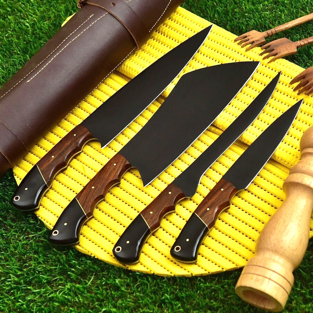 FULL TANG CUSTOM HAND MADE CARBON STEEL BLADE CHEF KNIFE KITCHEN KNIVES SET Wood Handle This superb design knifes is hand made. Blade of this knife has a nice file work and is made of high carbon steel and hardness 55-58 H R C . This robust knife is lab tested under intense conditions, the balance and shape of this knife ensures perfect grip. Overall Pieces : 4 Cleaver Knife : Blade 6.5" Inches - Handle 5" Inches Fillet Knife : Blade 5.5" Inches - Handle 5" Inches Chef Knife : Blade 7.75" Inches - Handle 5.25" Inches Steak Knife : Blade 4" Inches - Handle 4.75" Inches Warning: Keep fingers clear of blades. Store away from children.