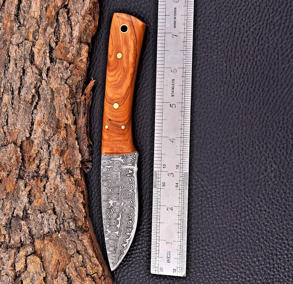 CUSTOM MADE HAND HUNTING CAMPING SURVIVAL KNIFE HAND FORGED DAMASCUS STEEL SKINNER KNIFE Wood Handle This superb design knife is hand forged. Blade of this knife has a nice file work and is made of 512 layers of 4340 stainless steel and 1075 high carbon steel and hardness 55-58 HRC . This robust knife is lab tested under intense conditions, the balance and shape of this knife ensures perfect grip. Overall Length: 7.6" Inches Blade Length: 4" Inches Handle Length: 3.6" Inches Damascus Design: Rain Drop Pattern Layers: 512 Hardness: 55-58 HRC Package Includes: with Leather Sheath Warning: Keep fingers clear of blades. Store away from children.