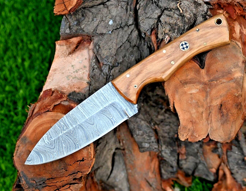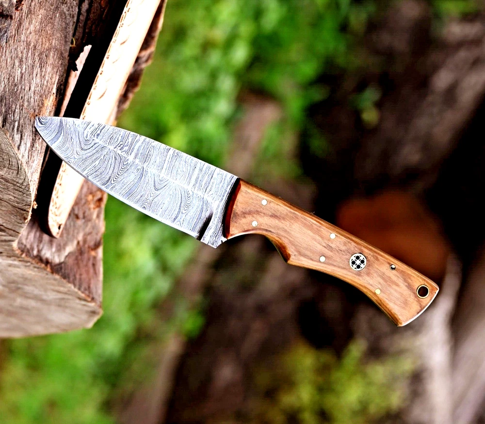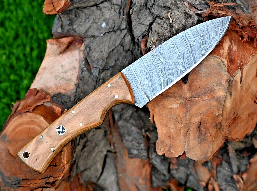 FORGED DAMASCUS STEEL BLADE CUSTOM MADE HAND HUNTING CAMPING SURVIVAL HIKING KNIFE Wood Handle This superb design knife is hand forged. Blade of this knife has a nice file work and is made of 512 layers of 4340 stainless steel and 1075 high carbon steel and hardness 55-58 HRC . This robust knife is lab tested under intense conditions, the balance and shape of this knife ensures perfect grip. Overall Length: 8.6" Inches Blade Length: 4.6" Inches Handle Length: 4" Inches Damascus Design: Rain Drop Pattern Layers: 512 Hardness: 55-58 HRC Package Includes: with Leather Sheath Warning: Keep fingers clear of blades. Store away from children.