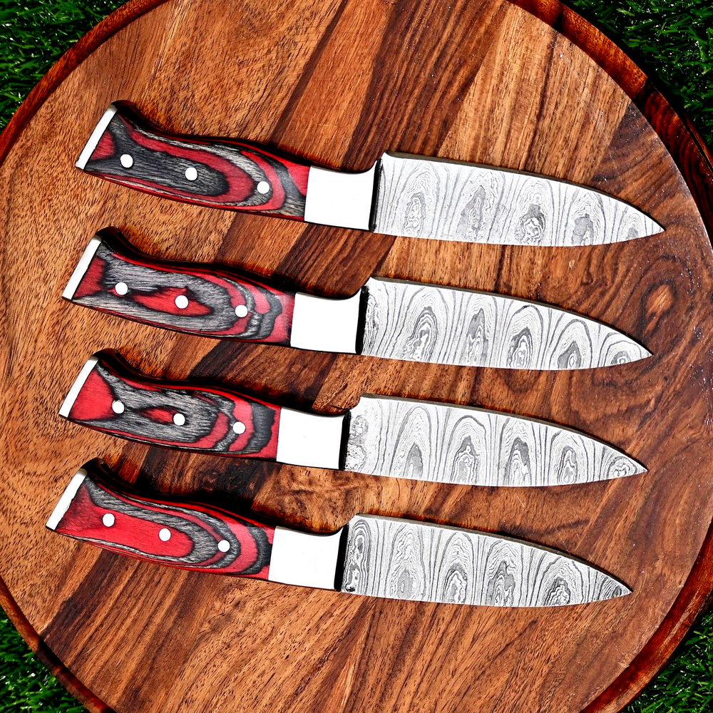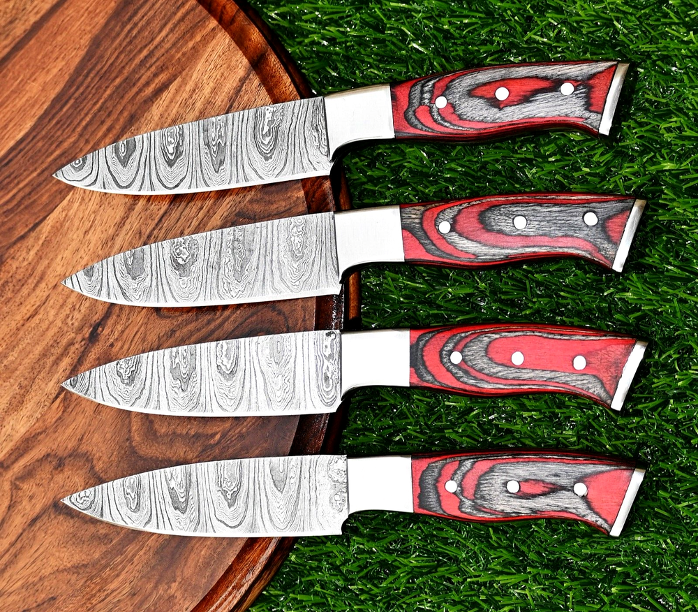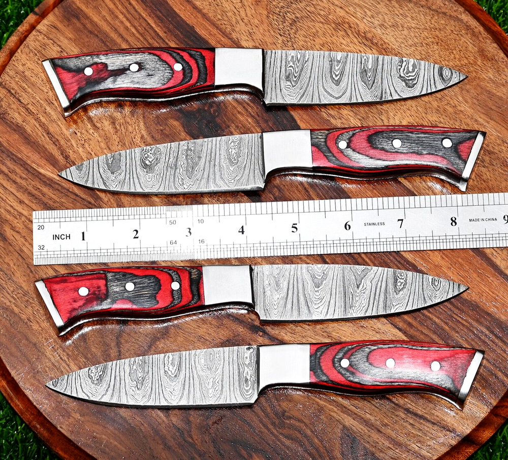 FOUR CUSTOM HAND MADE CHEF STEAK KNIFE SET HAND FORGED DAMASCUS STEEL BLADE WOOD Handle This superb design knife is hand forged. Blade of this knife has a nice file work and is made of 512 layers of 4340 stainless steel and 1075 high carbon steel and hardness 55-58 HRC . This robust knife is lab tested under intense conditions, the balance and shape of this knife ensures perfect grip. Overall Length: 9" Inches Blade Length: 5" Inches Handle Length: 4" Inches Damascus Design: Twist Pattern Layers: 512 Hardness: 55-58 HRC Warning: Keep fingers clear of blades. Store away from children.