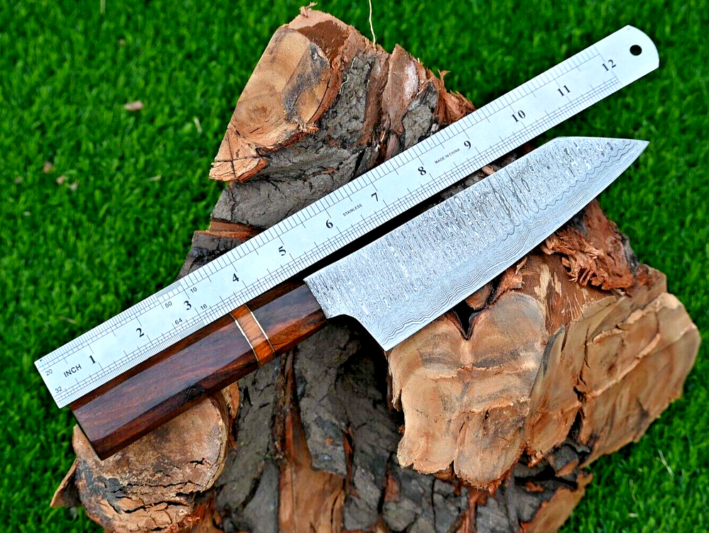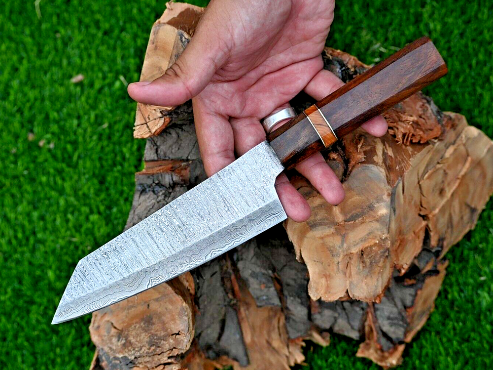 CUSTOM HAND MADE HAND FORGED DAMASCUS STEEL BLADE CHEF KNIFE KITCHEN KNIFE Wood Handle This superb design knife is hand forged . Blade of this knife has a nice file work and is made of 512 layers of 4340 stainless steel and 1075 high carbon steel and hardness 55-58 HRC . This robust knife is lab tested under intense conditions, the balance and shape of this knife ensures perfect grip. Overall Length: 13” Inches Blade Length: 8” Inches Handle Length: 5" Inches Damascus Design: Ladder Pattern Layers: 512 Hand Forged Hardness: 55-58 HRC Care Instructions: Keep the knife dry after each cleaning. Warning: Take care when removing product from packaging. Keep fingers clear of blades. Store away from children.