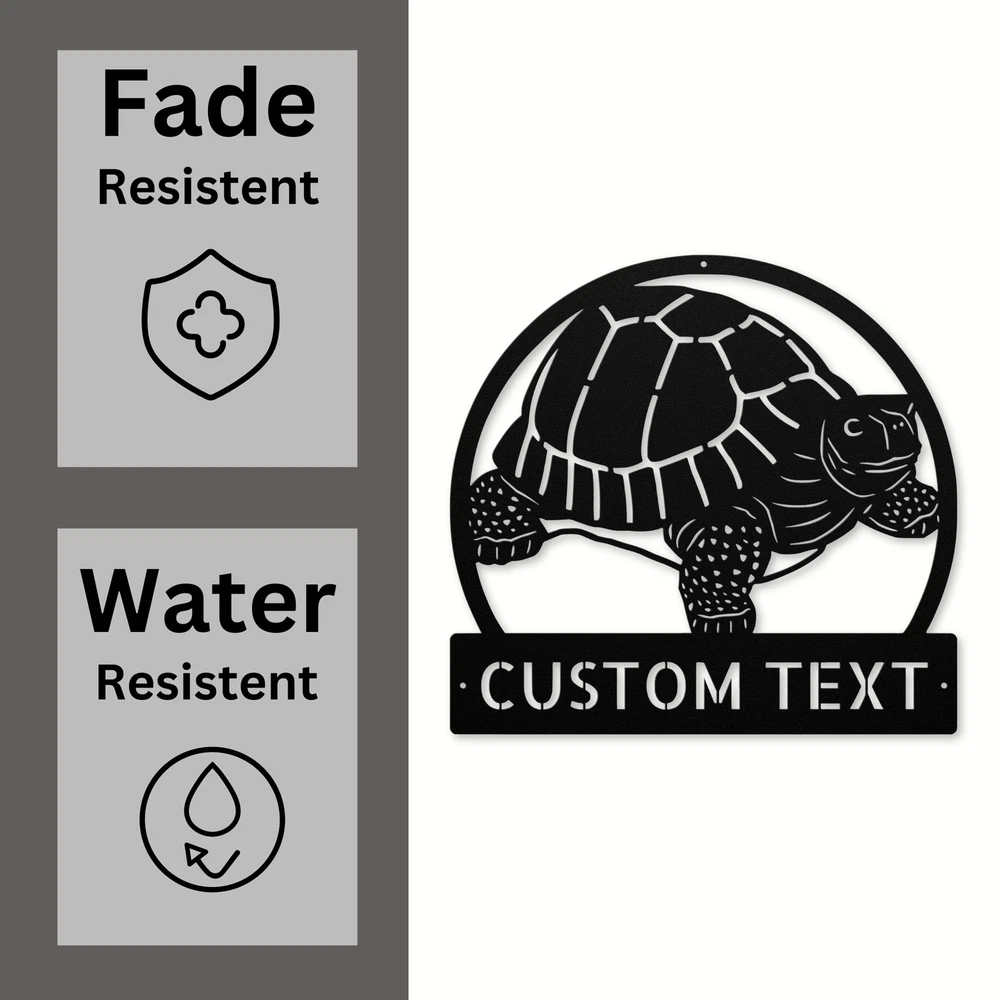 Product Description Custom Metal Tortoise Wall Art Sign Personalized Turtle Wall Art Home Decor Enhance your home or office with the charming Custom Tortoise Metal Sign ! This delightful sign is perfect for tortoise lovers and adds a unique touch to any space. Crafted from 16 gauge high-quality metal, this sign is not only visually appealing but also built to last. The durable powder coating makes it dust, weather, and water-resistant, ensuring it stays looking great indoors or outdoors. You can personalize this sign with your name, a fun message, or even a special date, making it a wonderful addition to your decor or a thoughtful gift. Ideal for Christmas, birthdays, or any special occasion, this tortoise sign brings warmth and personality to any setting. Whether it’s for your garden, living room, or office, it’s sure to be a conversation starter! Key Features: Customizable: Add your name, a special message, or any unique text. Durable Material: Made from high-quality 16 gauge metal for lasting strength. Weather Resistant: Powder-coated finish protects against dust and outdoor conditions. Charming Decor: Perfect for animal lovers, gardens, homes, or offices. Great Gift Idea: Ideal for birthdays, Christmas, or any special occasion. Make a statement with the Custom Tortoise Metal Sign ! This delightful piece of decor will not only reflect your personality but also bring a smile to everyone who sees it. Service and Color Choice Our metal signs are designed to be personalized just for you, making them the perfect addition to any space! The default color for our signs is Black , but we also offer a variety of beautiful options including Copper, Gold, White, and Silver . After placing your order, simply contact us with your preferred color choice, and we'll ensure your sign is exactly how you envision it. Let’s create something special together!