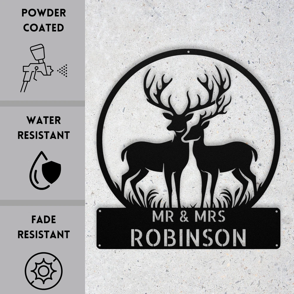 Product Description Custom Mr Mrs Deer Metal Sign Personalized Family Last Name Home Decor Art Add a rustic touch to your home with this Custom Mr. & Mrs. Deer Metal Sign ! Made from high-quality 16 gauge metal, this personalized sign is designed for both style and durability. The powder coating provides excellent protection against dust, weather, and moisture, making it suitable for indoor and outdoor use. This custom metal sign is a perfect gift for Christmas, birthdays, or any special occasion. Personalize it with your family last name for a unique piece that reflects your love for nature and family. Whether you hang it in your living room, entryway, or on your porch, this sign will make a charming statement. Key Features: Customizable Design: Personalize with your family last name for a unique touch. Durable Material: Crafted from sturdy 16 gauge metal for long-lasting appeal. Weather Resistant: The powder-coated finish protects against dust, moisture, and outdoor elements. Versatile Decor: Ideal for indoor or outdoor use, enhancing any space. Great Gift Choice: A thoughtful present for Christmas, weddings, or other special occasions. Charming Design: Features a lovely deer motif, perfect for nature lovers and families. Bring warmth and personality to your decor with this Custom Mr. & Mrs. Deer Metal Sign! Service and Color Choice Our metal signs are designed to be personalized just for you, making them the perfect addition to any space! The default color for our signs is Black , but we also offer a variety of beautiful options including Copper, Gold, White, and Silver . After placing your order, simply contact us with your preferred color choice, and we'll ensure your sign is exactly how you envision it. Let’s create something special together!