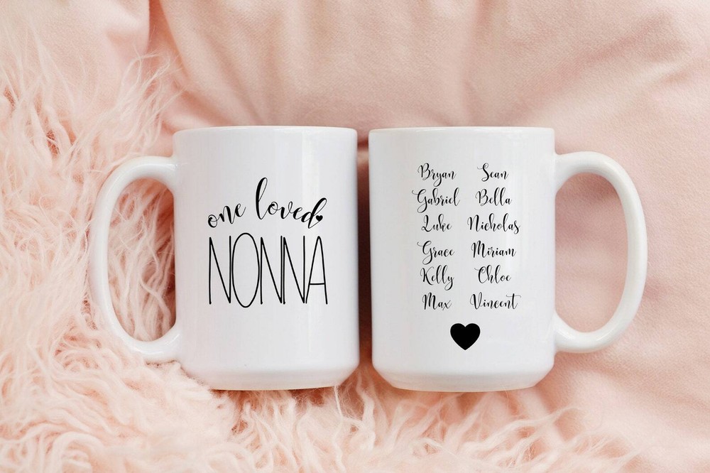 One Loved Nonna Mug Nonna Gift Nonna Coffee Mug Nonna Cup With Grandkids Names Product Details.. This high quality 11oz. ceramic white mug has a premium hard coat that provides crisp and vibrant color reproduction sure to last for years. Perfect for all hot & cold beverages. The highest quality printing possible is used. It will never fade no matter how many times you wash it. Material: 100% Ceramic. Print both sides. Dishwasher and Microwave Safe. High Gloss + Premium White Finish. Printed in the U.S.A. Personalized & Custom. We support personalized and custom mug to add custom, when placing an order, you can add notes to the "order note" in shipping address section. Also you can contact us directly via message. Shipping Info. Ready to ship in 1 to 2 business days, All products are made-to-order and proudly printed in the United States. Shipped by USPS and DHL, You will receive your order in 5-7 days. Replace & Refund. All products are defective during shipping broken, chipped will be replaced free of charge. You are not satisfied with the product, we will refund 100% money to you. If any other issues arise, please do not hesitate to message, we would be more than happy to assist you.
