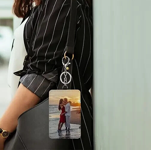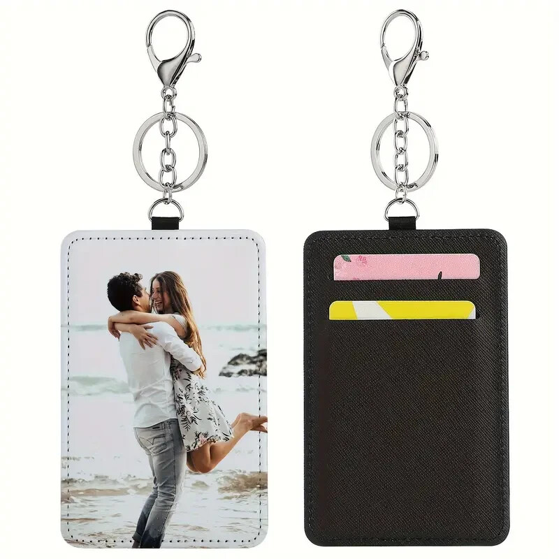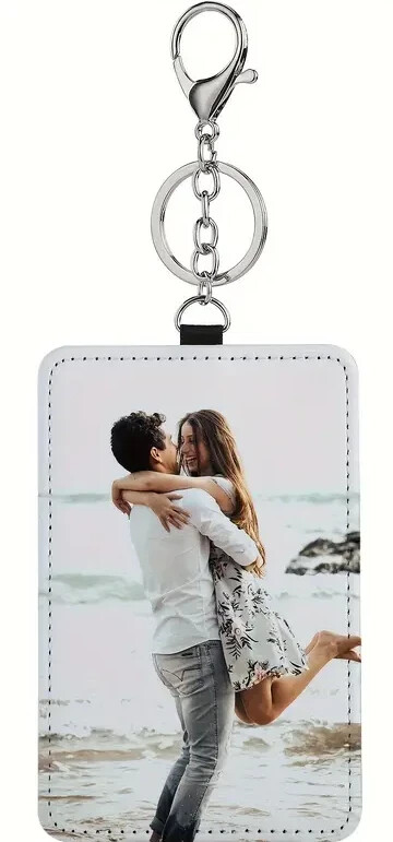 This personalized custom key chain card holder is handmade from faux leather, specifically PU leather. The leather for personaliztion measures 3 inches by 4.5 inches, it is designed as a practical accessory for women to securely store their keys and cards. The key chain doubles as a stylish way to keep essential items organized and easily accessible. Perfect for adding a personalized touch, this PU leather key chain card holder is a fashionable and functional accessory for everyday use. Hook and keychain holder included.
