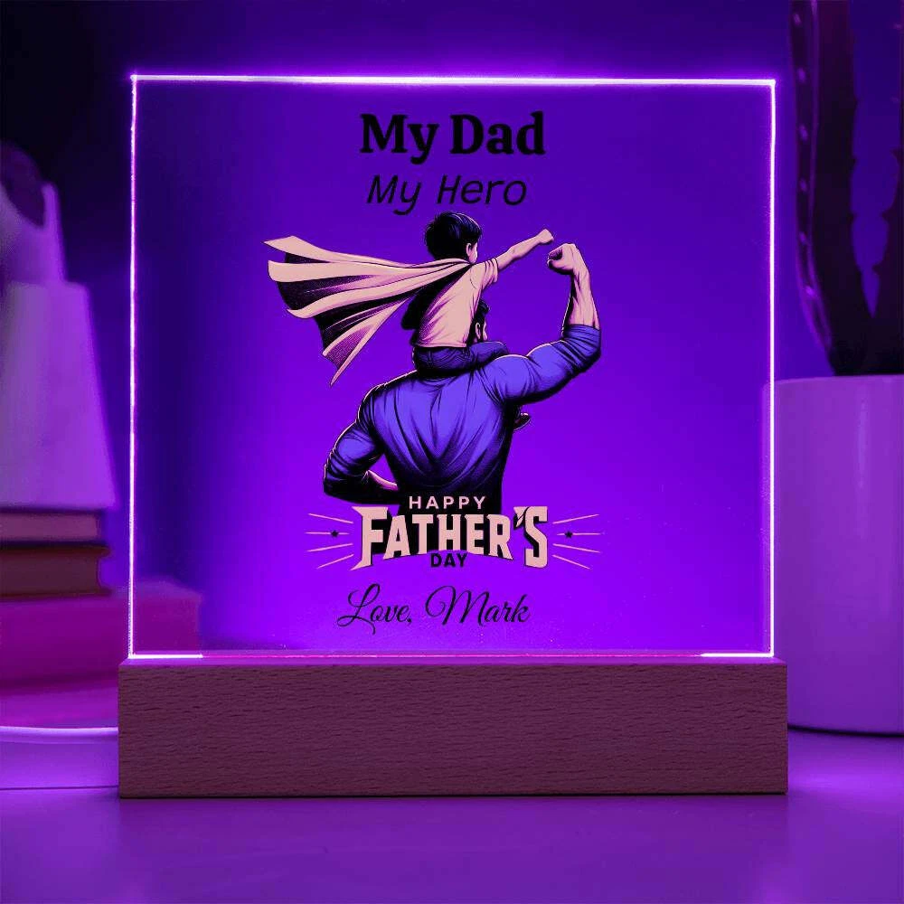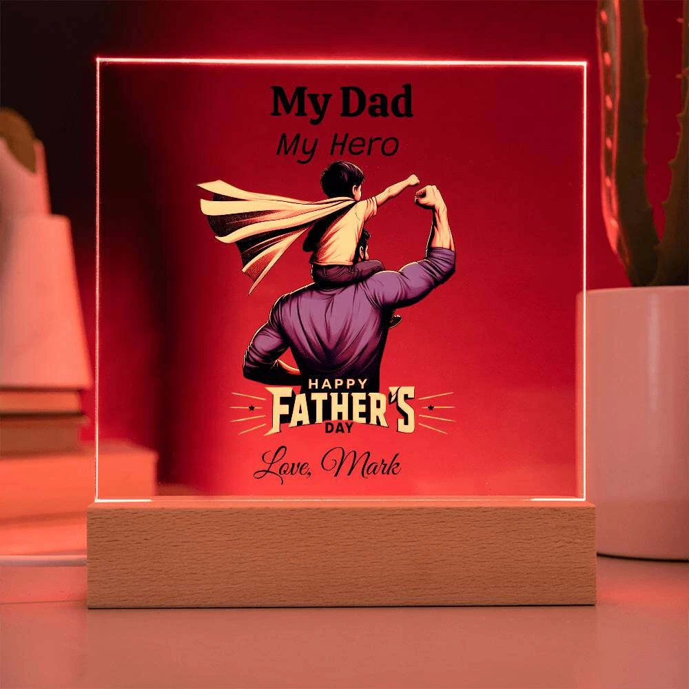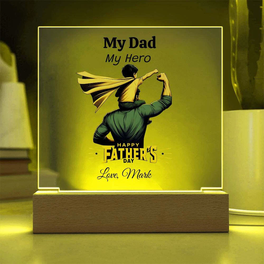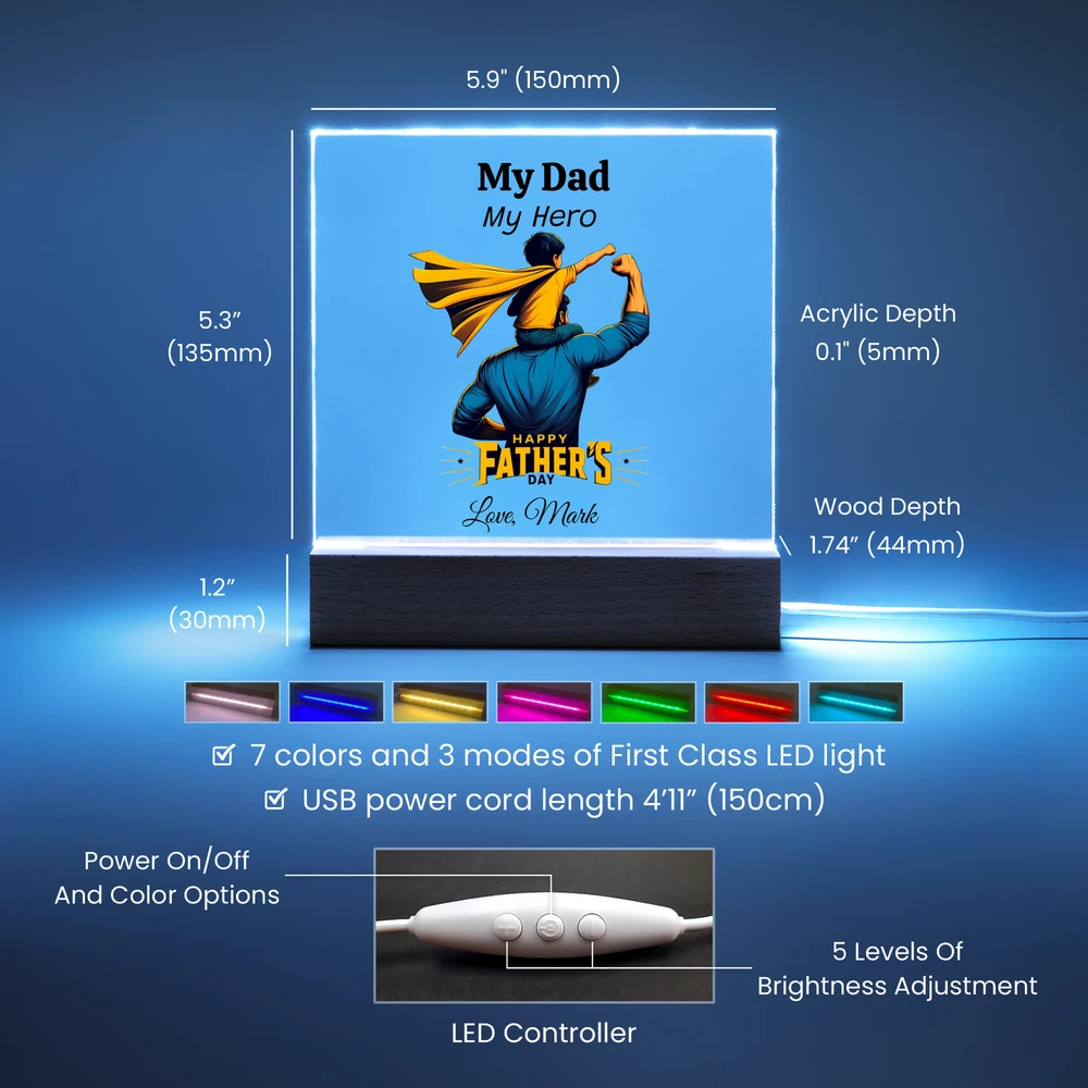 Treat your dad to a one-of-a-kind gift with our Custom Plaque for Dad! Personalize this plaque with your choice of graphic and customize all three lines of text to create the perfect Father's Day, birthday, or Christmas present. Featuring a combination of modern technology and heartfelt sentiment, our Square Acrylic Plaque is printed on crystal-clear premium acrylic and comes with a sleek wooden base for display. Upgrade to the LED wooden base for a unique presentation that will surely be a conversation starter. Surprise your partner, family members, or dear friends with this thoughtful gift on their anniversaries, birthdays, or any special occasion to express your love and appreciation in an unforgettable way. Handcrafted from high-quality acrylic, our plaque boasts a professionally printed design, making it a truly unique and sentimental gift that will be treasured for years to come. Product specifications: - Premium acrylic material - Size with wooden base: 6.5" (165mm) height x 6.5" (165mm) width - Acrylic depth: 0.1" (5mm) - Wooden base dimensions: 1.2" (30mm) height x 6.5" (165mm) width x 1.8" (45mm) depth - Optional wooden base with colorful built-in LED lights - Sharp and detailed printed design Each order is carefully packaged to ensure it is ready to be cherished for a lifetime. Show your dad how much he means to you by purchasing this custom plaque today!