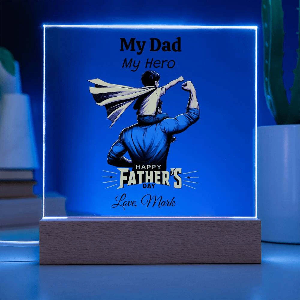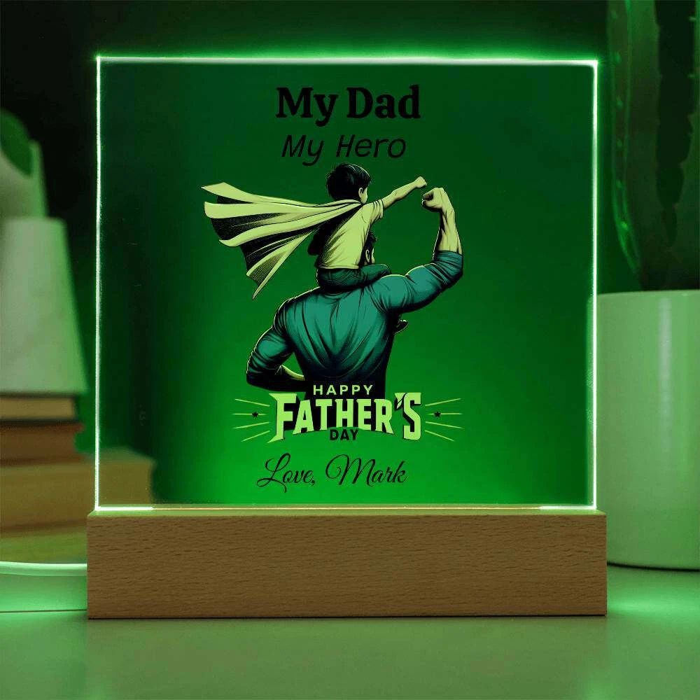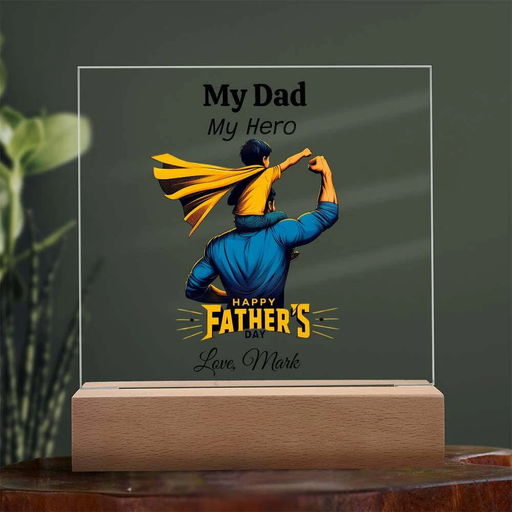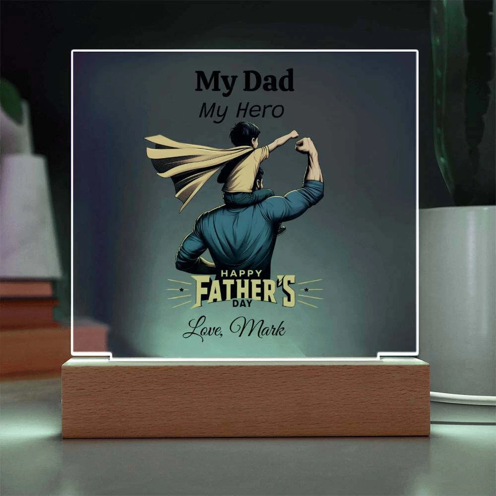 Treat your dad to a one-of-a-kind gift with our Custom Plaque for Dad! Personalize this plaque with your choice of graphic and customize all three lines of text to create the perfect Father's Day, birthday, or Christmas present. Featuring a combination of modern technology and heartfelt sentiment, our Square Acrylic Plaque is printed on crystal-clear premium acrylic and comes with a sleek wooden base for display. Upgrade to the LED wooden base for a unique presentation that will surely be a conversation starter. Surprise your partner, family members, or dear friends with this thoughtful gift on their anniversaries, birthdays, or any special occasion to express your love and appreciation in an unforgettable way. Handcrafted from high-quality acrylic, our plaque boasts a professionally printed design, making it a truly unique and sentimental gift that will be treasured for years to come. Product specifications: - Premium acrylic material - Size with wooden base: 6.5" (165mm) height x 6.5" (165mm) width - Acrylic depth: 0.1" (5mm) - Wooden base dimensions: 1.2" (30mm) height x 6.5" (165mm) width x 1.8" (45mm) depth - Optional wooden base with colorful built-in LED lights - Sharp and detailed printed design Each order is carefully packaged to ensure it is ready to be cherished for a lifetime. Show your dad how much he means to you by purchasing this custom plaque today!