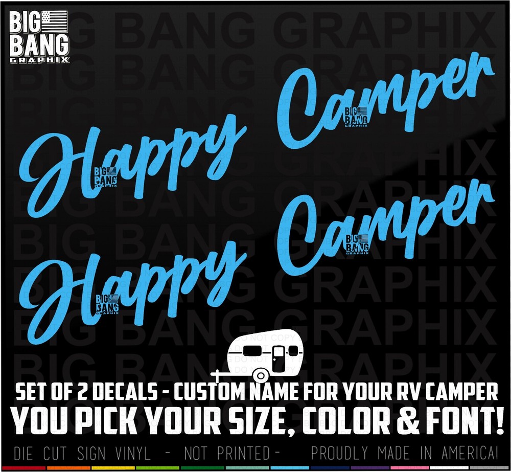 2 Custom RV Name Decal Sticker Camper Toy Trailers Hauler Pop Up Folding Tent Decal SET GREAT GIFT IDEA! Your choice of color and size! Sizes Measured in Length. Decals must be the same color. Message us your choice of font style. Must be the same color & font. Would you like a custom sticker with your name or business? Please see our store or message me for a quote! What Kind of Decals? Our decals are precision die-cut, made from quality, 7 year COMMERCIAL GRADE VINYL. NOT hobby vinyl. Our decals are available in Red, Orange, Yellow, Lime Green, Green, Sea Foam Green, Teal Blue, Medium Blue, Royal Blue, Purple, Pink, White, Black, Mat Silver "Precision Die-Cut" means that each decal is custom cut precisely along the shape of the design so your decal will have no visible background or bordering spaces. Your precision die-cut decals will come to you masked for easy installation. How and where are these made? Made in and shipped from the U.S.! Each precision die cut, hand trimmed and finished for you. Note: there is no background in the decal. Background will be what ever surface you apply it on. How do you apply die cut, decals? Decals can be placed on any flat, clean surface on exterior items as well as interior items. Clean the surface and remove the backing from the decal. Place the decal on the desired clean surface, before removing transfer paper use a credit card type tool to adhere and smooth decal to surface then remove the transfer paper. Thank you for looking and please check out our store for other quality die cut decal. Custom Orders * We make custom decals of any kind, if there is something you are looking for feel free to leave a message! Decals can also be made a different size if needed, but the pricing will be different If you have a problem with your order, contact us immediately and we will take care of it. Satisfaction guaranteed! *Feedback will be left after it is rec'd* In order to qualify for shipping discount, you must pay for all items on (1) ONE invoice. .........