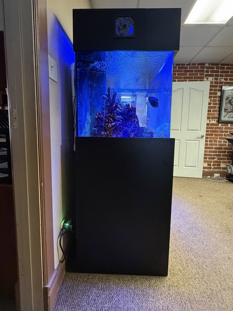 Custom 150-Gallon Reef Aquarium System For sale is a custom-built 150-gallon acrylic reef aquarium system. The tank sits on a sturdy black Formica stand with a matching canopy. The system includes a custom sump, large protein skimmer, aquarium chiller, and auto top-off system. Black Formica stand and canopy Custom sump Large protein skimmer Aquarium chiller Auto top-off system Perfect for a thriving reef setup. Top-notch equipment, custom-built for this tank. 💦🐠
