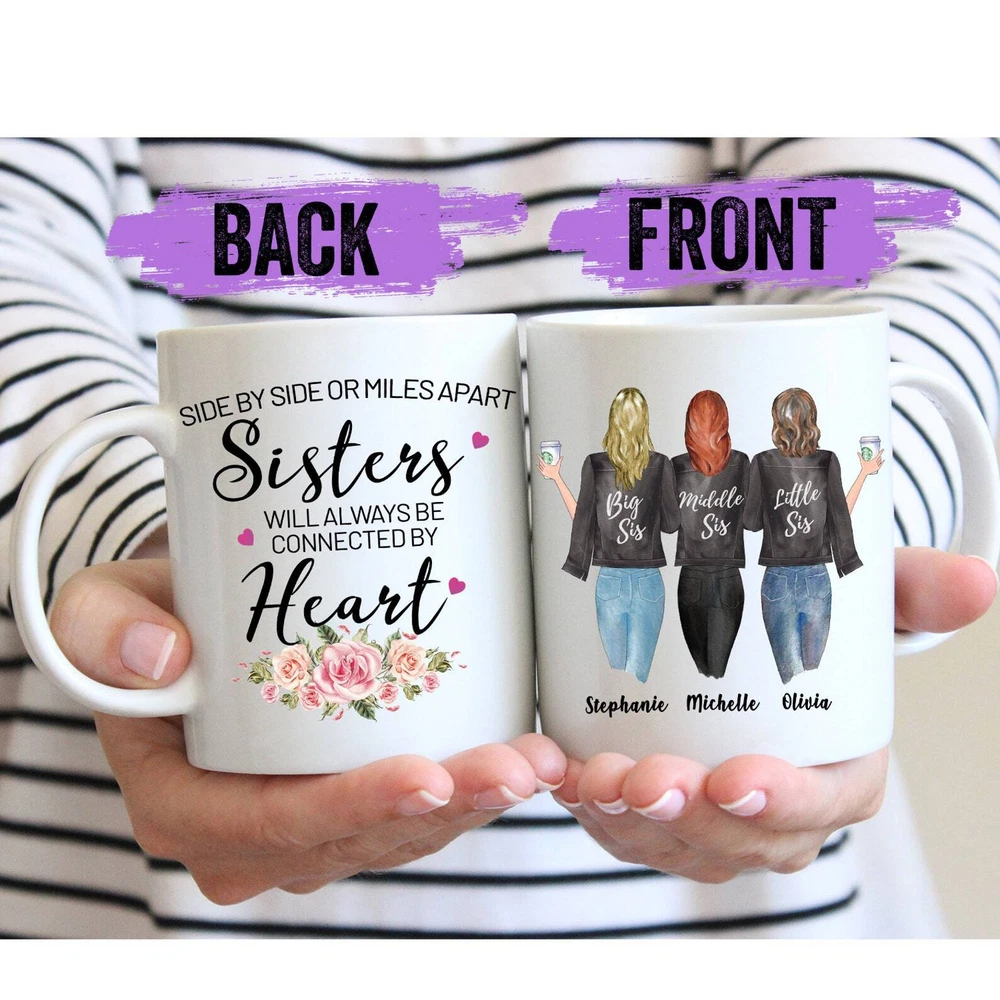 Custom Sisters Mug Best Friends Best Sister Gift Sisters Birthday Gifts Sister Product Details.. This high quality 11oz. ceramic white mug has a premium hard coat that provides crisp and vibrant color reproduction sure to last for years. Perfect for all hot & cold beverages. The highest quality printing possible is used. It will never fade no matter how many times you wash it. Material: 100% Ceramic. Print both sides. Dishwasher and Microwave Safe. High Gloss + Premium White Finish. Printed in the U.S.A. Personalized & Custom. We support personalized and custom mug to add custom, when placing an order, you can add notes to the "order note" in shipping address section. Also you can contact us directly via message. Shipping Info. Ready to ship in 1 to 2 business days, All products are made-to-order and proudly printed in the United States. Shipped by USPS and DHL, You will receive your order in 5-7 days. Replace & Refund. All products are defective during shipping broken, chipped will be replaced free of charge. You are not satisfied with the product, we will refund 100% money to you. If any other issues arise, please do not hesitate to message, we would be more than happy to assist you.