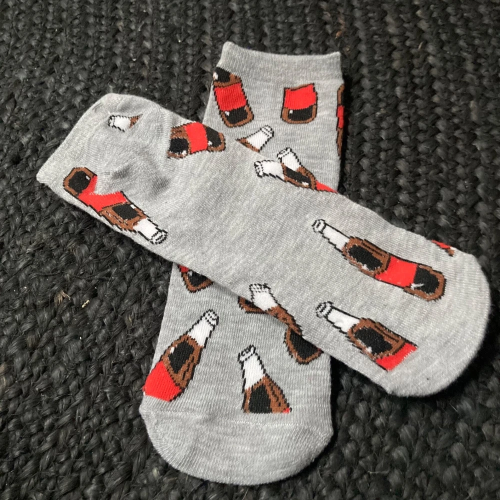 Custom socks designed for men in size 8-12. Ankle length, Low-cut, full-toe socks. Perfect for casual occasions and feature a coke bottle pattern in a multicolor design. Made from a blend of polyester, cotton, and cotton blend materials, they are lightweight, breathable, and moisture-wicking, making them suitable for all seasons. These athletic socks provide support and cushioning, making them ideal for various activities such as running, hiking, gym training, or kicking back with your ice cold soda. Whether you like hipster, quirky, fun, or just plain socks to wear, and these are great for anyone looking for a comfortable and stylish pair. Made in Vietnam. Men’s size 8-12 or Women’s size 10-13. You will have fun adding these to any sock collection. Check out other designs listed.