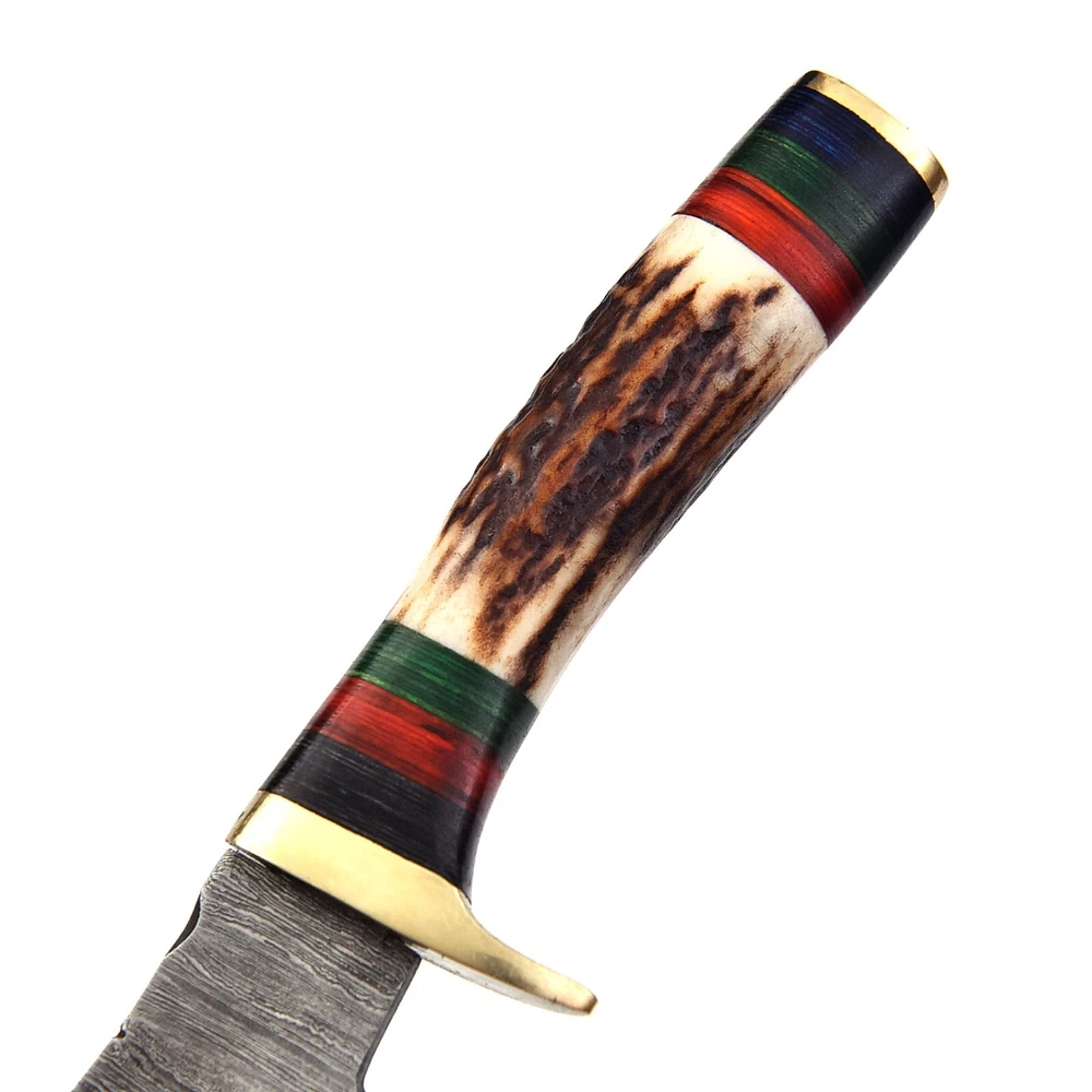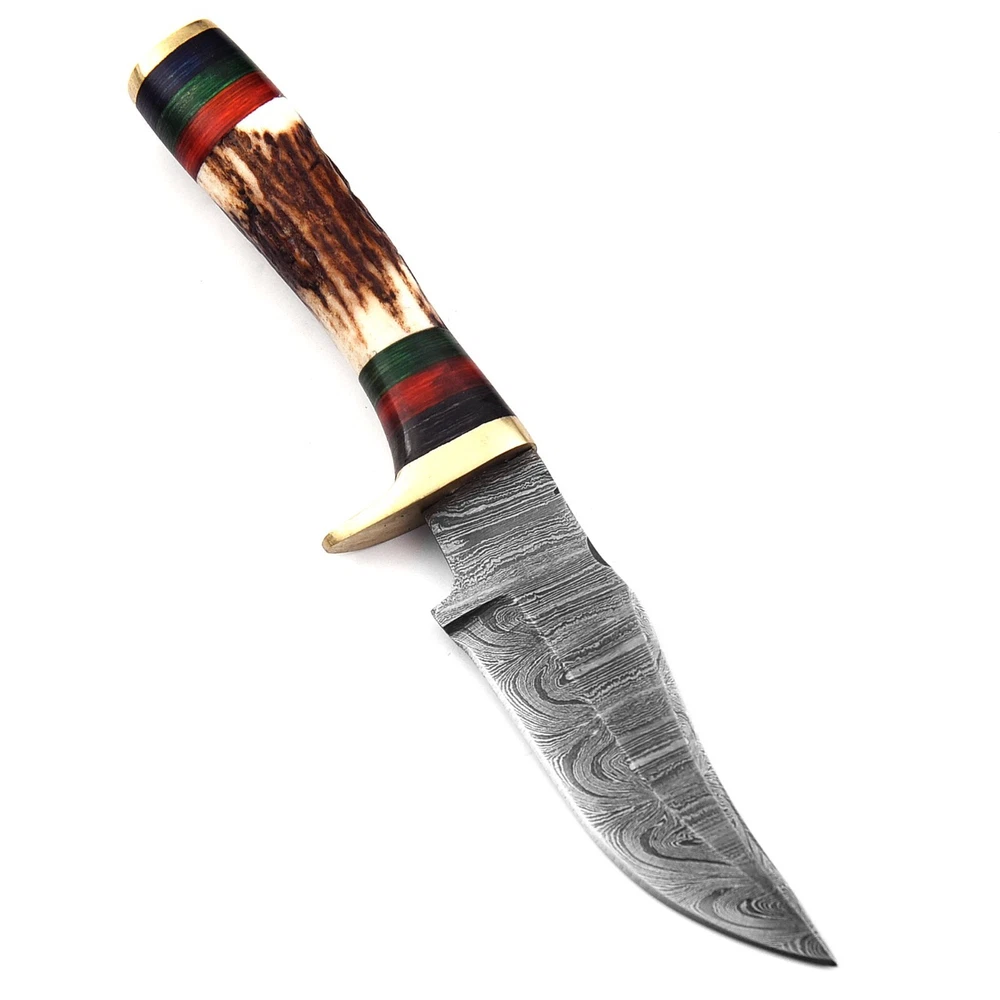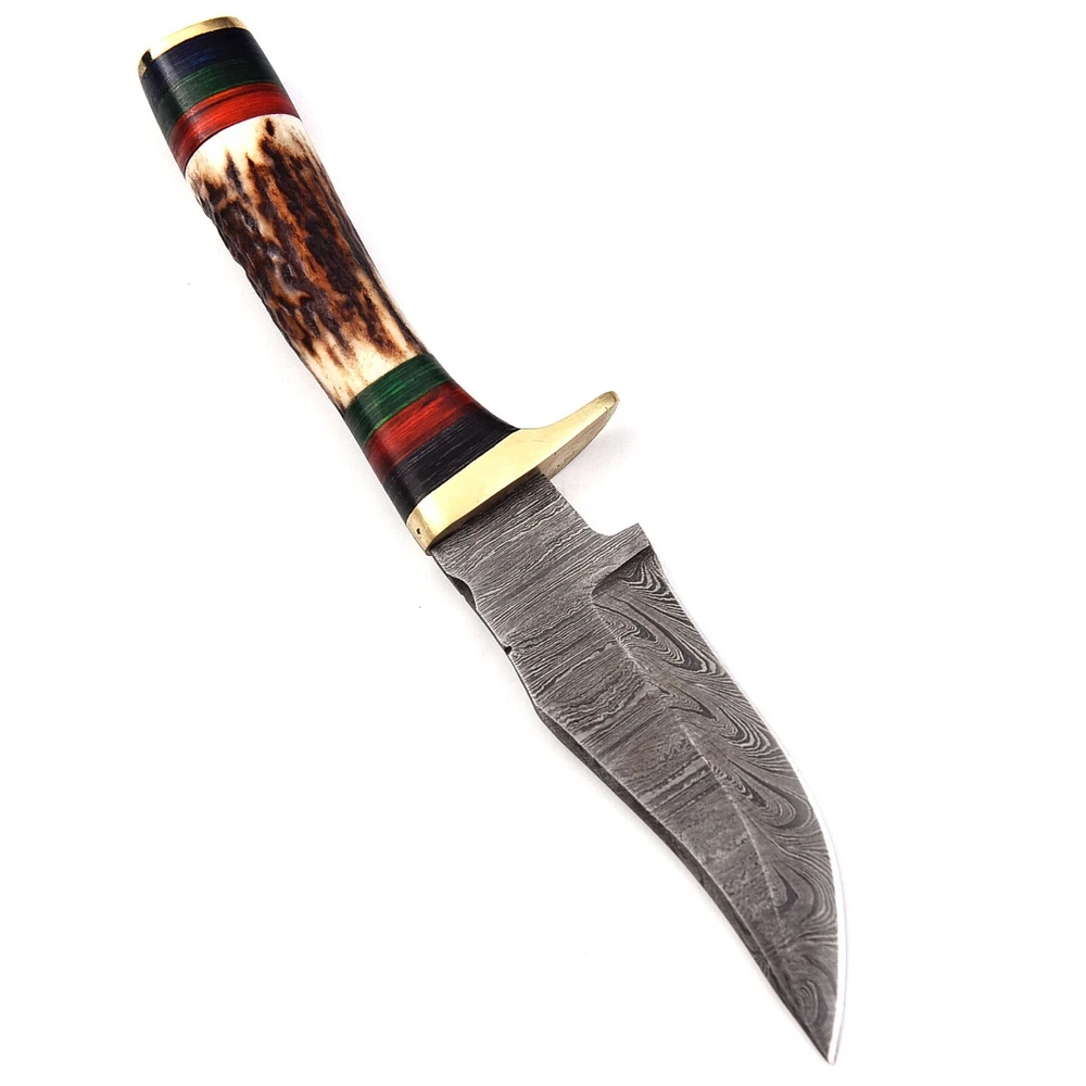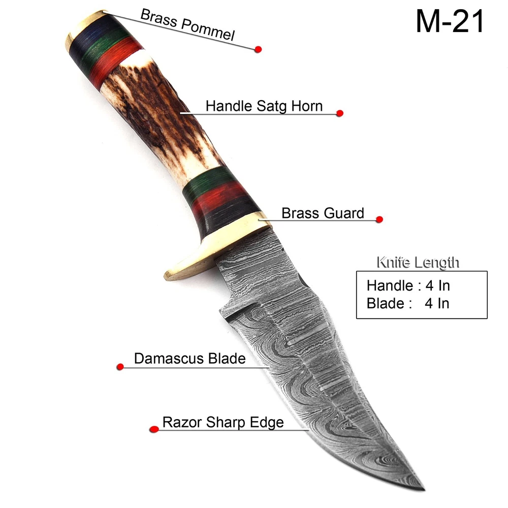 Description: CUSTOM HAND FORGED DAMASCUS STEEL Hunting KNIFE This superb design knife is hand forged. Blade of this knife has a nice file work and is made of 512 layers of stainless steel and high carbon steel with hardness 55-60 HRC. This process takes approximately 48 hours to complete. This robust knife is lab tested under intense conditions, the balance and shape of this knife ensures perfect grip. All our knives are handmade similar to the photo, differences as such as color and patterns of the natural materials used will differ somewhat because these are all natural materials. Every item will be considered as an original because no one item is ever identical to the other, they are handmade and natural materials are never identical. Because they are handmade they may have slight imperfections because they are NEVER MACHINE MADE and this makes it original in its own way. Specifications: Handle Material : Stag Horn + Brass Blade Material : Damascus steel Overall Length : 8 inches Handle Length : 4 inches Blade Length : 4 inches Layers: 512 Sheath: Leather Hardness: 55-58 HRC Package Includes: Knife with Original Leather Sheath AGE RESTRICTION: WE DON'T SELL KNIVES TO ANY ONE WHO IS UNDER AGE 18. WHEN YOU BUY A KNIFE FROM US YOU ARE CONFIRMING THAT YOUR AGE QUALIFIES FOR THIS PURCHASE AND THIS IS A LEGAL PURCHASE. Lift US TAKES NO RESPONSIBILITY FOR ANY ILLEGAL PURCHASE. Care Instructions: Keep the knife dry after each cleaning. Warning: Take care when removing product from packaging. Keep fingers clear of blades. Store away from children. We are not responsible for injuries caused by the use of this item. FEEDBACK POLICY: YOUR FEEDBACK IS VERY IMPORTANT FOR US, IF THEIR IS ANY KIND OF PROBLEM PLEASE GIVE US OPPORTUNITY TO SORT THE ISSUE We do sell wholesale, please contact us for special discounts on bulk orders.