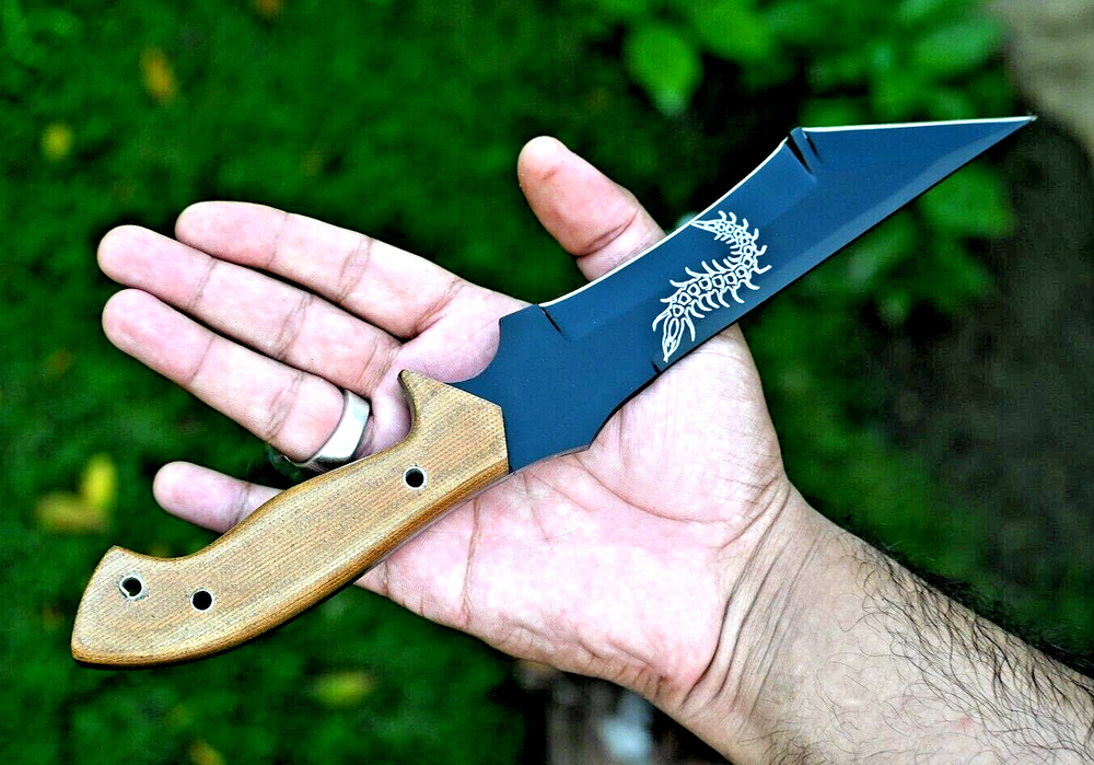 CUSTOM HAND MADE HIGH CARBON STEEL HUNTING KNIFE Micarta Handle This superb design knife is hand forged. Blade of this knife has a nice file work. The balance and shape of this knife ensures perfect grip. Overall Length: 12” Inches Blade Length: 7 ”Inches Handle Length: 5 ”Inches Package Includes: with Leather Sheath Warning: Keep fingers clear of blades. Store away from children.