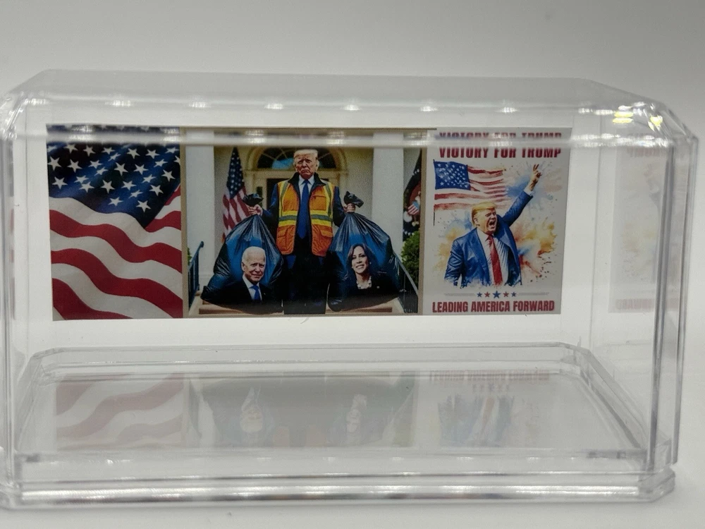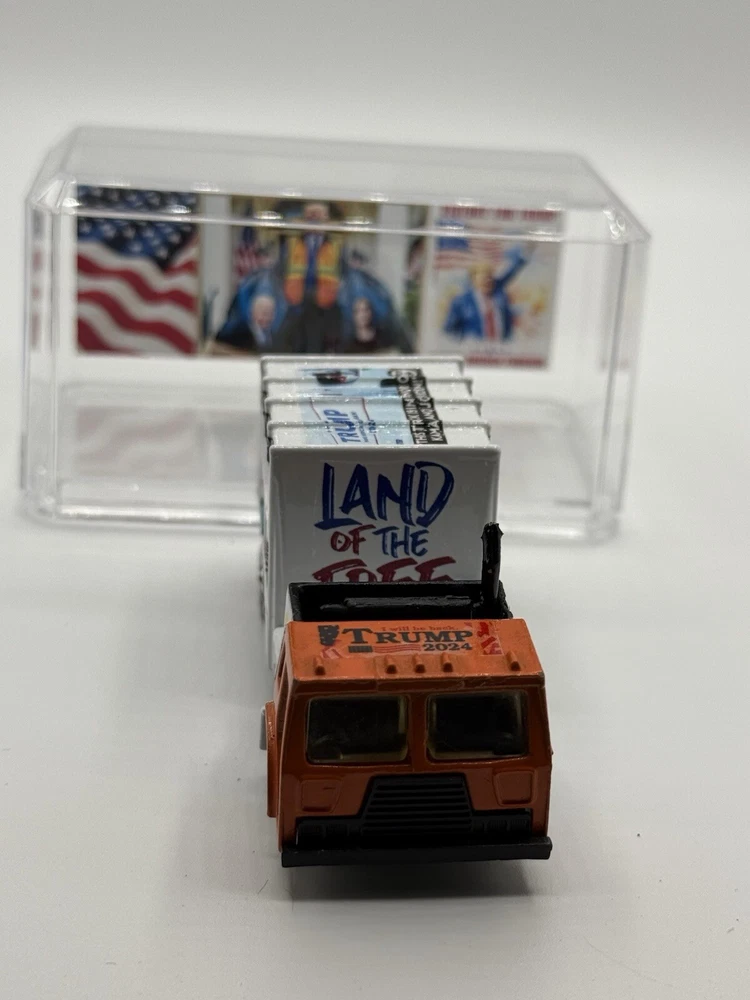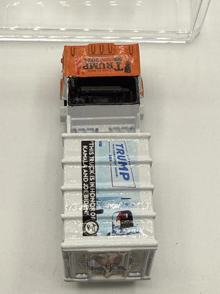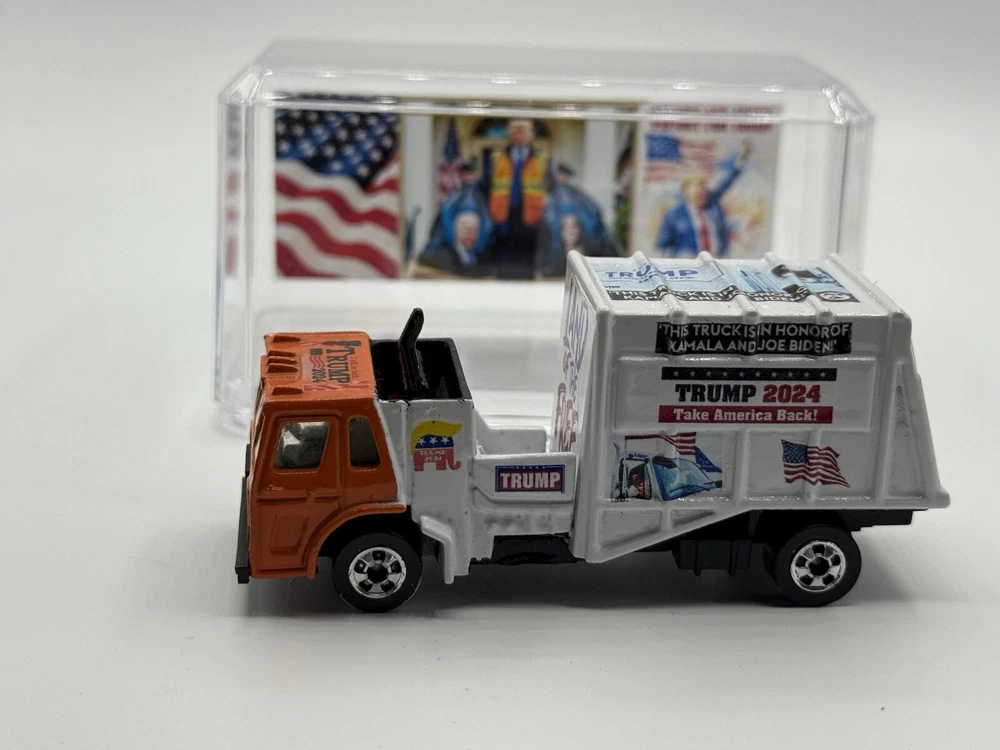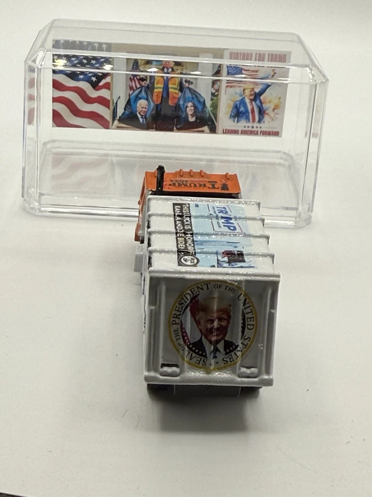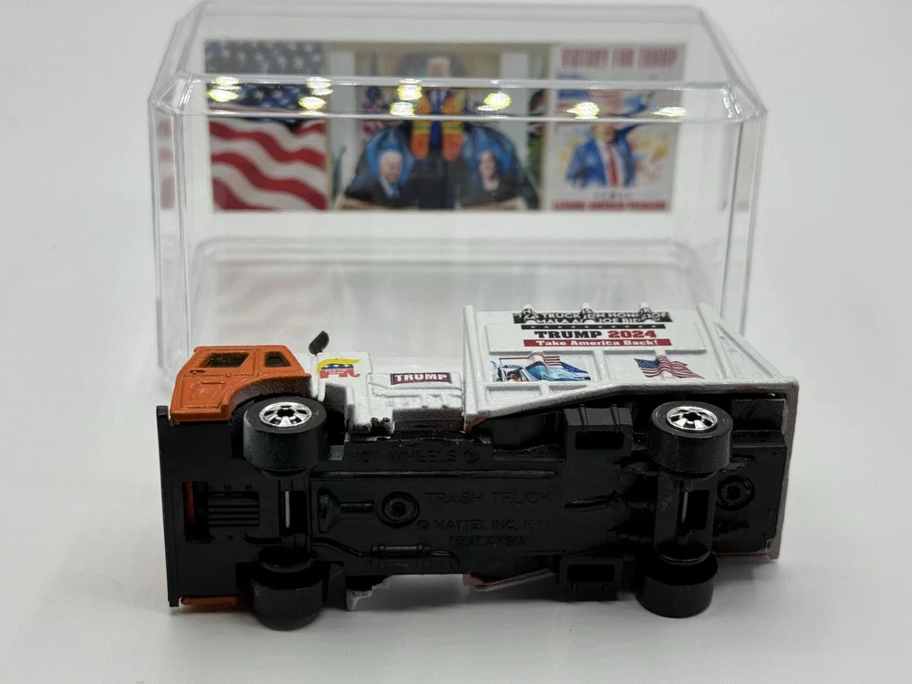 Celebrate the victory of President Donald Trump with this custom Hot Wheels 1982 Trash Truck. The orange diecast vehicle is a 1:64 scale model of the iconic Garbage Truck from the Hot Wheels Hot Trucks series. Comes in acrylic case. This collectible toy is perfect for fans of the President and Hot Wheels alike. Featuring the year of manufacture 1982, this Trash Truck is a must-have for any serious collector. The vehicle type is a classic trucks and vans category, and it is made of high-quality diecast material. Add this unique piece to your collection today and show off your love for both Hot Wheels and President Donald Trump.