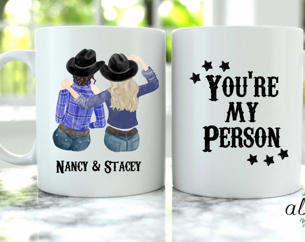 Custom Western Best Friend Mug Pick Your Hair Color Etc Personalized Coffee Mug Custom Cowboy Mug Best Friend Gift Cowgirl Gift Idea Product Details.. This high quality 11oz. ceramic white mug has a premium hard coat that provides crisp and vibrant color reproduction sure to last for years. Perfect for all hot & cold beverages. The highest quality printing possible is used. It will never fade no matter how many times you wash it. Material: 100% Ceramic. Print both sides. Dishwasher and Microwave Safe. High Gloss + Premium White Finish. Printed in the U.S.A. Personalized & Custom. We support personalized and custom mug to add custom, when placing an order, you can add notes to the "order note" in shipping address section. Also you can contact us directly via message. Shipping Info. Ready to ship in 1 to 2 business days, All products are made-to-order and proudly printed in the United States. Shipped by USPS and DHL, You will receive your order in 5-7 days. Replace & Refund. All products are defective during shipping broken, chipped will be replaced free of charge. You are not satisfied with the product, we will refund 100% money to you. If any other issues arise, please do not hesitate to message, we would be more than happy to assist you.