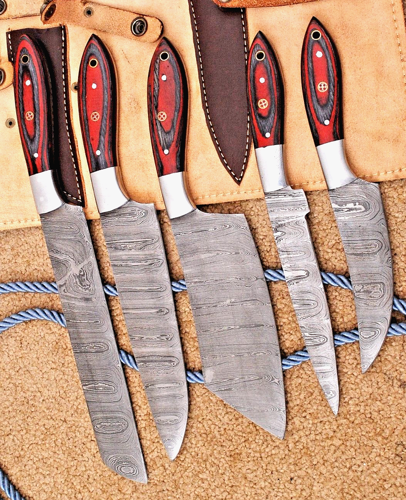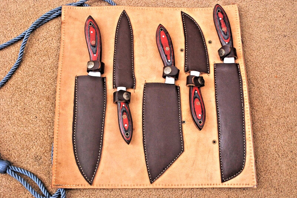 Handle Material: Wood Blade Length: 8 in Personalize: No MPN: N/A Material: Damascus Steel Blade Edge: Straight Food Compatibility: Fruit, Meat, Salad, Universal, Vegetables Number of Items in Set: 5 Making Method: Compressor Brand: Handmade Features: leather sheath Set Includes: Bread Knife, Butcher Knife, Carving & Slicing Knives, Chef's Knife, Cleaver, Knife Set, Slicer, Steak Knife, Utility Knife, Fork Type: Chef's Knife Color: Brown