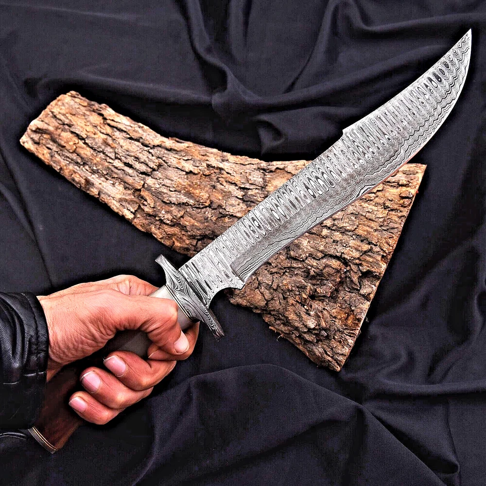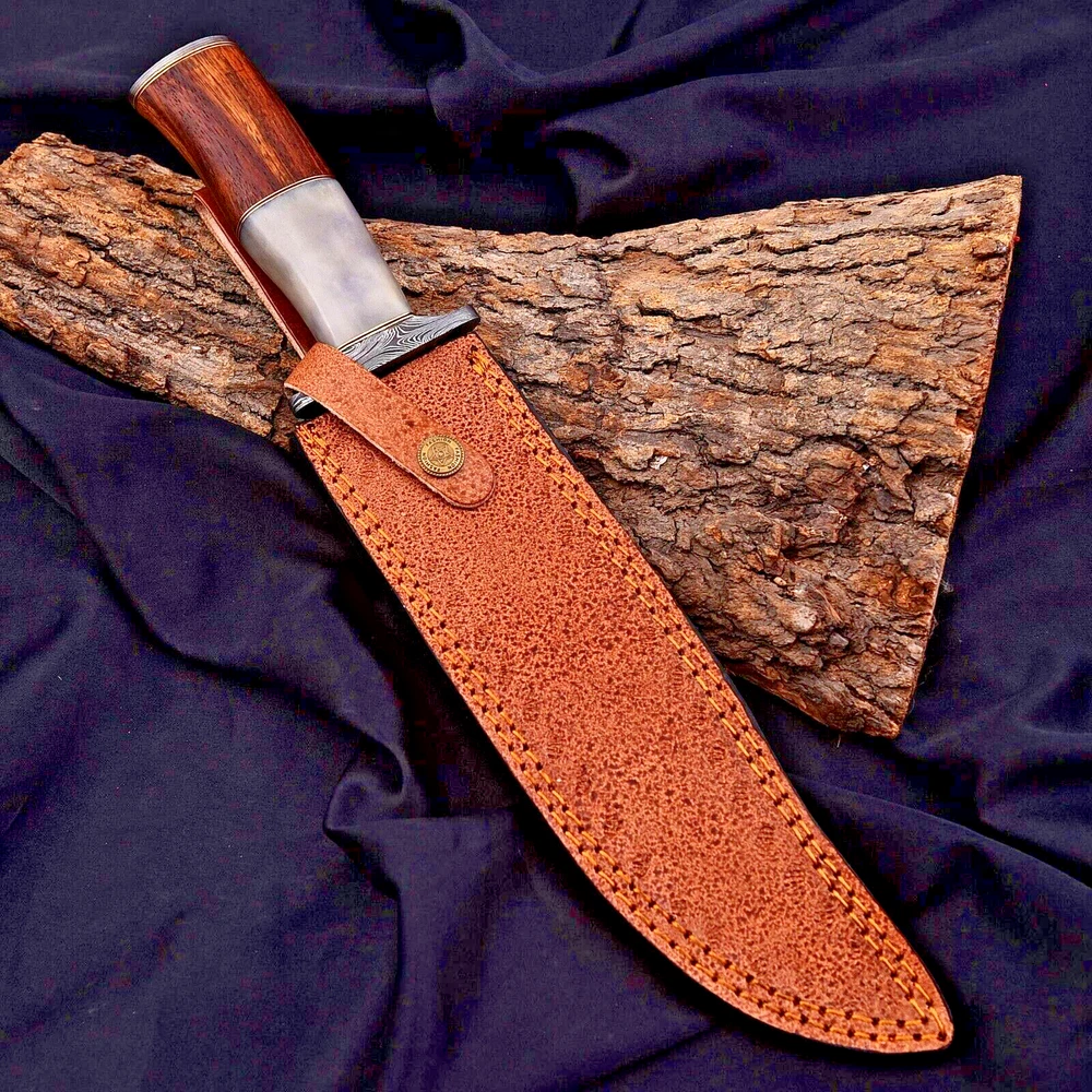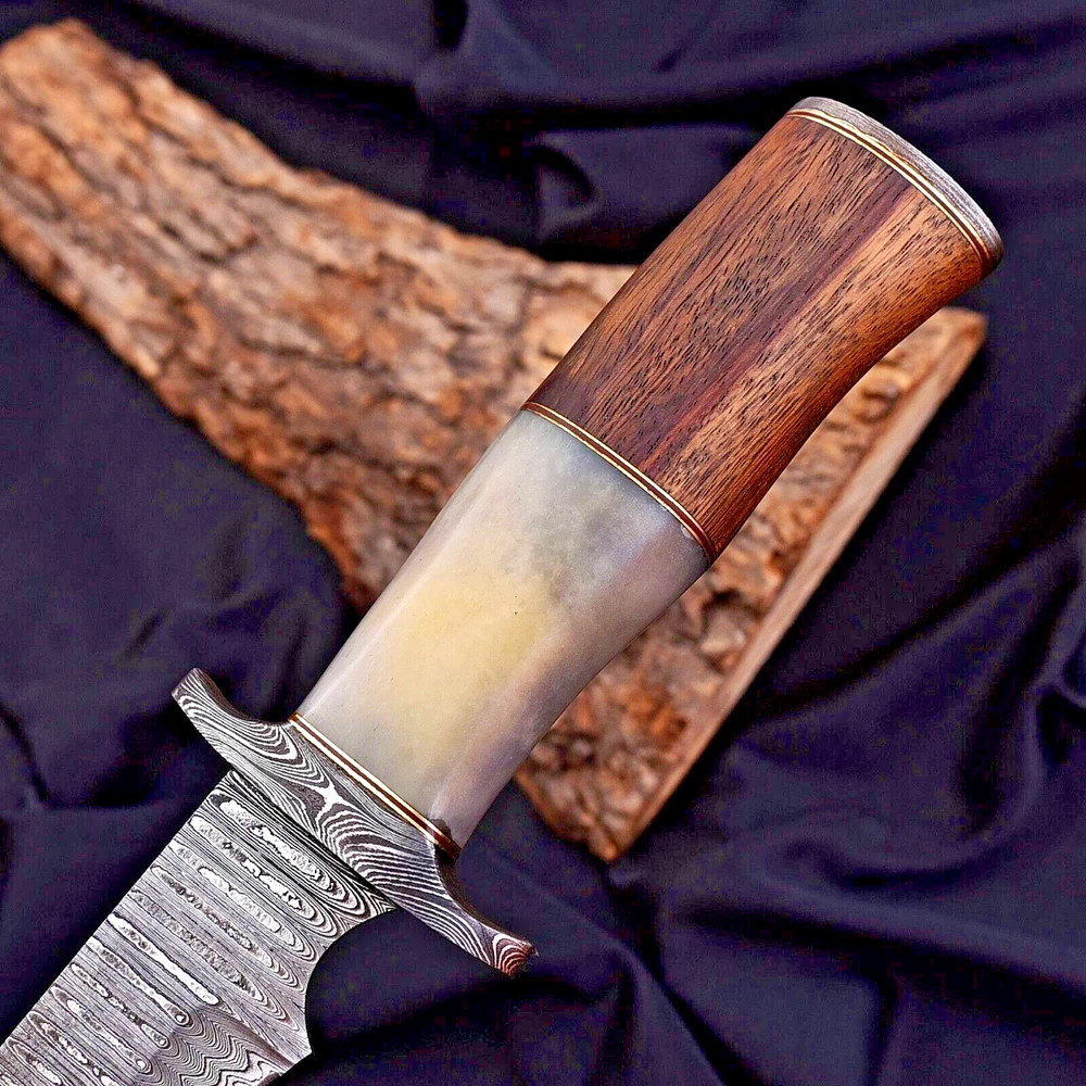 CUSTOM HAND MADE HAND FORGED DAMASCUS STEEL BOWIE HUNTING KNIFE SURVIVAL CAMPING HIKING BUSHCRAFT CAMEL BONE & WOOD WITH DAMASCUS STEEL GUARD HANDLE This superb design knife is hand forged. Blade of this knife has a nice file work and is made of 512 layers of 4340 stainless steel and 1075 high carbon steel and hardness 55-58 HRC . This robust knife is lab tested under intense conditions, the balance and shape of this knife ensures perfect grip. Overall Length: 15" Inches Blade Length: 10" Inches Handle Length: 5" Inches Damascus Design: Ladder Pattern Layers: 512 Sheath: Leather Hardness: 55-58 HRC Package Includes: with Leather Sheath Warning: Keep fingers clear of blades. Store away from children.