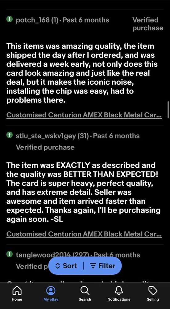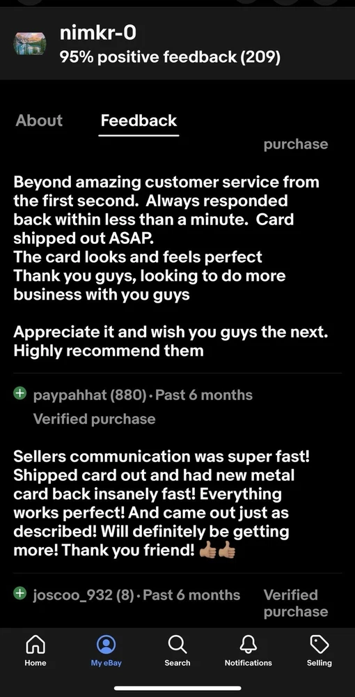 Condition is New. Shipped with USPS Ground Advantage. Fully Customisable Laser Engraved Fists smaller EMV Chips, The images Show Larger EMV Chip but the cards available fit smaller size EMV Chips NOTE: This is just a collector metal card! To make it work you need to remove chip from your card and stick it onto this card and you can also program Magnetic strip. (We Offer To Convert Cards Also That Service is $145 Including the card Customisation and conversion) It's 304 stainless steel materials, not Alloy. It's collect card, not real! Weight:26g Size: 85.5*54mm Thickness : 0.8mm Materials:304 stainless steel The content area is customizable : You can modify Card surface as below information: Please send us the info after you order b) Card Number(16-digits) c) Member Since (2 digits) d) Valid Thru: xx / xx e) Holder name (not more than 18 letters) f) CVV (3 digits) g) Big chip or small chip (select as per your card's chip size. If you need for collection purpose then select any) h) Glued the Chip - Yes or No (Yes, incase you need this for collection purpose only) The Card Number, Valid thru (expire date), Member since, card holder name is customizable, Please leave us a message about your requirements. Items ready to Ship With No Customization Required Will Be Shipped Within Same Or Next Day. Item Requiring Customization will Be Shipped Within 1-3 Days. Items Requiring Buyer To Ship Their Own Product for Customization Conversion Will Be Shipped Same Day We Receive Buyers Product In Mail