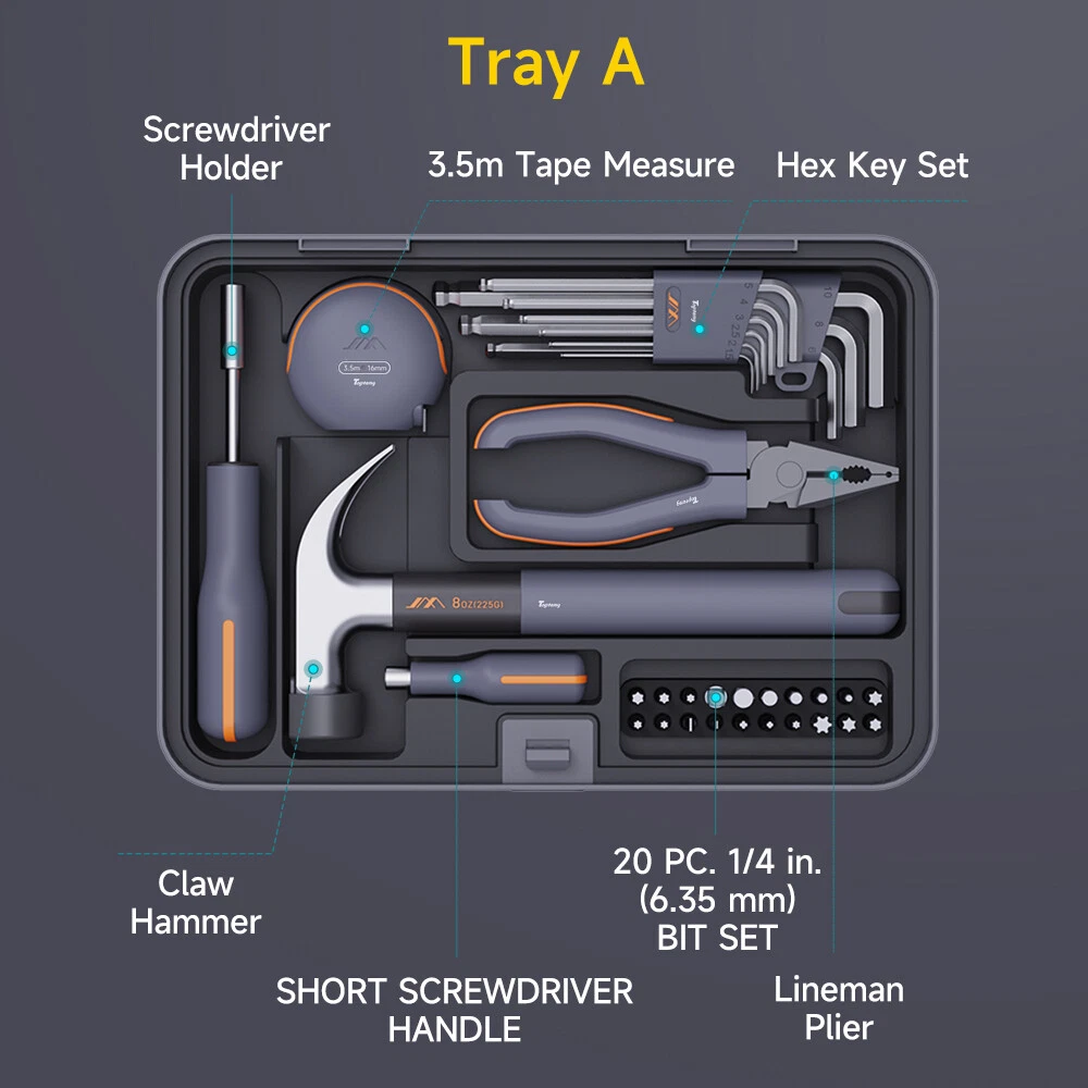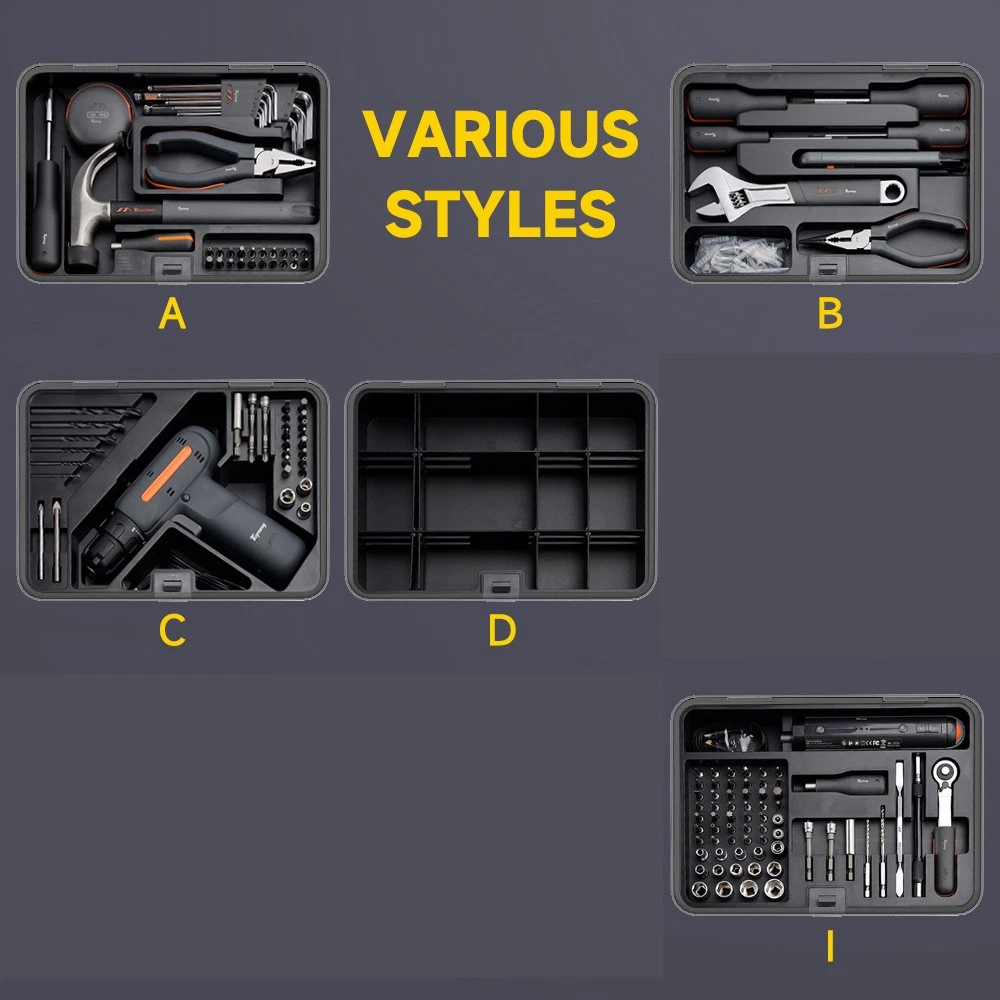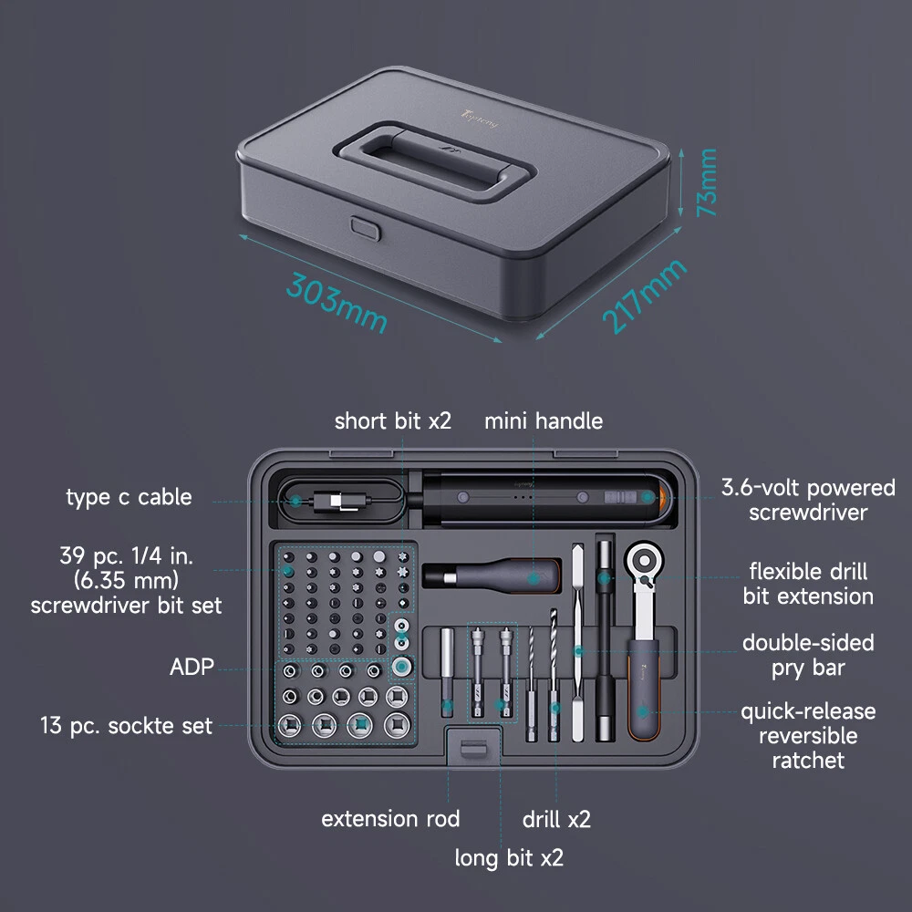 【FULL FUNCTIONAL MULTI-TOOL KIT】 This 3.6V electric screwdriver tool kit comes with 36 S2 screwdriver bits, 2 magnetic nut screwdriver bits, 2 long screwdriver bits, 6 different sizes of hexagonal drills (Φ2.5mm and Φ3.5mm), as well as 10 commonly used sockets (10mm, 9mm, 13mm, etc.) and more, which can satisfy different home repairs, automotive maintenance and DIY project needs. 【 Free combination】The Modular Toolbox System features 8 customizable compartments—including dedicated layers for screwdrivers, electrical work, woodworking, kitchen maintenance, network repairs, and an expandable storage module—allowing you to purchase and assemble only the components you need to build your personalized toolkit. 【PROFESSIONAL DRILLING & FASTENING TOOLS】 Several types of drill and screwdriver bits are included in the kit to ensure that it can be adapted to different materials and fastening needs. Including hexagonal drill bits for wood, metal, PVC and other materials, as well as precise magnetic screwdriver bits. In addition, the equipped metal pry bar can help users easily pry open various fasteners. 【 Humanized Design and Convenient Storage】All tools are designed with ergonomic handles, which provide a comfortable grip no matter for long time use or delicate operation. The tool kit is equipped with a delicate storage box, and each tool can be neatly placed in the designated location, the storage box is equipped with adjustable dividers, users can according to the size of different tools for reasonable separation, easy to find and organize. 【 Exquisite Gift Options and High Color Value】 It is not only highly practical, but also has a modern, simple and generous appearance design, which is perfectly suited as a gift for holidays, birthdays or Father's Day. The kit can meet your daily maintenance needs and also serve as an ideal gift for your friends, family, or loved ones. -About US Founded in 2012, VIPJQ have professional development and sales, and are involved in various products, providing customers with various high-quality products. Since its establishment, VIPJQ has always adhered to the service concept of "customer first" and the management concept of "pursuit of quality", and is committed to providing customers with high-quality original designs. We commit to provide you the best innovative, quality products & professional services with competitive prices. We value every customer, and we look forward to providing solutions for your business needs to help your business achieve its goals, please contact us immediately! We are all about you! We are a Japanese seller,but with large warehouse in USA. We are profesional on Auto Parts,Car Parts,Motorcycle Parts,3C,other hot sale items and so on. We aim to provide to customers high quality product and best service. -About Shipment&Returns The item usually will be dispatched within 3 days after you ordered.All are free shipping. And it usually takes 3-5 working days to delivery depends on buyers' address or other majeure on the way. If you are not satisfied with the items and want to return the item,we hope you could message us first,we will give you the return details, we think we could give you the best service to save your time and money.Thank you. -About Feedback&Customer Service If you are enjoy your shopping here,not only enjoy the items but also the service,we are appreciate you could give us a 5-star feedback. If you are not satisfied with the item,before you give us the negative feedback,we hope we could give you the best solution through our commutication. We think we could do it if you give us the chance.Thank you.